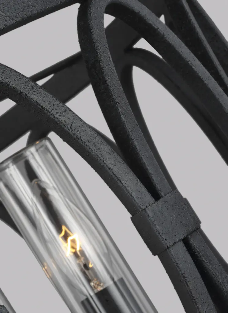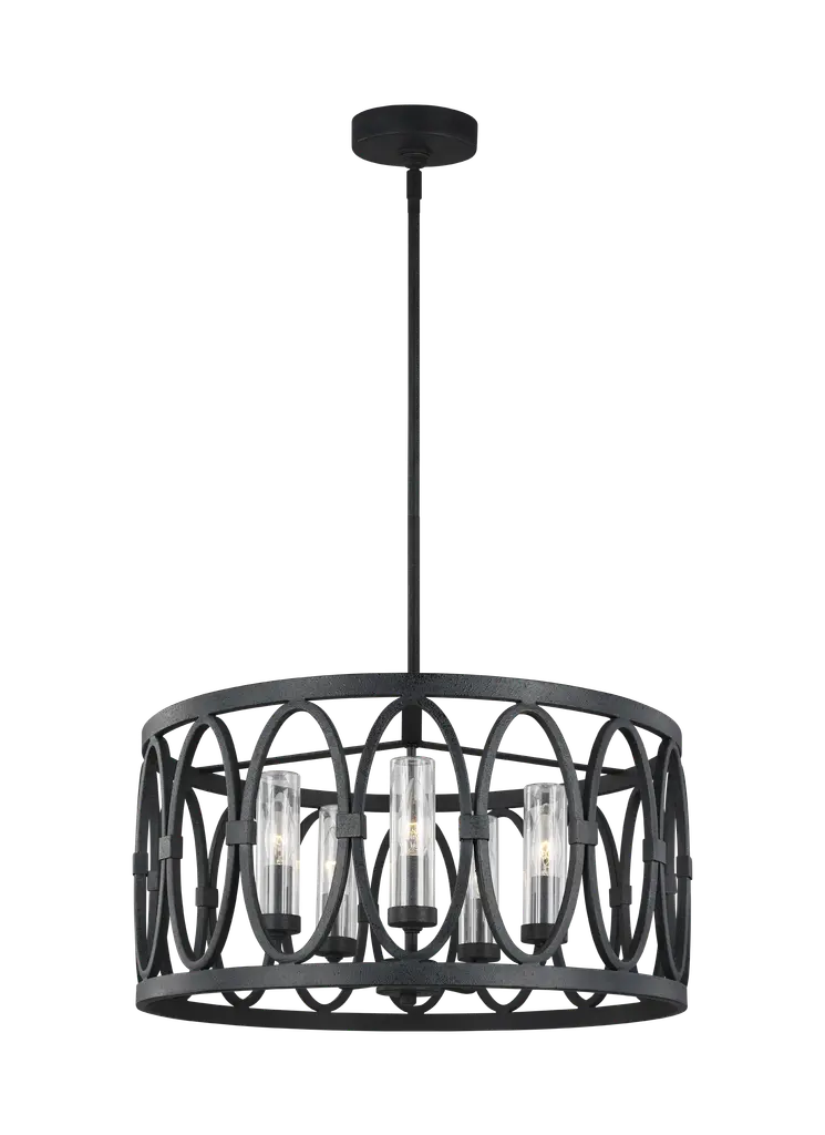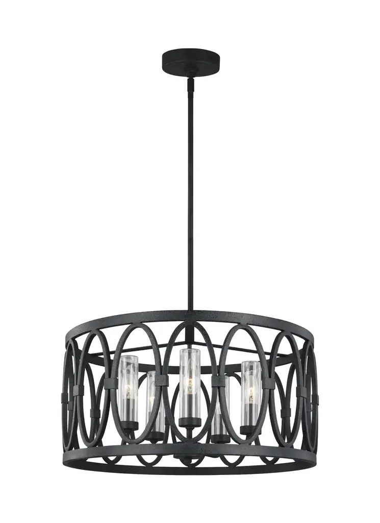 The Patrice five light outdoor chandeliers in dark weathered zinc creates a warm and inviting welcome presentation for your home's exterior. Patrice showcases Feiss' Collection's unwavering commitment to robust construction and craftsmanship. Using our NEW Deep Abyss finish, Patrice is heavily textured and tactile, appearing as though it was pulled from a shipwreck. This humble design with its oval motifs is fitting for a wide range of decor. Patrice also features three outdoor fixtures with a rustic Dark Weathered Zinc finish. The outdoor chandeliers include glass candle covers to protect the lamping. All Patrice chandeliers are damp-rated for use in indoor and covered outdoor spaces. Designer: Sean Lavin Max Height: 68.25 Canopy: D:5'' H:1 1/8'' Round Shade/Glass: clear glass shades Lamping: 5 Torpedo Candelabra 60 watt light bulbs Voltage: 120 Bulb Included: No Safety Rating Location: damp
