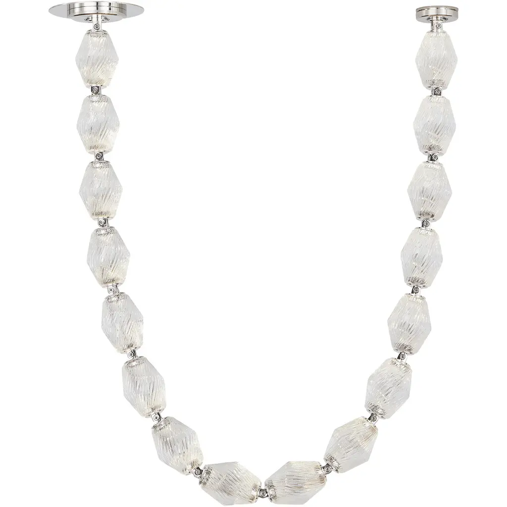 The Collier by Sean Lavin exudes luxury and sophistication. Solid faceted crystal fully encapsulates integrated LED modules interlocked by solid brass connectors. Available in multiple length strands for the ultimate in customization. Creates an incredible light sculpture with stunning illumination. The Collier features solid faceted crystal manufactured in the Czech Republic. The natural brass connectors are custom engineered to support the crystal and add additional beauty to the piece. Available with remote or surface mounted driver options. Predetermined length options allow for easy ordering with virtually unlimited versatility. Contact factory for custom configurations. Patent pending.