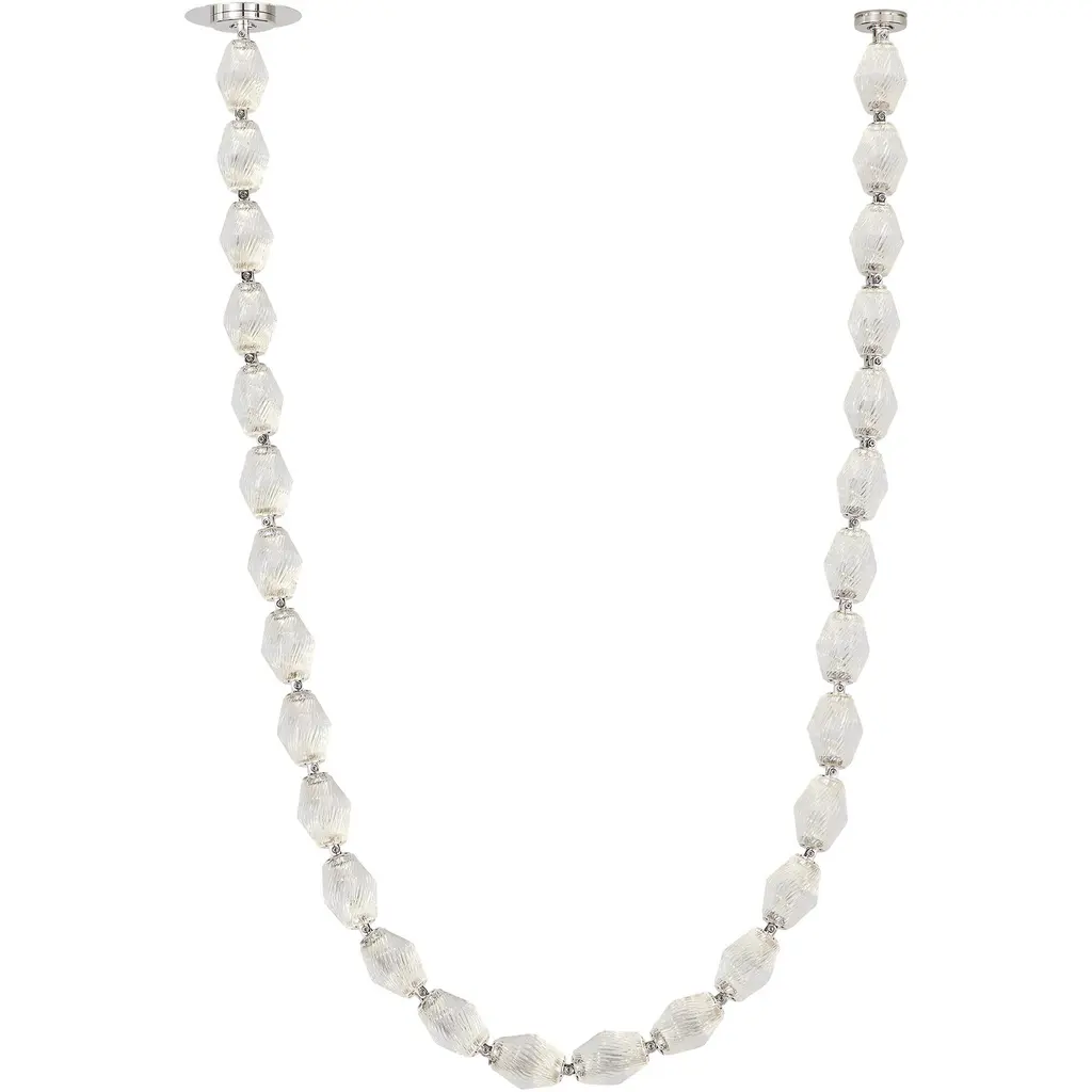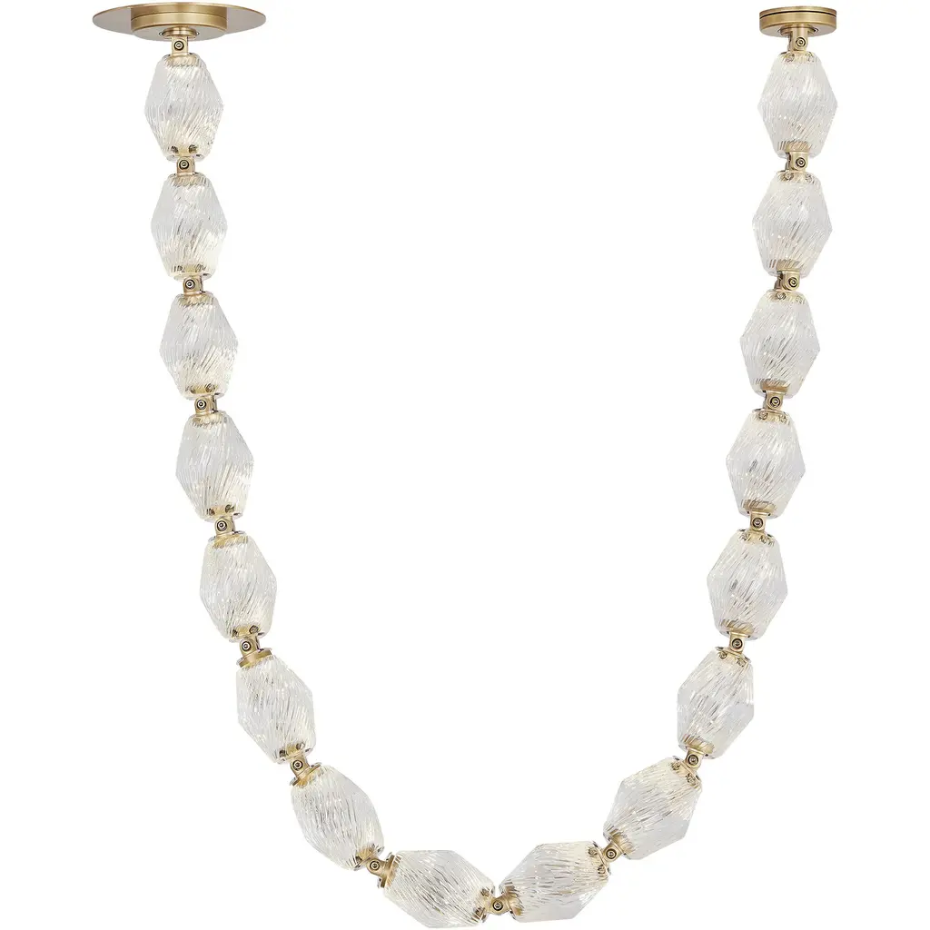 The Collier by Sean Lavin exudes luxury and sophistication. Solid faceted crystal fully encapsulates integrated LED modules interlocked by solid brass connectors. Available in multiple length strands for the ultimate in customization. Creates an incredible light sculpture with stunning illumination. The Collier features solid faceted crystal manufactured in the Czech Republic. The natural brass connectors are custom engineered to support the crystal and add additional beauty to the piece. Available with remote or surface mounted driver options. Predetermined length options allow for easy ordering with virtually unlimited versatility. Contact factory for custom configurations. Patent pending.
