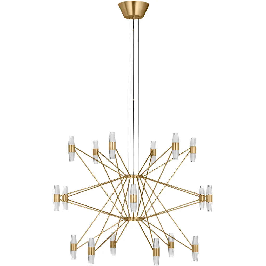 The Lassell series by Sean Lavin is delicate with a touch of mountain lux style, making it a great focal point in modern and contemporary spaces. Oversized in scale, blown glass, and metal hardware, Lassell represents modern, minimalist lighting in its purest form. Delicate natural brass arms come from the central hub to the laser-etched crystal tubes. Ideal for lighting a dining room table, kitchen island, or conference room table. Complementary pendant lights and wall sconce light are also available. The multitude of canopy options ship with the cable attached, which can be easily cut in the field to size for the ultimate versatility. The pendants feature a quick-connect simplifying installation. Optional spacers and pendant accessories facilitate unique geometries while adding depth and dimension to this stunning collection.