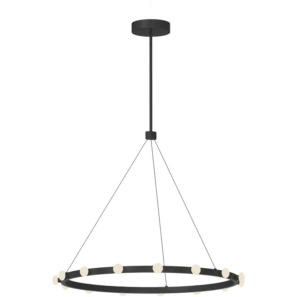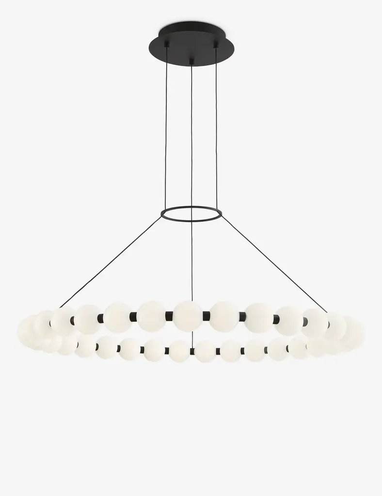 The Orbet 36 Chandelier by Sean Lavin is a modern upgrade to the classic ring design. Milk-glass orbs provide a soft diffused aesthetic for the integrated LEDs and are accented with metal spacers for a touch of contrast. This fixture is the perfect design for dining room, foyers, hospitality and more.