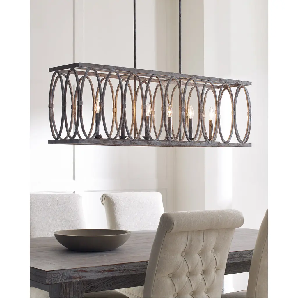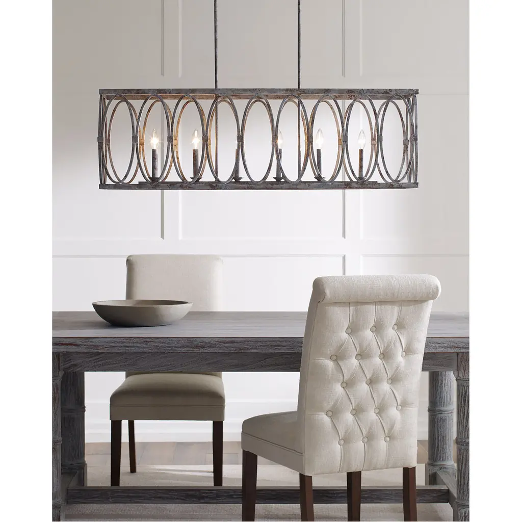 The Patrice six light billiard island chandelier in deep abyss provides abundant light to your home, while adding style and interest. Patrice showcases Feiss' Collection's unwavering commitment to robust construction and craftsmanship. Using our NEW Deep Abyss finish, Patrice is heavily textured and tactile, appearing as though it was pulled from a shipwreck. This humble design with its oval motifs is fitting for a wide range of decor. Patrice also features three outdoor fixtures with a rustic Dark Weathered Zinc finish. The outdoor chandeliers include glass candle covers to protect the lamping. All Patrice chandeliers are damp-rated for use in indoor and covered outdoor spaces.