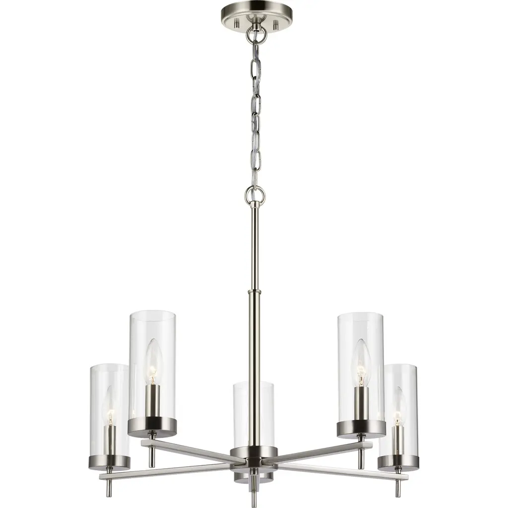 The Zire three light single tier chandelier in brushed nickel uses LED bulbs to save you both time and money. Zire embodies simple clean lines in three finishes that strike a perfect balance of elegant yet minimalist design. Each of the lights sits on the round bottom rim, featuring an Edison-inspired design highlighted by a cylindrical glass shade. The assortment includes nine-light, five-light, and three-light chandeliers, a five light linear, one-light mini-pendant and one-light, two-light, three-light and four-light wall/bath fixtures. A stylish and elegant addition to any room in the house. Zire is offered in a Brushed Oil Rubbed Bronze, Brushed Nickel, Chrome, Satin Brass or Midnight Black finish.
