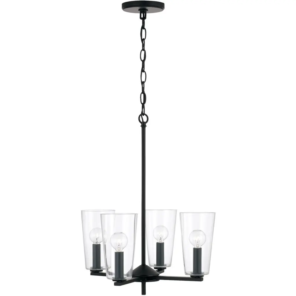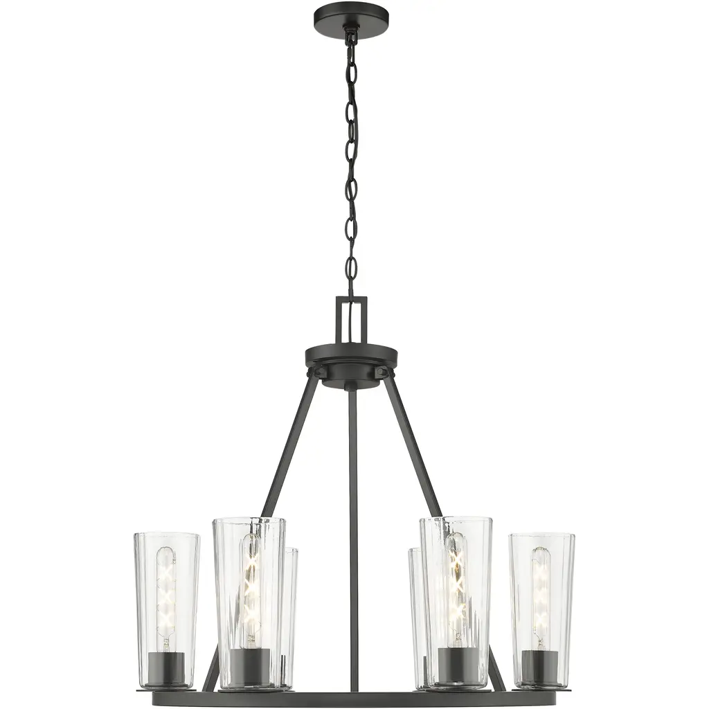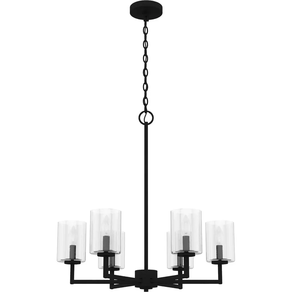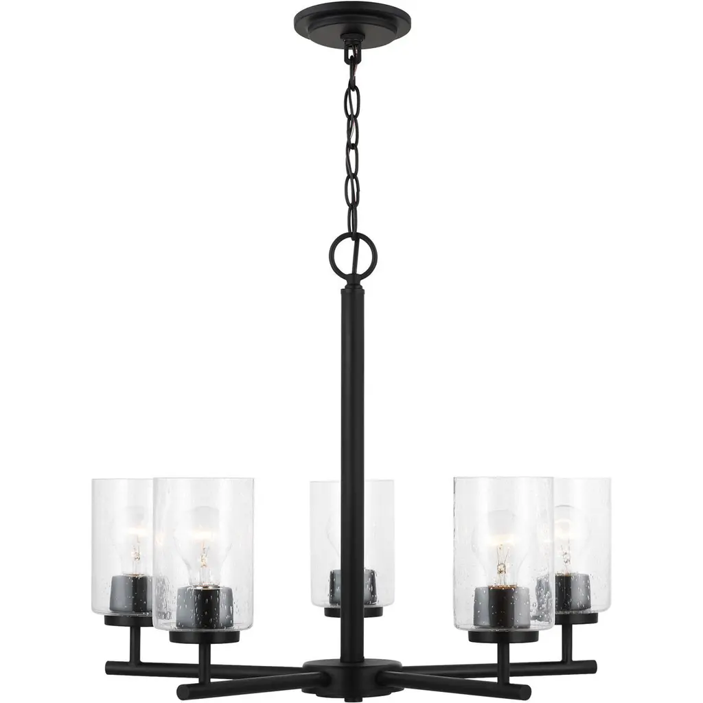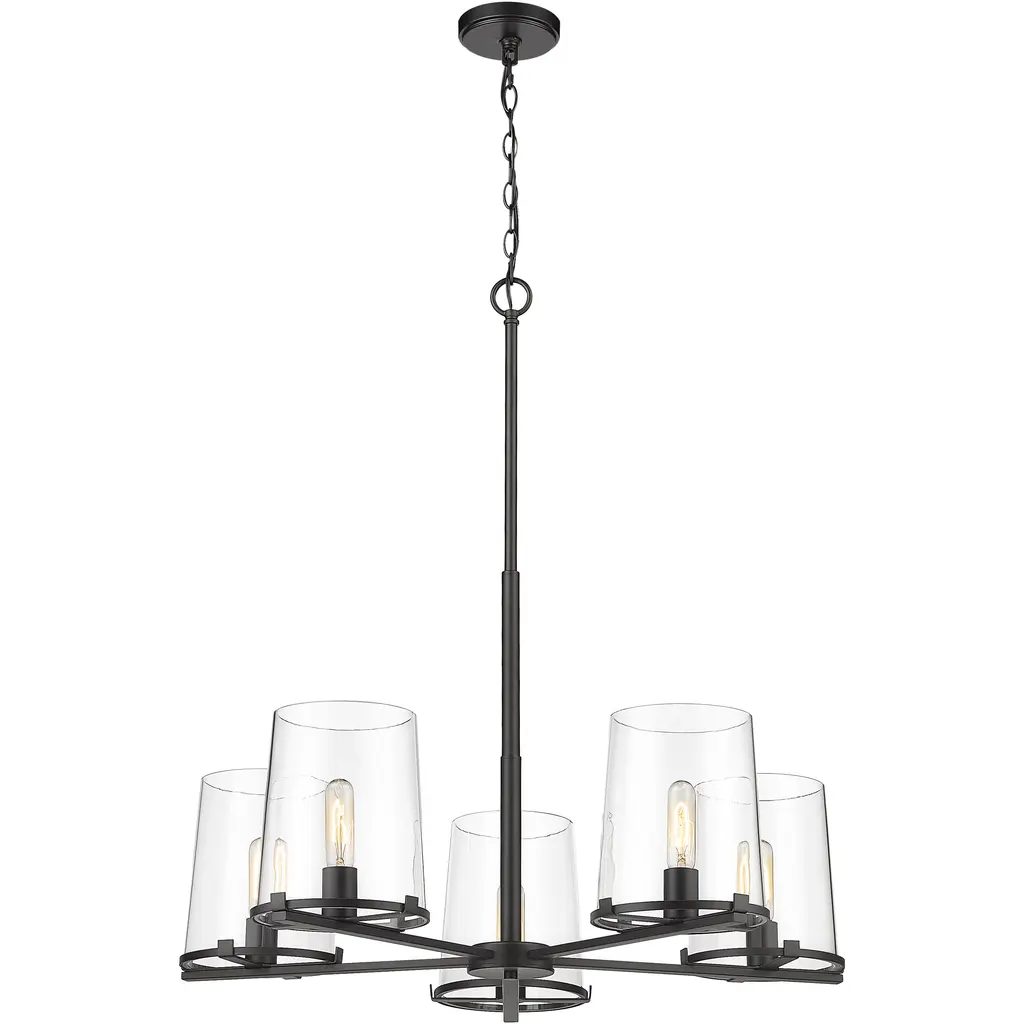 The Zire five light chandelier in Midnight Black finish embodies simple clean lines that strike a perfect balance of elegant yet minimalist design. Each of the lights sits on the round bottom rim, featuring an Edison-inspired design highlighted by a cylindrical glass shade. The assortment includes nine-light, five-light, and three-light chandeliers, a five light linear, one-light large and mini-pendants, and one-light, two-light, three-light and four-light wall/bath fixtures. A stylish and elegant addition to any room in the house. Zire is offered in a Brushed Oil Rubbed Bronze, Brushed Nickel, Chrome, Satin Brass or Midnight Black finishes.