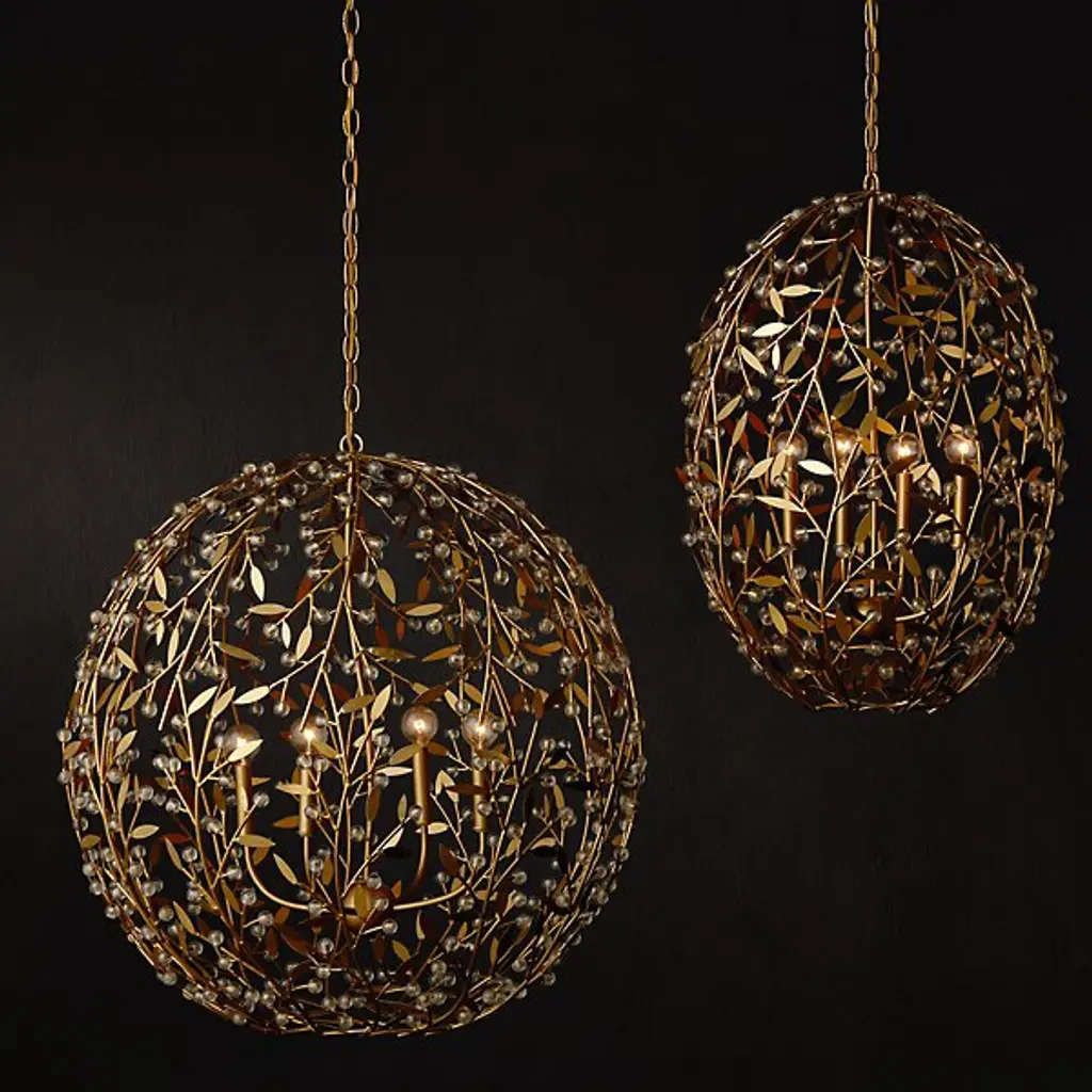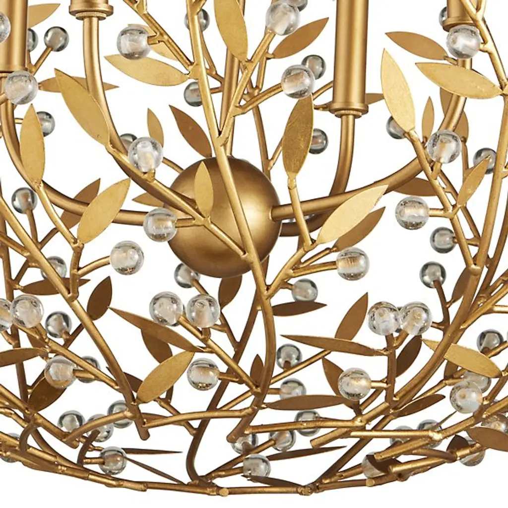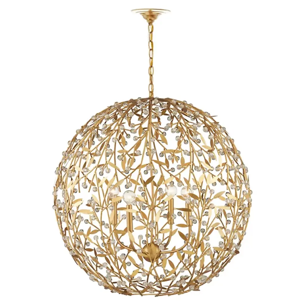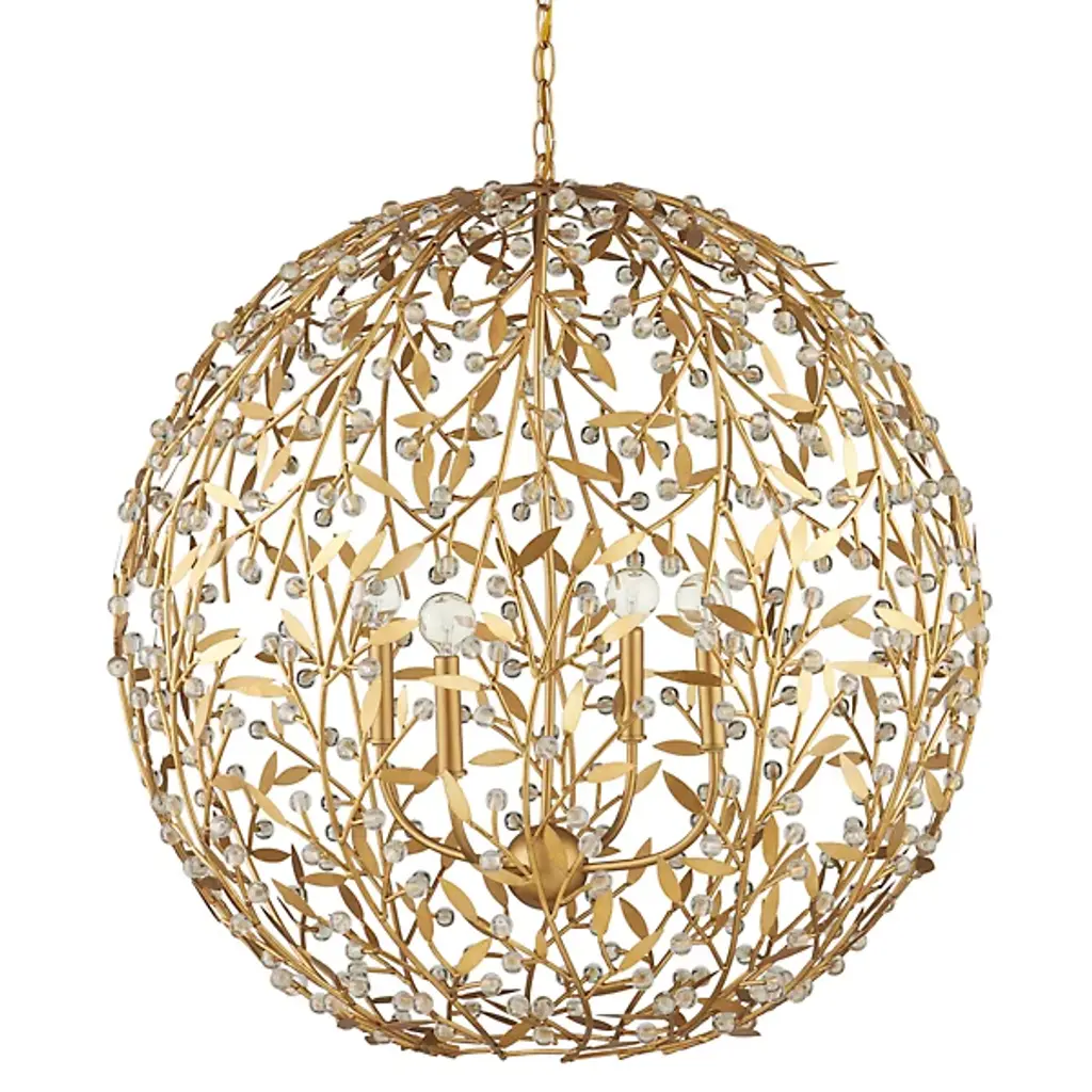 The Secret Garden Orb Chandelier from Currey & Company forms a spherical framework from delicate wrought iron stems that curve and intersect throughout the globe. Tiny leaves and crystal beads scatter along the metalwork. Hand-applied details catch light and create sparkle across the fixture's surface, while the organic branching pattern mimics natural growth. This biophilic design brings nature-inspired elements indoors through its botanical motifs and crystal accents. The spherical form works well in spaces where a centered lighting approach complements surrounding furnishings and architectural elements.