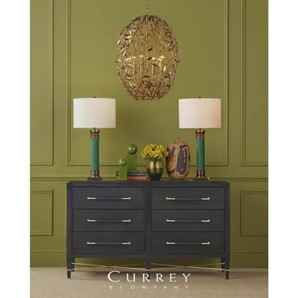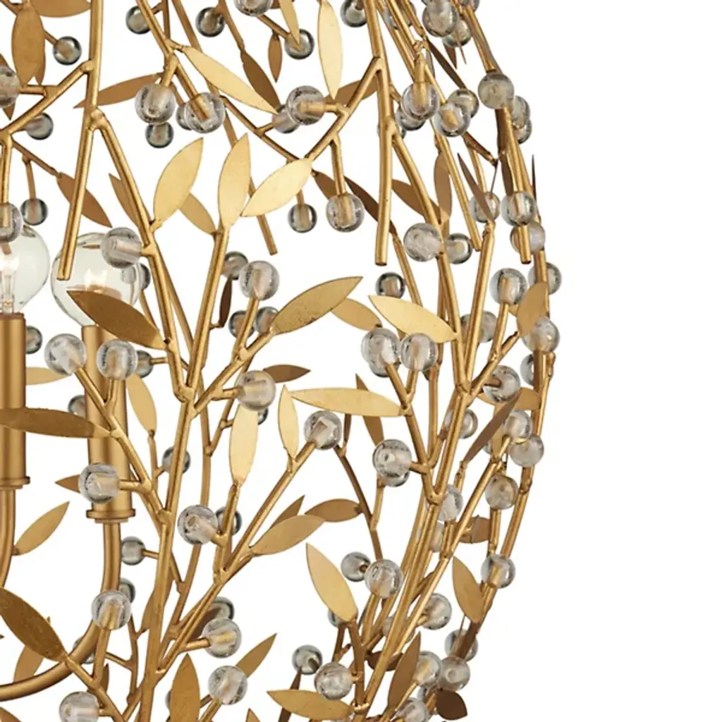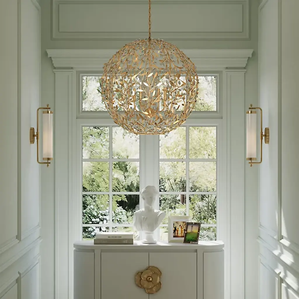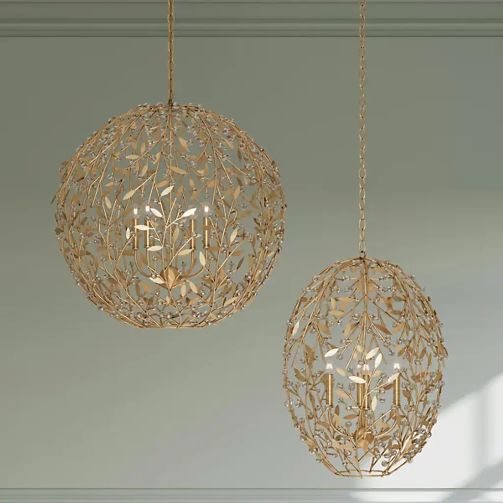 The Secret Garden Orb Chandelier from Currey & Company forms a spherical framework from delicate wrought iron stems that curve and intersect throughout the globe. Tiny leaves and crystal beads scatter along the metalwork. Hand-applied details catch light and create sparkle across the fixture's surface, while the organic branching pattern mimics natural growth. This biophilic design brings nature-inspired elements indoors through its botanical motifs and crystal accents. The spherical form works well in spaces where a centered lighting approach complements surrounding furnishings and architectural elements.