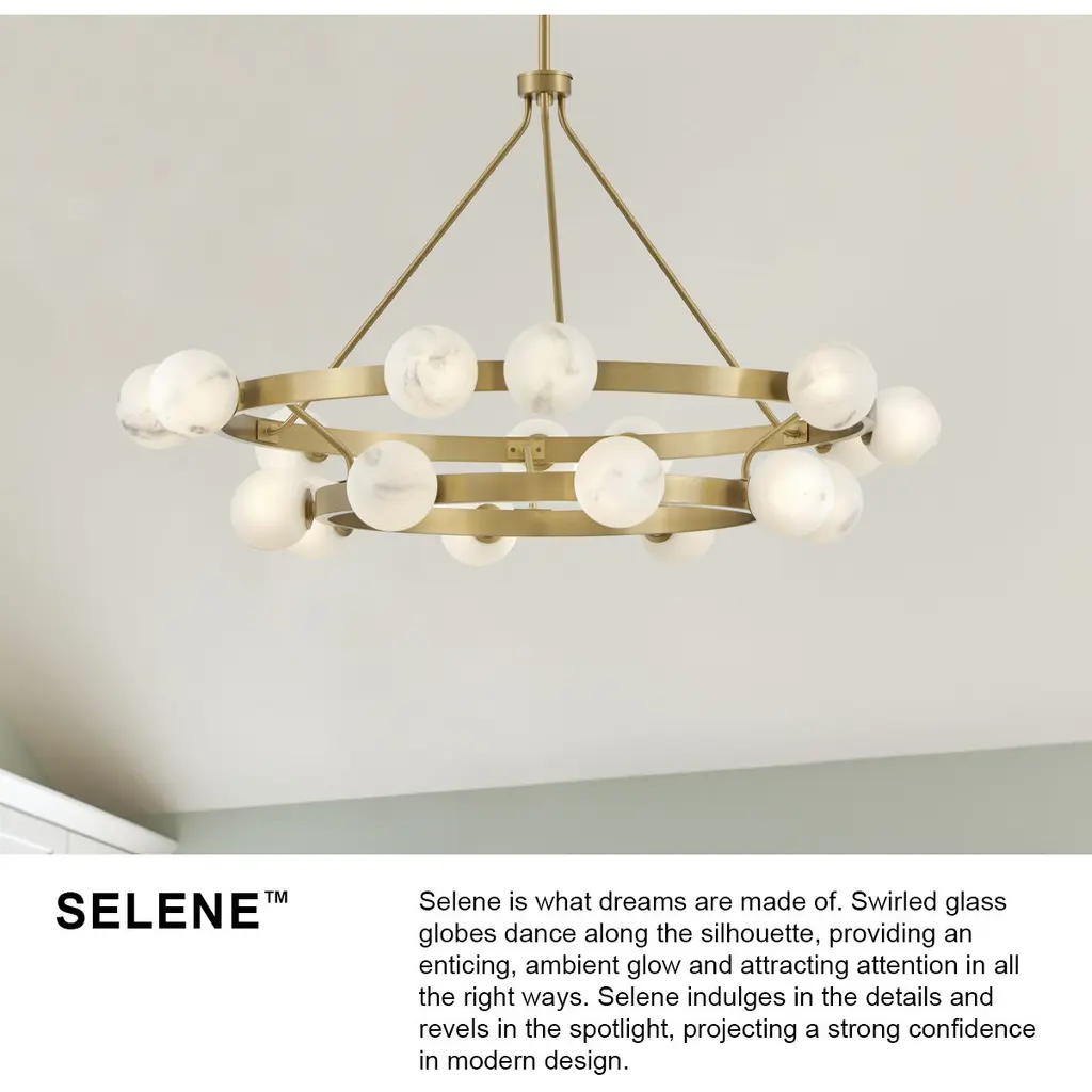 Selene is what dreams are made of. Swirled glass globes dance along the silhouette, providing an enticing, ambient glow and attracting attention in all the right ways. Selene indulges in the details and revels in the spotlight, projecting a strong confidence in modern design. Selene is what dreams are made of. Swirled glass globes dance along the silhouette, providing an enticing, ambient glow and attracting attention in all the right ways. Selene indulges in the details and revels in the spotlight, projecting a strong confidence in modern design. Bold silhouette with dramatic details creates a modern statement