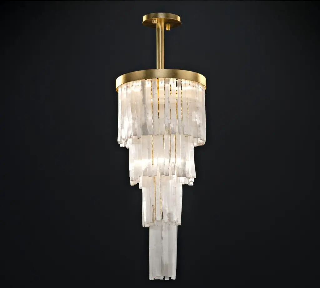 Selenite chandelier by AverDimensions: D 38 x H 75 cm.Materials: Selenite, metal.Available in other sizes.Designed by Marcele Muraro, for Aver, the collection is produced with natural Moroccan selenite and inspired by the city of Casablanca, owner of a rich architectural heritage in the Art Deco style of straight and elegant lines, added to the techniques of mosaics and geometric shapes from the buildings of the beginning of the 20th century in Morocco.