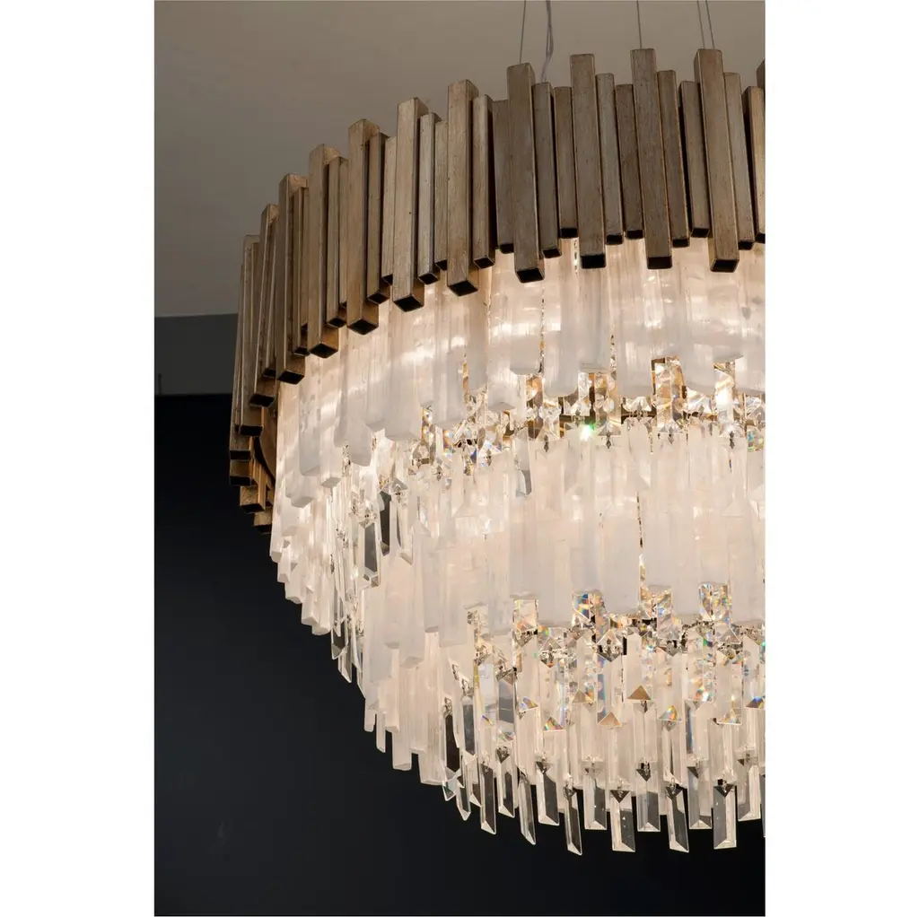 Selenite chandelier lamp by Aver Dimensions: diameter 76 x height 48 cm Materials: Aluminum, plated. Natural Moroccan/Clear Rock, Moroccan Rock.Lighting: 12 x E-14 25w.Finish: silver veneer, aged silver veneer, gold veneer, aged gold veneer, copper veneer, aged copper veneer, aged gold patina, antique patina.All our lamps can be wired according to each country. If sold to the USA it will be wired for the USA for instance.This pendant uses a layer of metallic tubes and an interior with cut crystals and natural selenite rock.The history of Aver Metais as a lighting brand begins with Jefferson Aver manufacturing lamps in a completely handcrafted way and with very few resources in the family business. Over the years, the brand has grown and gained recognition. Today, our products are present in several projects by prestigious professionals, in addition to being resold in lighting boutiques in different regions of Brazil. Through its partners, Aver Metais has several participations in important design and architecture exhibitions. In 2015 the company started its internationalization process and today has clients and projects carried out in places like New York, Los Angeles, Chicago, Dallas, Miami, London, Cardiff, Hamburg, Manila, Santa Cruz de la Sierra, and Lima, attesting to the level quality and competitiveness of Aver Metais products.In our factory, each piece is meticulously produced using modern production processes combined with craftsmanship to detail. The result is original pieces that, more than illuminate, are jewels for your home. Over the years, the brand has been dedicated to creating and producing original and high-quality decorative lighting fixtures that can fit into the most varied and demanding interior architecture projects.