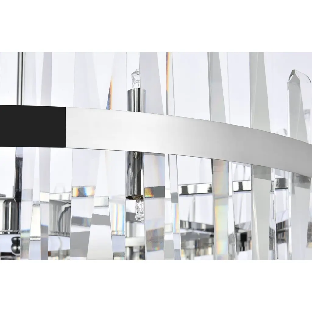 Modern crystal chandelier features top and bottom tier crystal prisms staggered along the wrought iron frame. The thick metal frame wraps around top grade crystal prisms ensure it is built to last, definitely worth it. Hang this work of art and dim the lights for a bit of sophisticated lighting in your home. Get lost in a beautiful light and sleek design available in multiple finishes. The hanging rod conveniently comes with a slope ceiling adapter, perfect for your vaulted or angled ceiling.