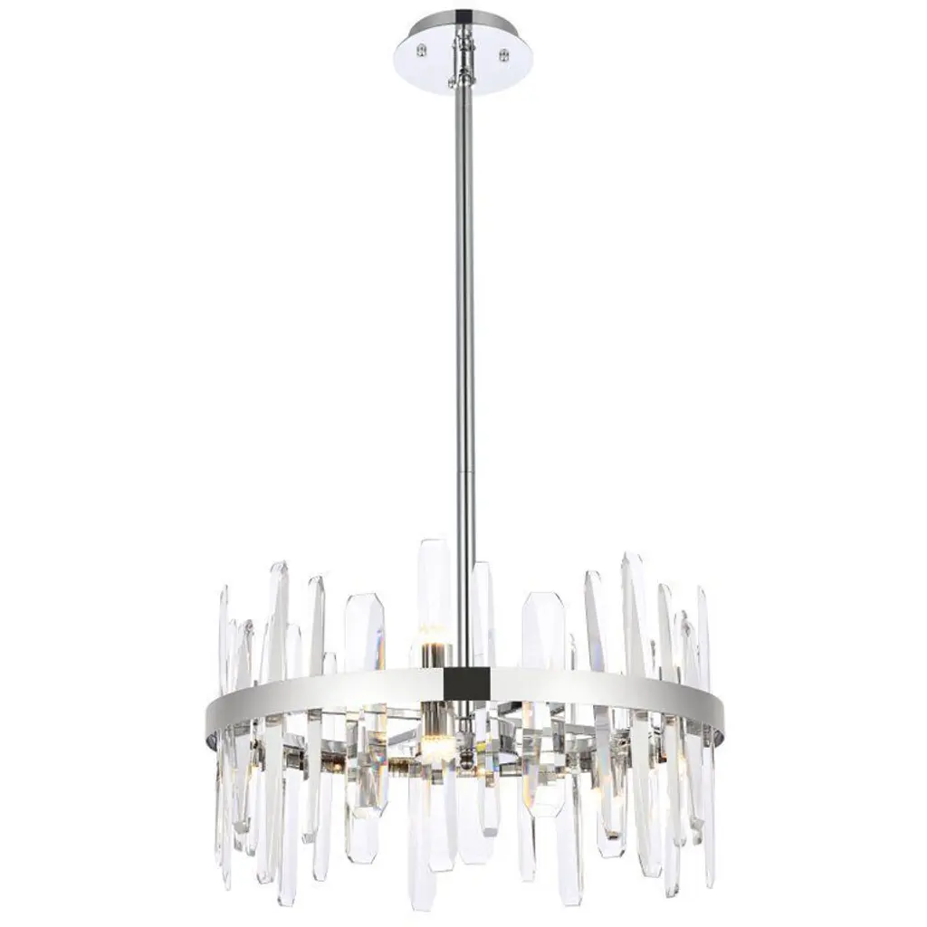 Modern crystal chandelier features top and bottom tier crystal prisms staggered along the wrought iron frame. The thick metal frame wraps around top grade crystal prisms ensure it is built to last, definitely worth it. Hang this work of art and dim the lights for a bit of sophisticated lighting in your home. Get lost in a beautiful light and sleek design available in multiple finishes. The hanging rod conveniently comes with a slope ceiling adapter, perfect for your vaulted or angled ceiling.