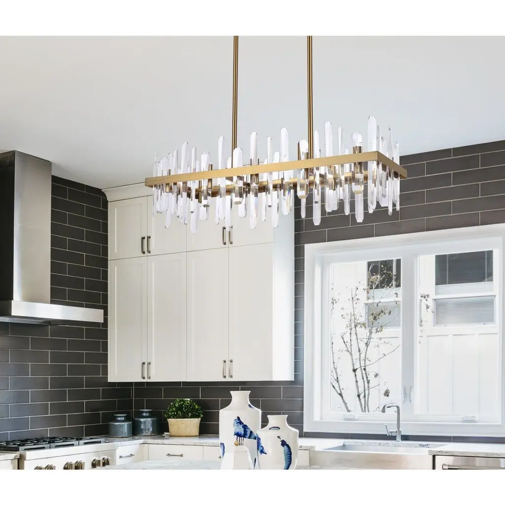 Modern crystal chandelier features top and bottom tier crystal prisms staggered along the wrought iron frame. The thick metal frame wraps around top grade crystal prisms ensure it is built to last, definitely worth it. Hang this work of art and dim the lights for a bit of sophisticated lighting in your home. Get lost in a beautiful light and sleek design available in multiple finishes. The hanging rod conveniently comes with a slope ceiling adapter, perfect for your vaulted or angled ceiling.