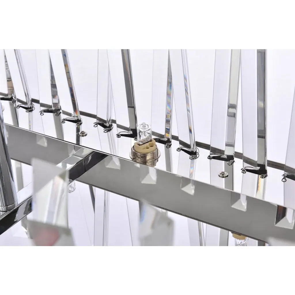 Modern crystal chandelier features top and bottom tier crystal prisms staggered along the wrought iron frame. The thick metal frame wraps around top grade crystal prisms ensure it is built to last, definitely worth it. Hang this work of art and dim the lights for a bit of sophisticated lighting in your home. Get lost in a beautiful light and sleek design available in multiple finishes. The hanging rod conveniently comes with a slope ceiling adapter, perfect for your vaulted or angled ceiling.