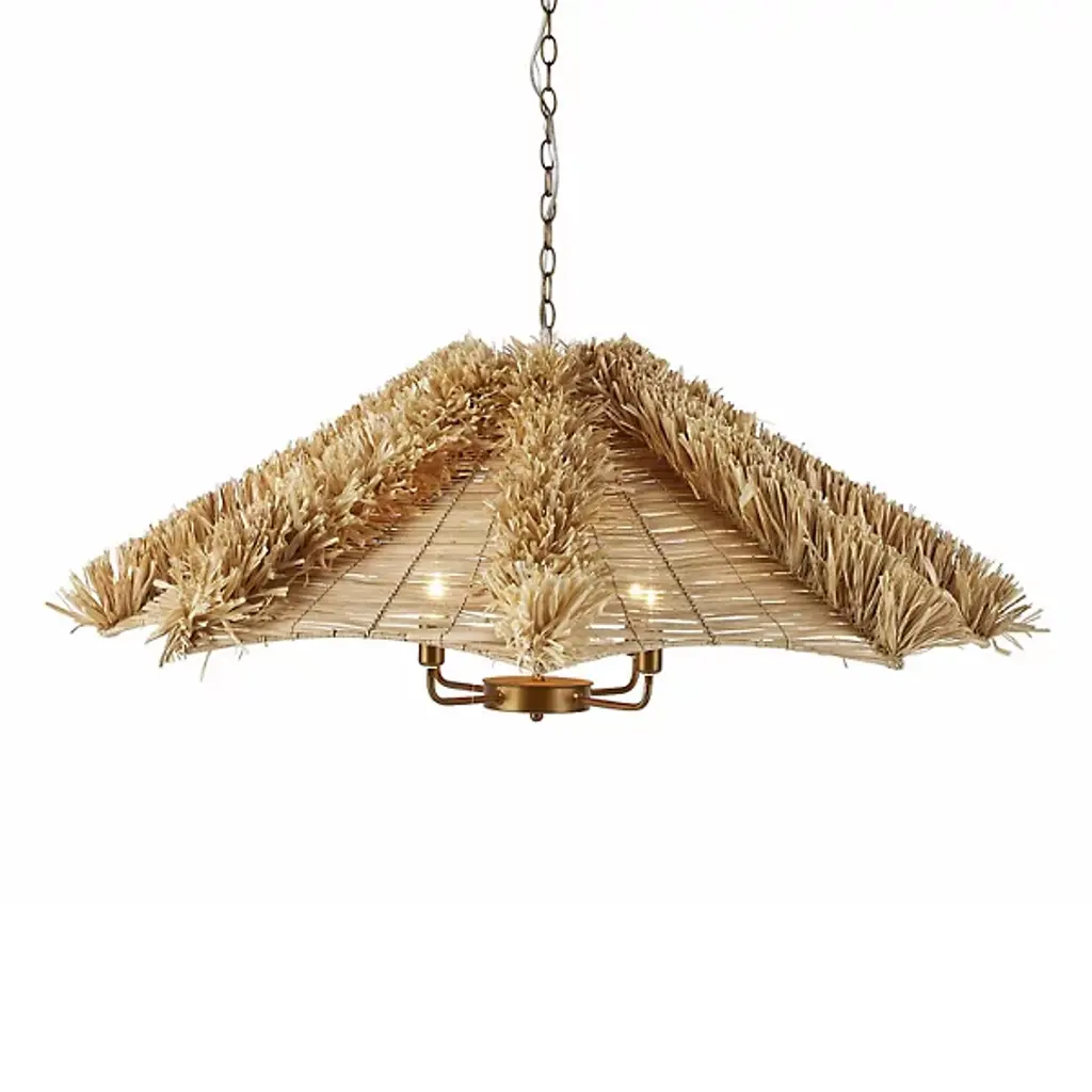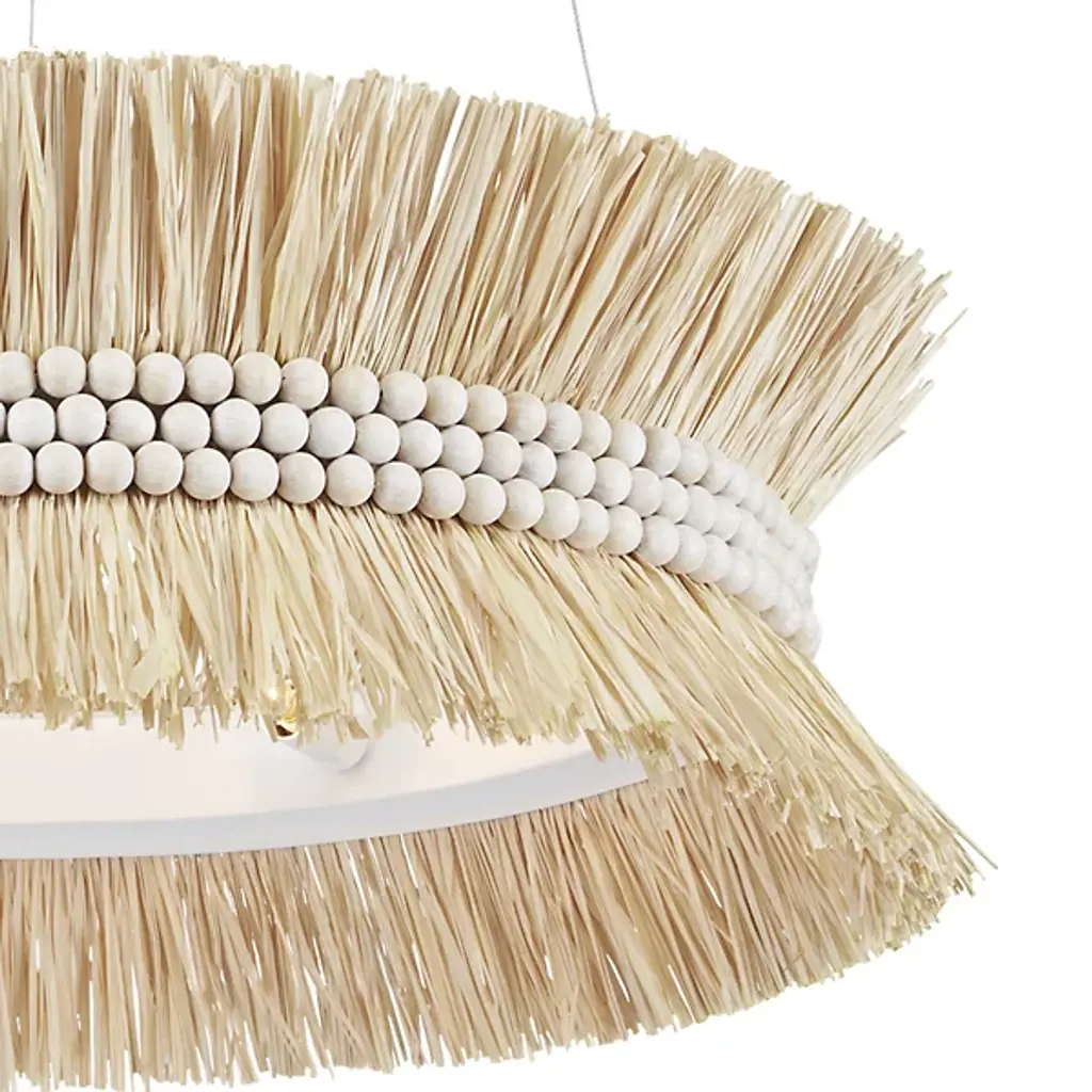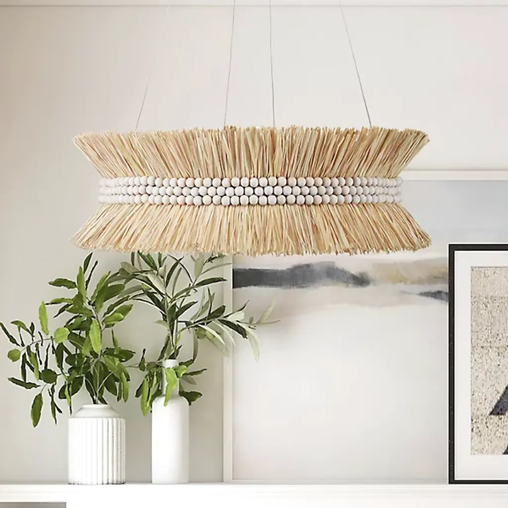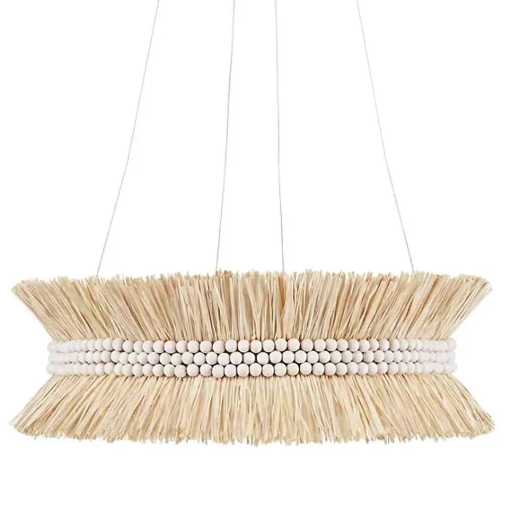 Take the island life home with the Seychelles Chandelier from Currey & Company, a standout fixture with a coastal appeal. Descending from a low-profile metal canopy along four slender cables, it secures a sleek horizontal ring structure below with strong candelabra lamping studded around its interior surface. A beveled shade of raffia flares out above and below the ring, held in place by a three-layer band of wood beads, which provides a playful natural appeal to the otherwise-simple fixture.