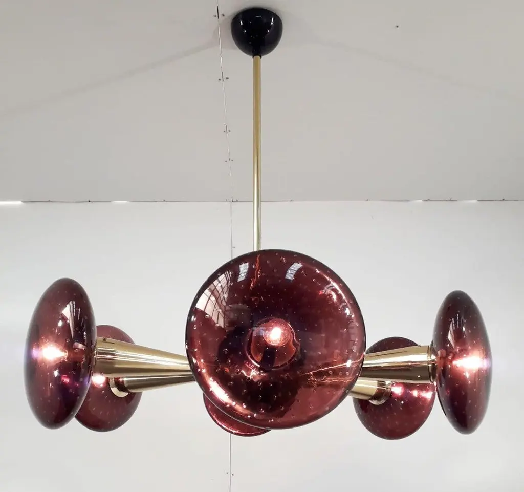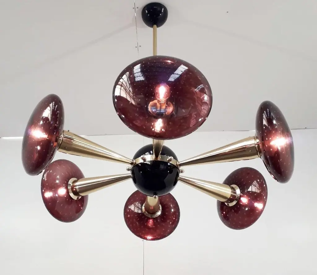 Italian chandelier with amethyst Murano glass shades hand blown with bubbles inside the glass using Bollicine technique, mounted on newly made polished brass frame with black enameled center and ceiling canopy / designed by Fabio Bergomi for Fabio Ltd, made in Italy6-light / E12 or E14 type / max 40W eachMeasures: Diameter 40 inches, height 43 inches including rod and canopyOrder only / this item ships from ItalyOrder reference #: FABIOLTD C491 AMETHYST BUBBLES