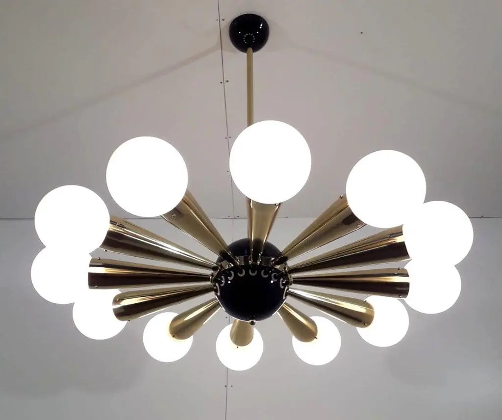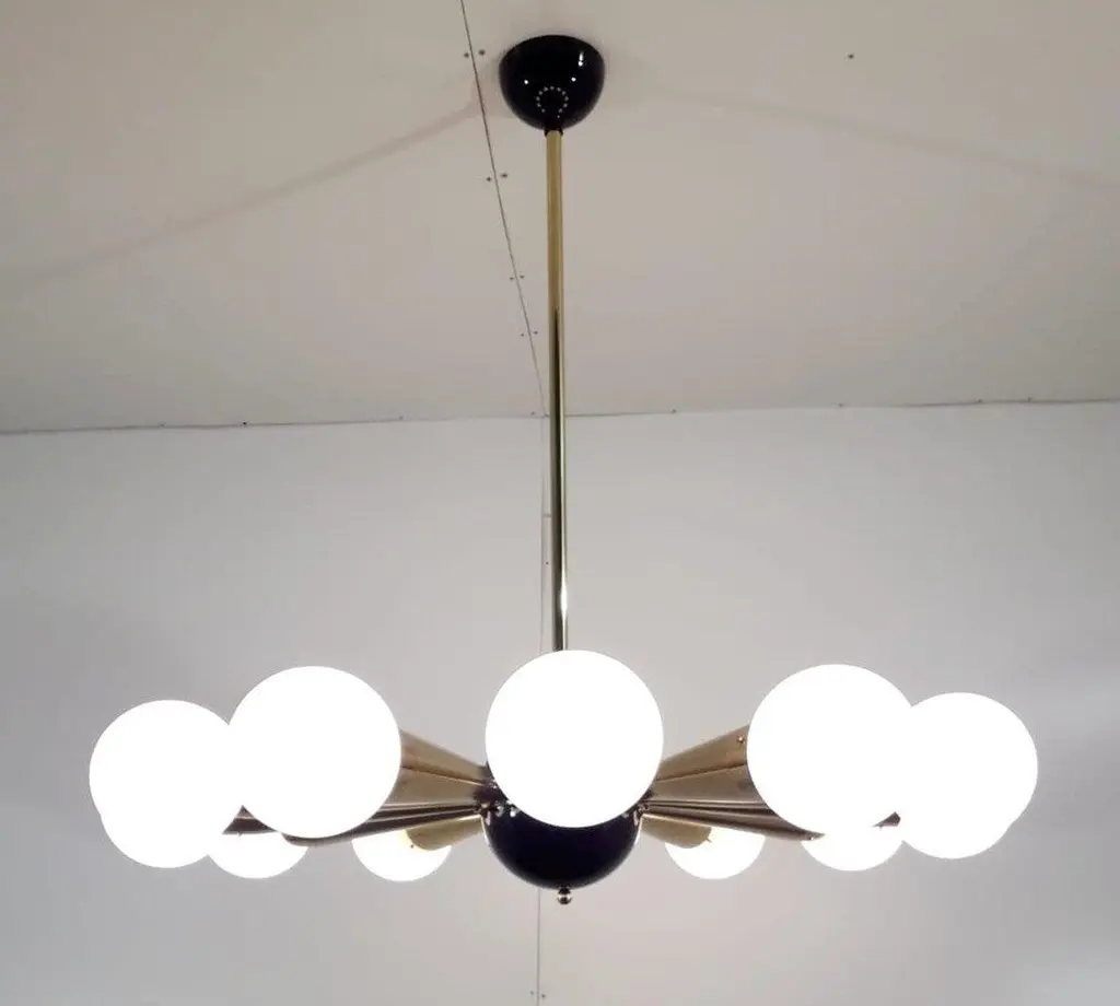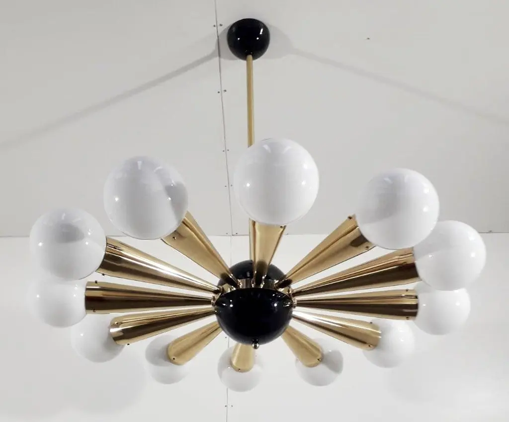 Italian chandelier with glossy white Murano glass globes mounted on polished brass frame with black enameled center and ceiling canopy, designed by Fabio Bergomi for Fabio Ltd, made in Italy12-light / E12 or E14 type / max 40W eachMeasures: Diameter 43 inches, height 41 inches including rod and canopyOrder only / this item ships from ItalyOrder Reference #: FABIOLTD C579