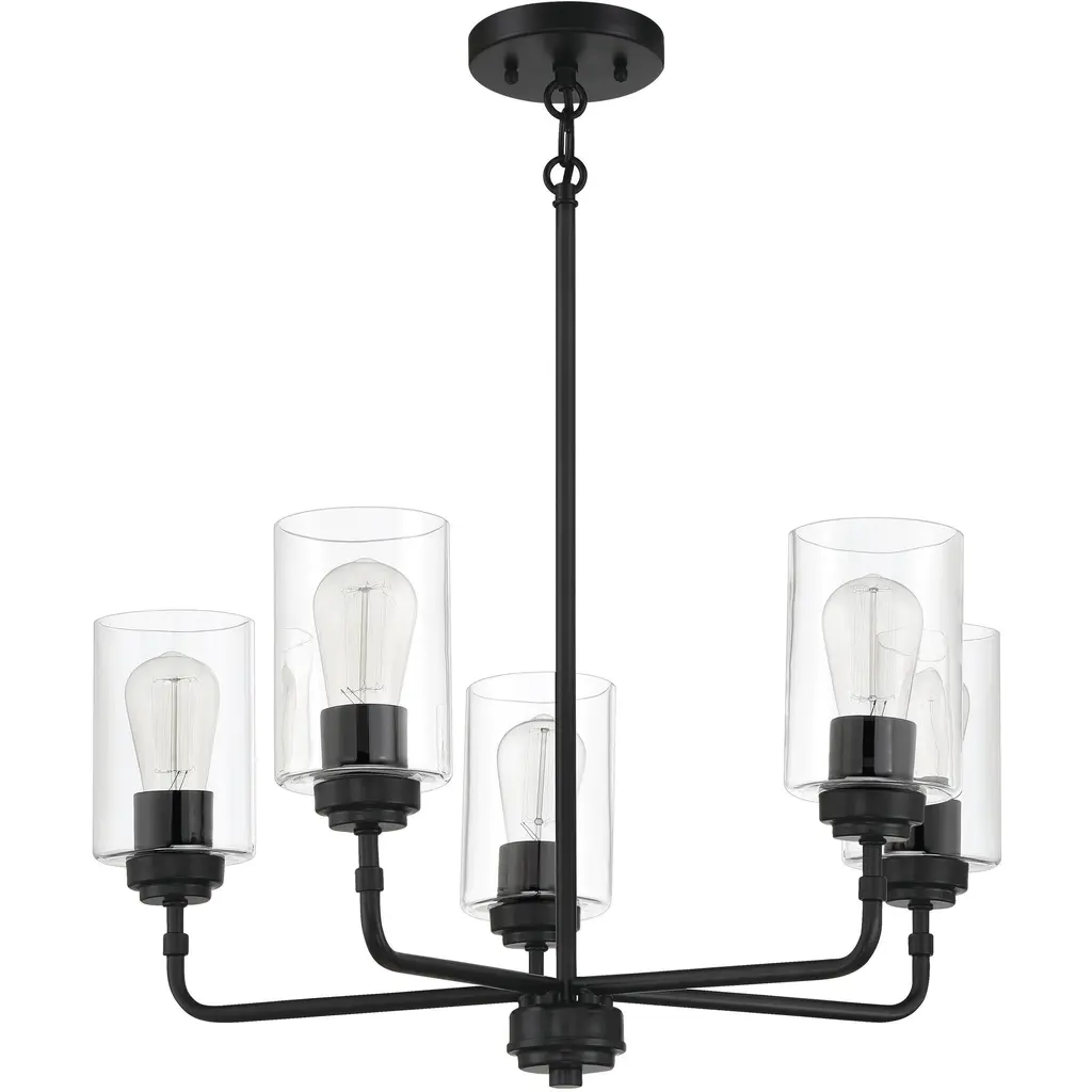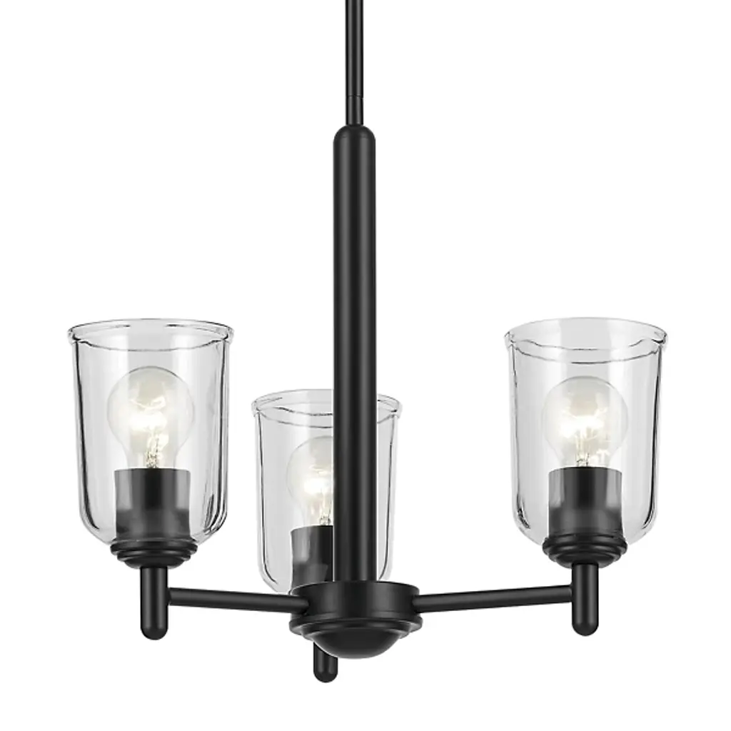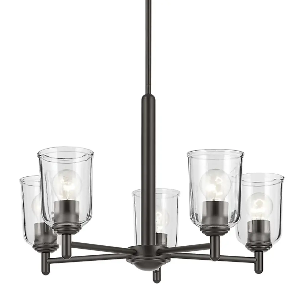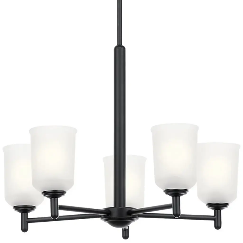 Give your living space a mid-century modern look with the Shailene Chandelier by Kichler. A strong downrod is chained to a ceiling canopy, providing the midair foundation for a collection of lights. These lights boast lovely cylindrical, satin-etched glass shades which rest atop fine metallic casings. Each of your chandelier’s shade’s is illuminated with an incandescent bulb that gives your room a pleasant glow. This multi-light fixture ensures that you receive ample amounts of light from overhead.