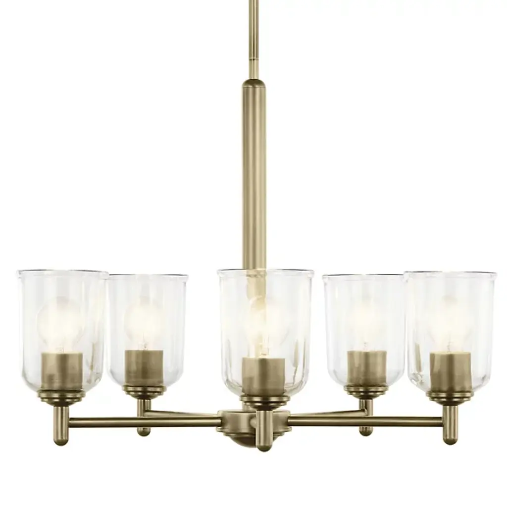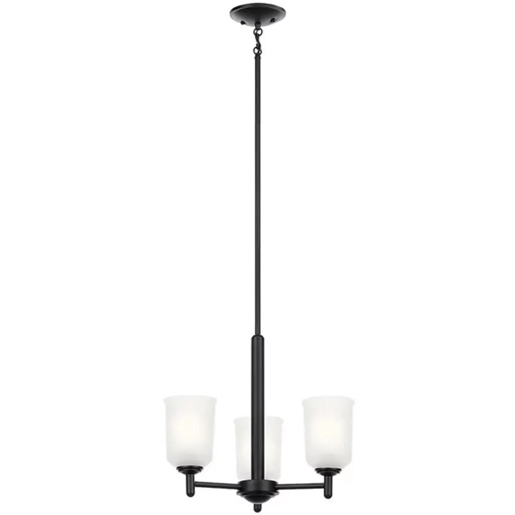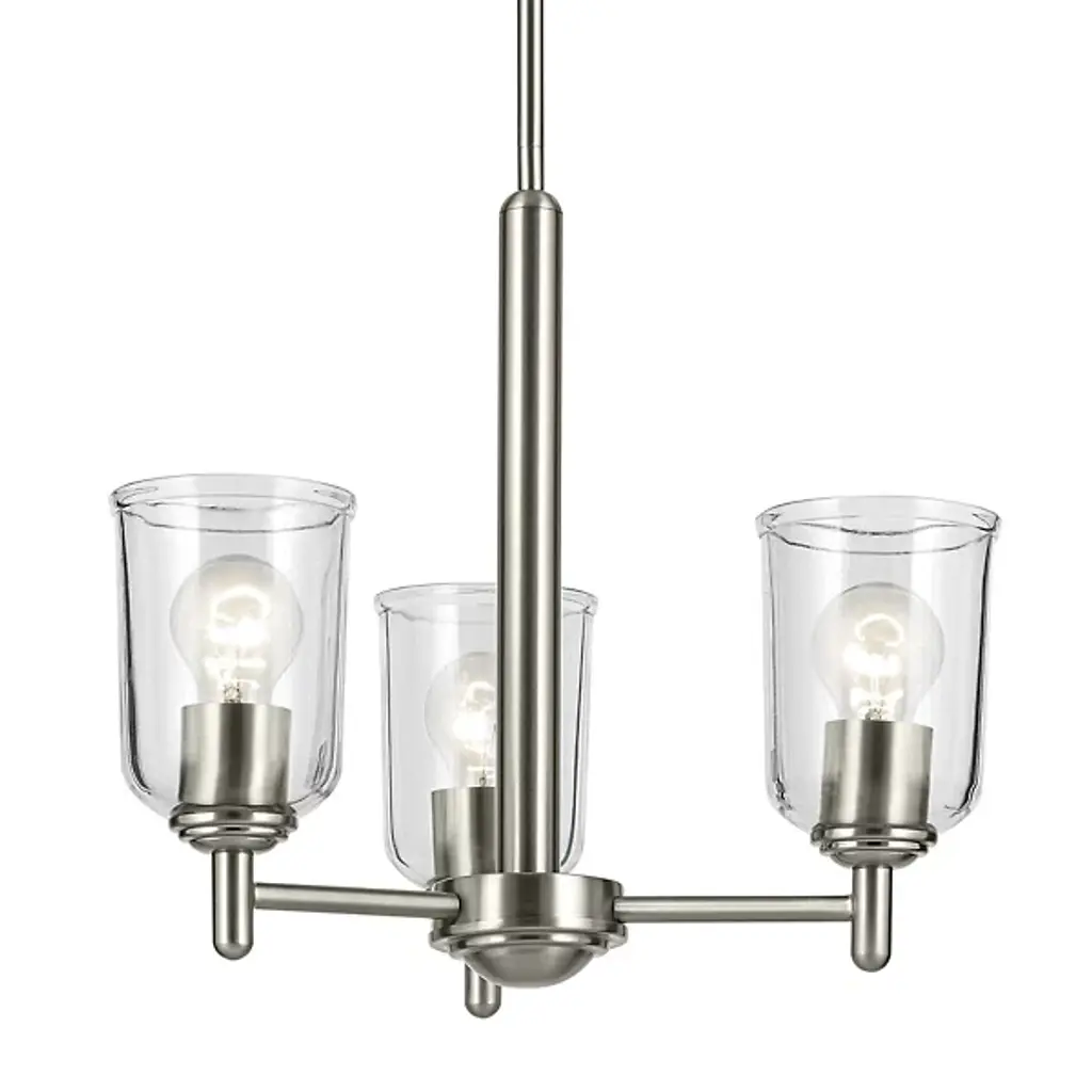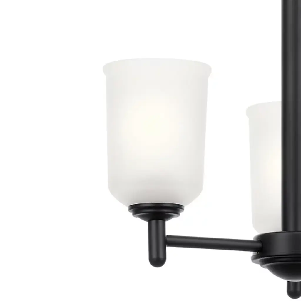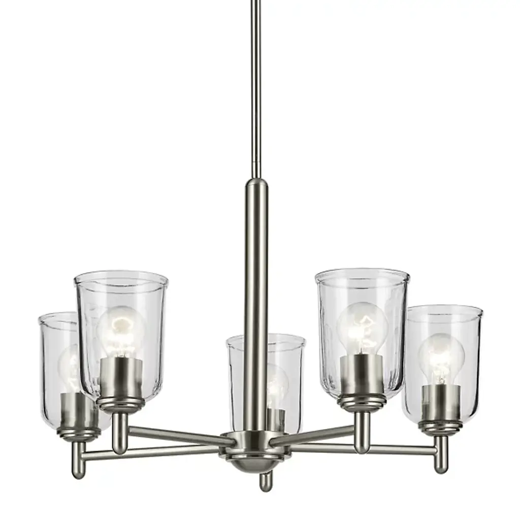 Give your living space a mid-century modern look with the Shailene Chandelier by Kichler. A strong downrod is chained to a ceiling canopy, providing the midair foundation for a collection of lights. These lights boast lovely cylindrical, satin-etched glass shades which rest atop fine metallic casings. Each of your chandelier’s shade’s is illuminated with an incandescent bulb that gives your room a pleasant glow. This multi-light fixture ensures that you receive ample amounts of light from overhead.