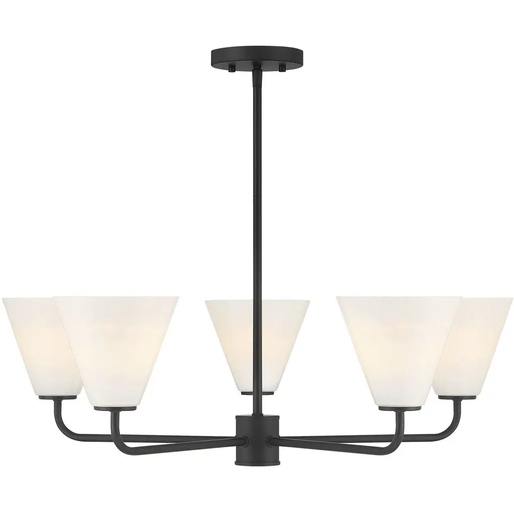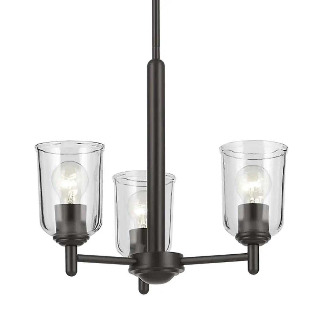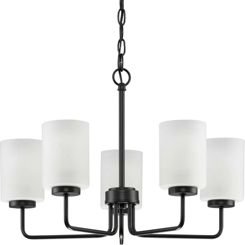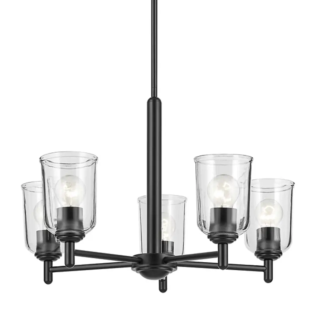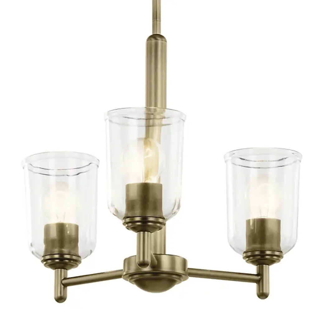 Give your living space a mid-century modern look with the Shailene Chandelier by Kichler. A strong downrod is chained to a ceiling canopy, providing the midair foundation for a collection of lights. These lights boast lovely cylindrical, satin-etched glass shades which rest atop fine metallic casings. Each of your chandelier’s shade’s is illuminated with an incandescent bulb that gives your room a pleasant glow. This multi-light fixture ensures that you receive ample amounts of light from overhead.