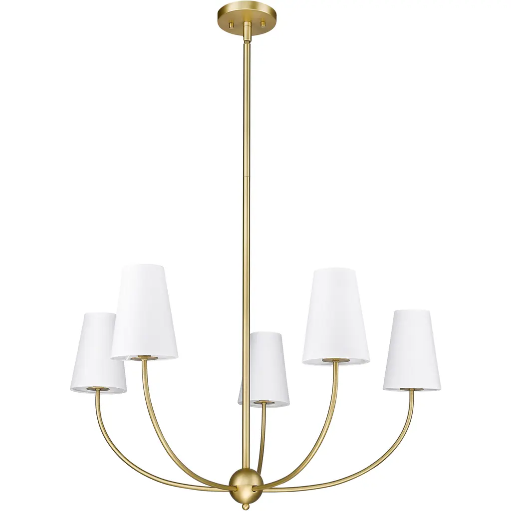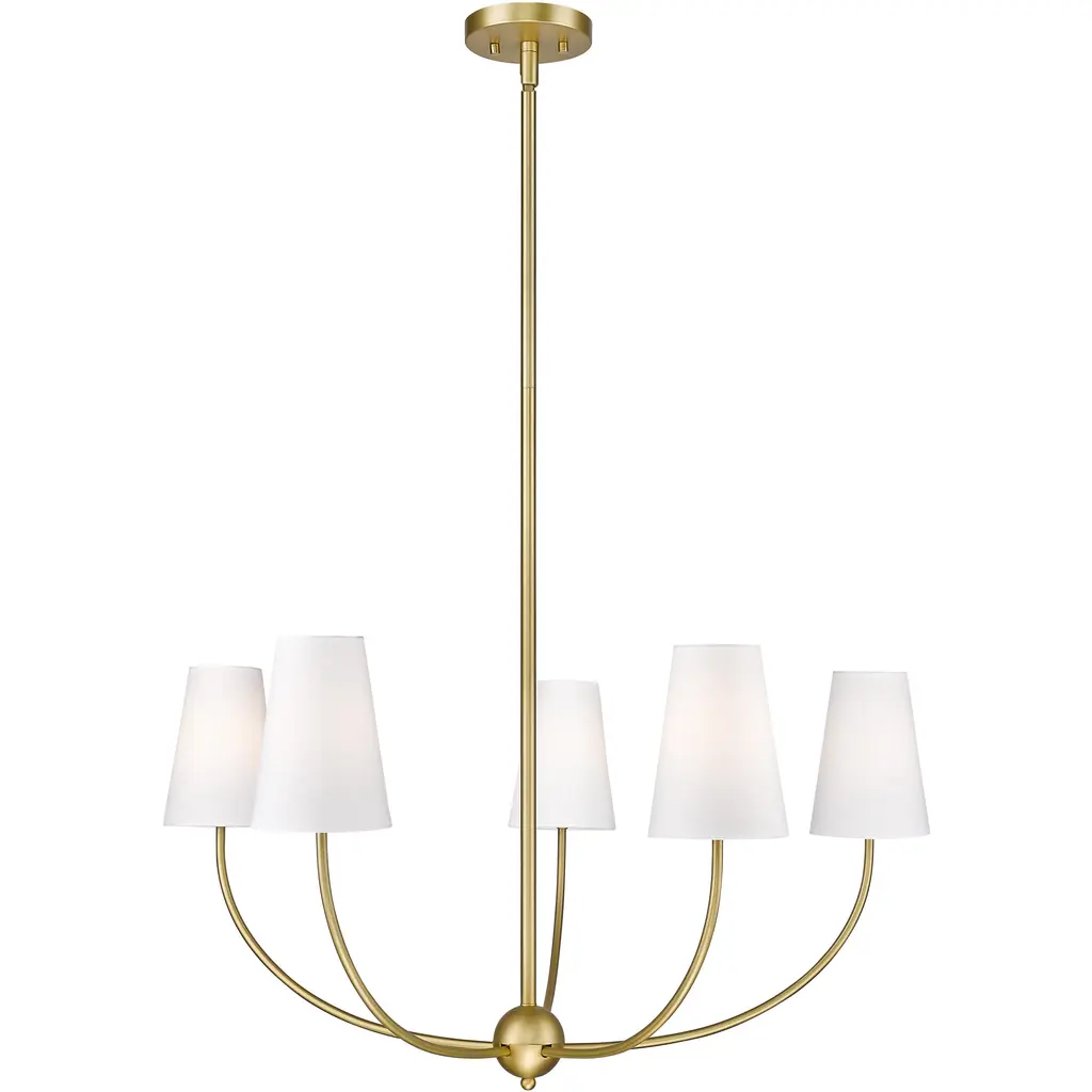A warm, rich finish and symmetrical silhouette with low-key elements offer tasteful ambiance to the Shannon five-light chandelier. Embrace the graceful aesthetic of a warm rubbed brass finish steel frame with subtly curved arms culminating with lights capped with classic white fabric shades. This minimalist chandelier tells a story of measured elegance suited to a dining space, kitchen, or entryway.