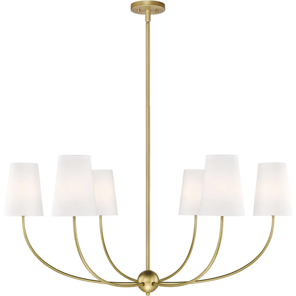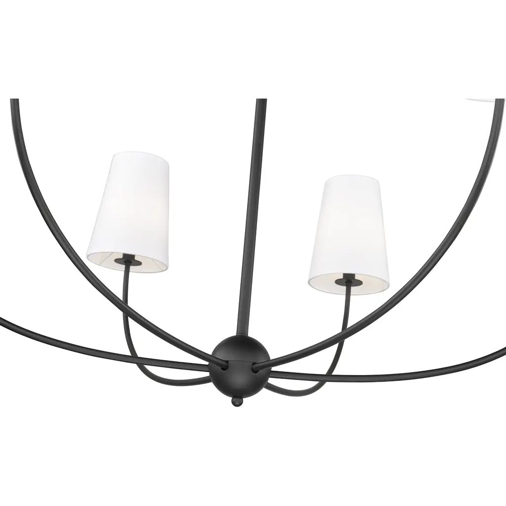 Crisp in style and contrast, the Shannon six-light chandelier becomes a focal point in any modern space. Embrace the cool aesthetic of a matte black finish steel frame with subtly curved arms and lights capped with classic white fabric shades reflecting traditional style. Infuse ambient lighting over a dining ensemble, in an entryway, or in a main living area with this tasteful chandelier.