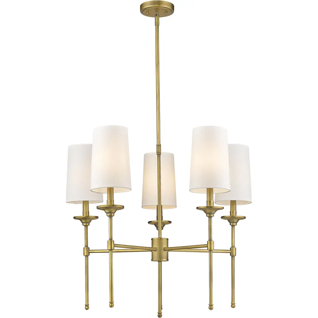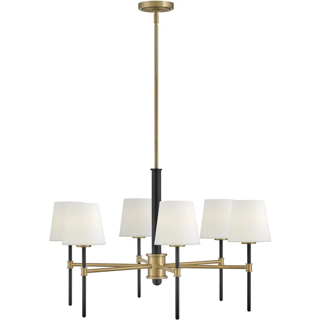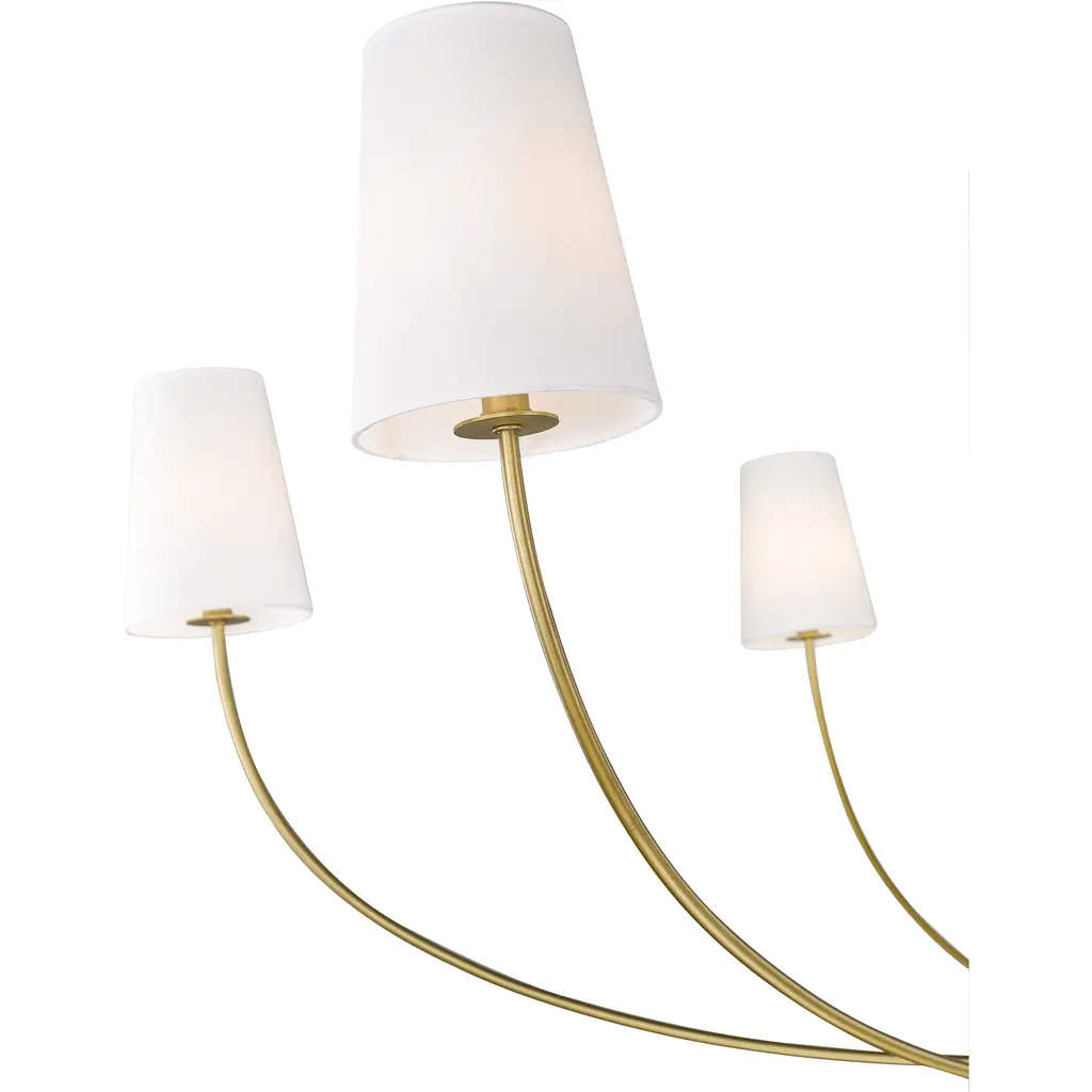 Modern design concepts count on versatility and style, and the Shannon six-light chandelier complies with a glowing, rich finish palette. This contemporary fixture features gorgeous rubbed brass finish steel framing with gracefully curved arms, a center orb accent, and traditional white fabric shades capping each candelabra lamp. Perfect for dining spaces, living areas, and entryways, this sophisticated chandelier is a natural choice.