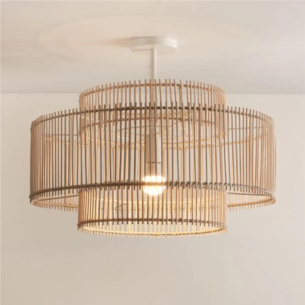 The sherman features reed like rods of natural color resin which forms a drum shape outdoor chandelier