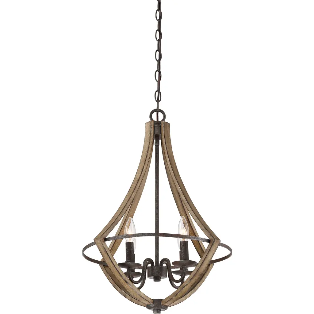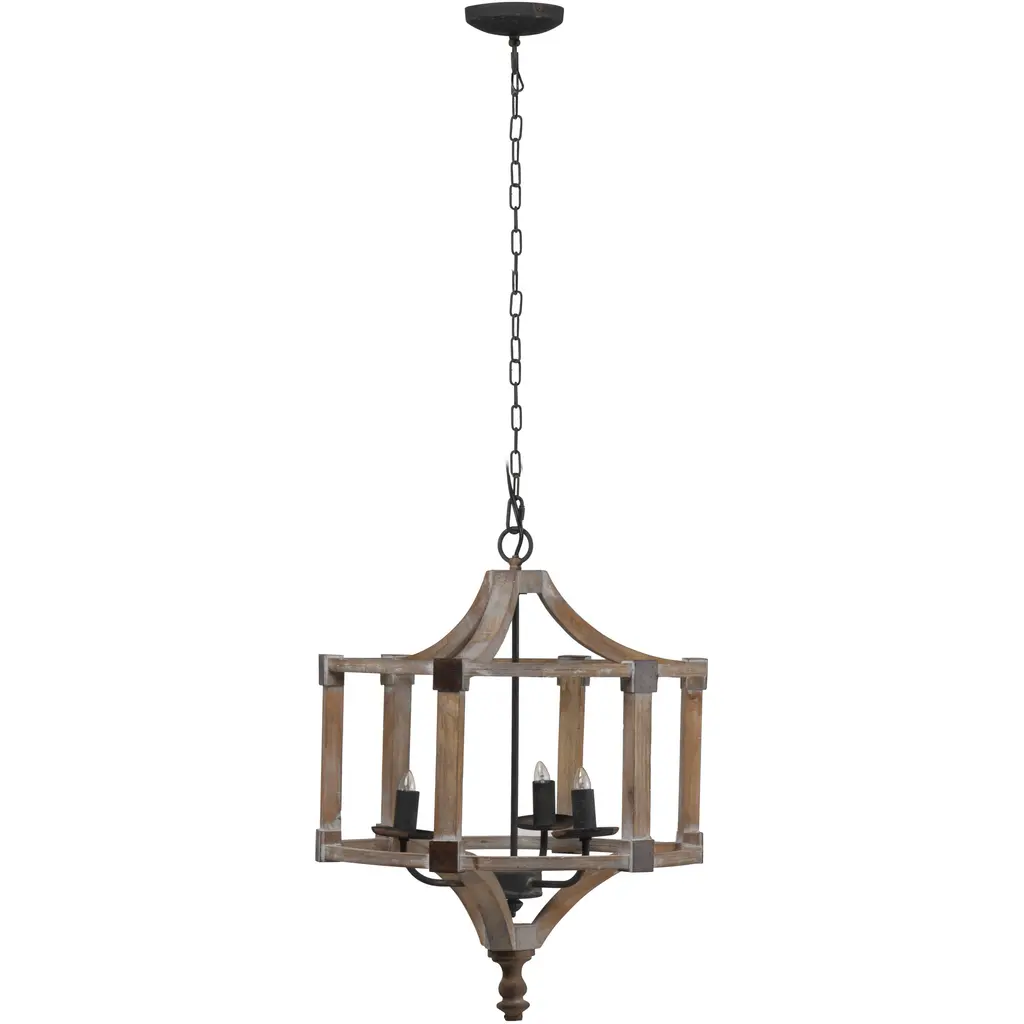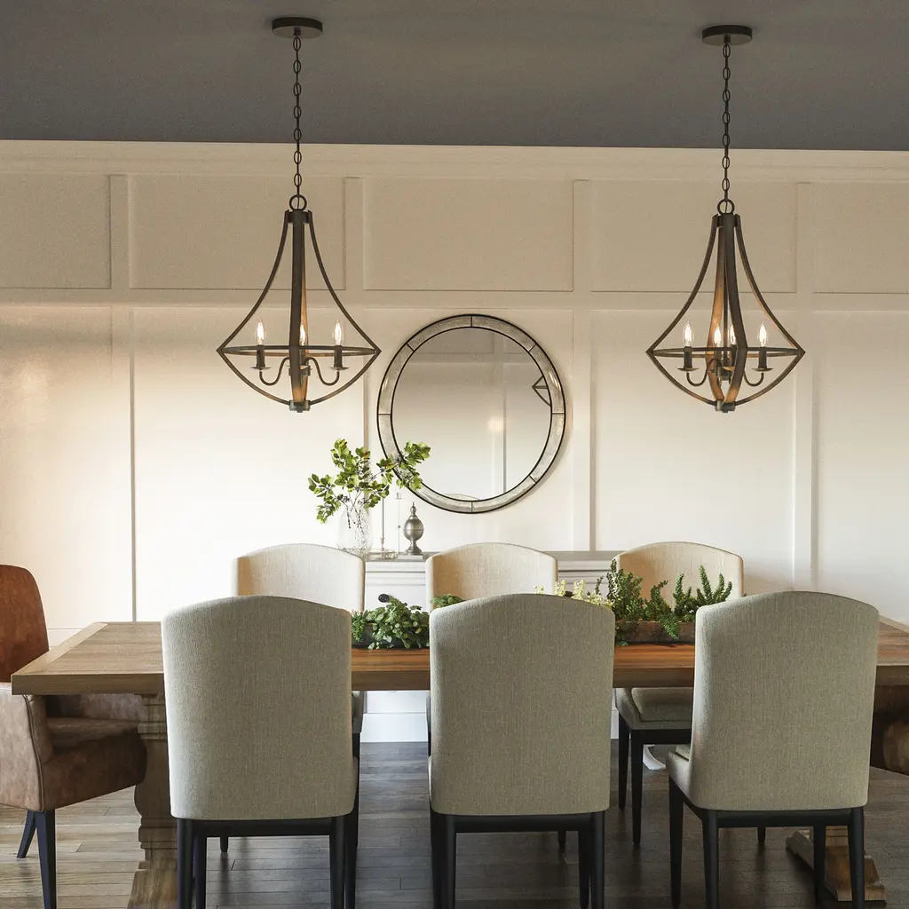 Traditional warmth meets industrial minimalism in the Shire collection. The rubbed black edges on the faux wood frame complements the rustic black finish of the inner rings. Curved arms and candelabra bulbs add classic charm to the chic simplicity of the drop silhouette.