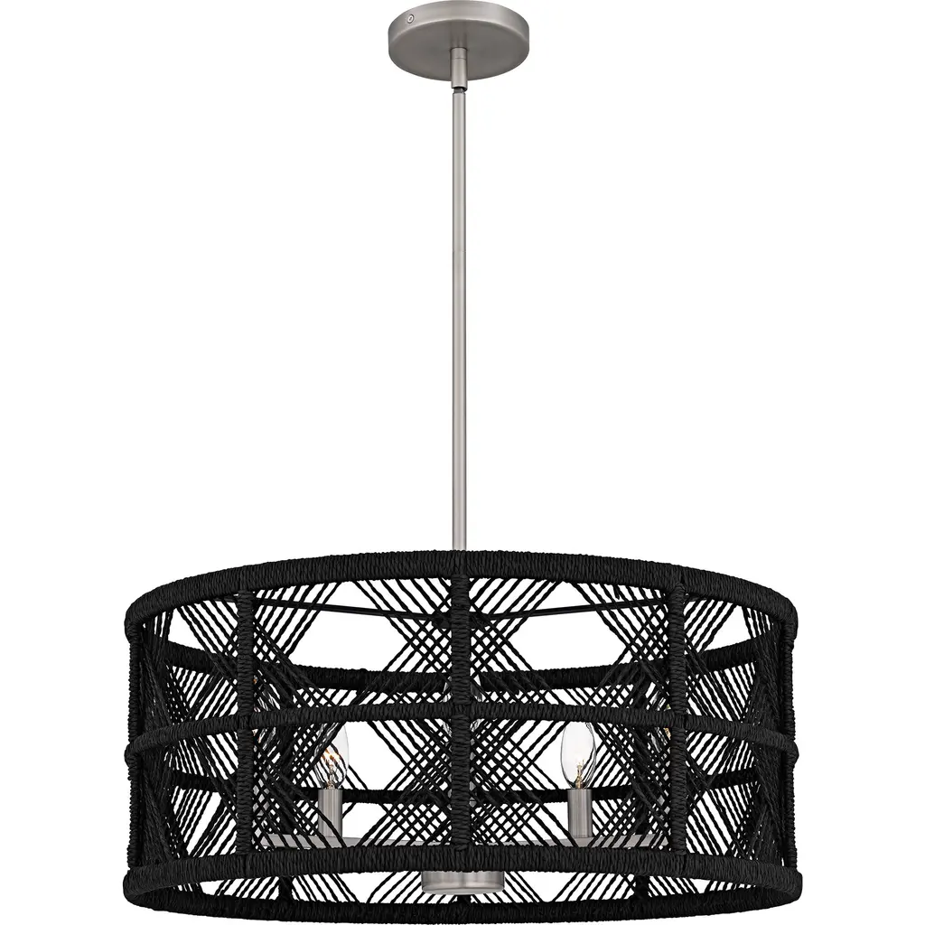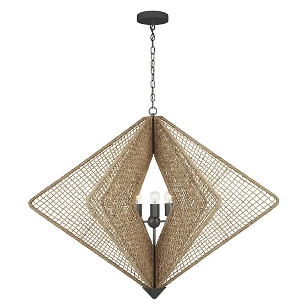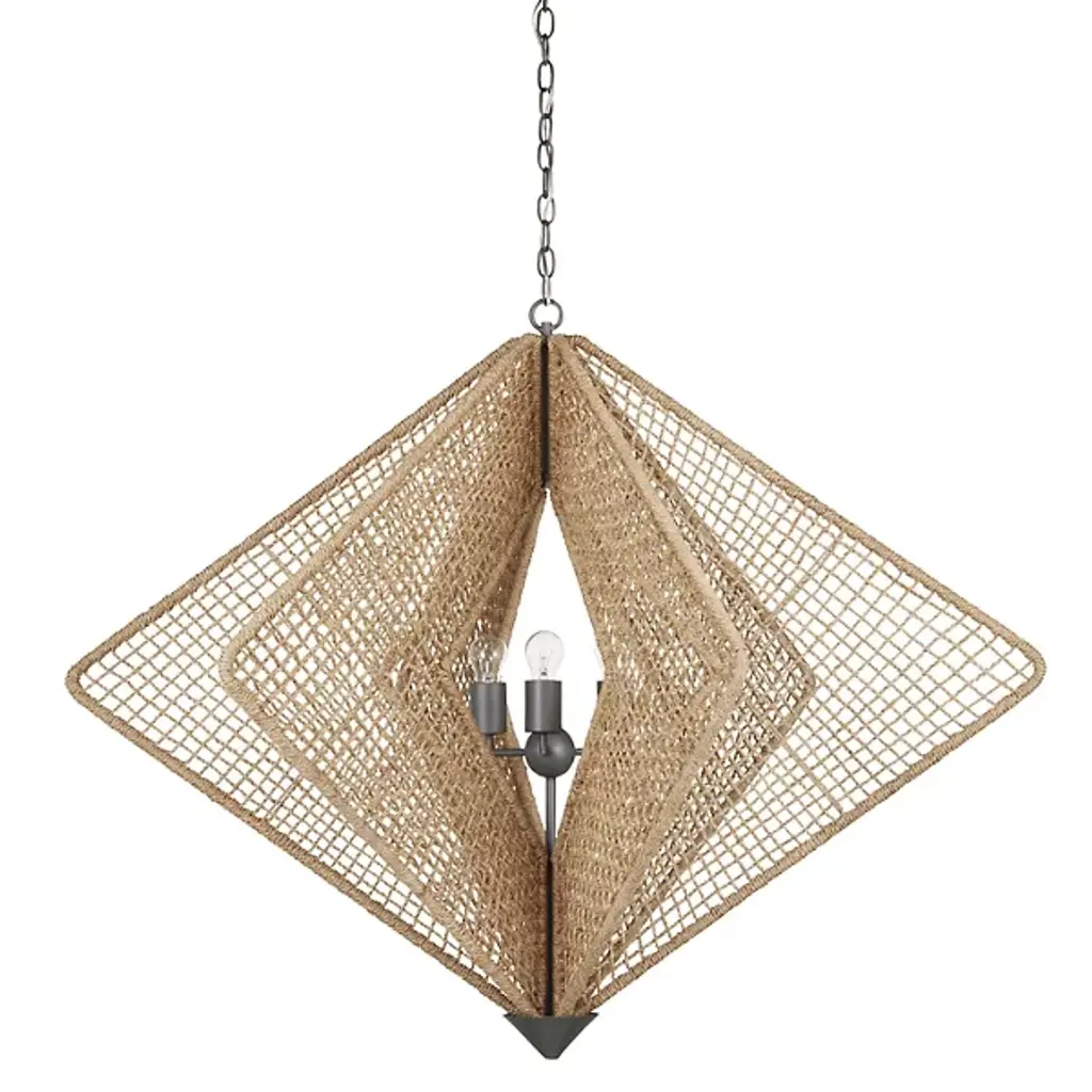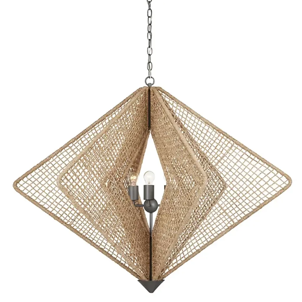 Bohemian brilliance blooms in the Shizen Chandelier from Currey & Company. Designed by Hiroshi Koshitaka, it is a tribute to nature and the concept of rebirth. In Japanese, "Shizen" means "nature," and this chandelier embodies that essence. Its steel frame is meticulously wrapped in abaca rope in an intricate pattern, showcasing the designer's dedication and attention to detail. The chandelier features a generous size and is finished with metal hardware and a cone in a sophisticated Hiroshi gray finish.