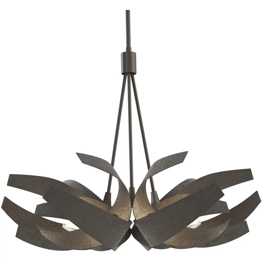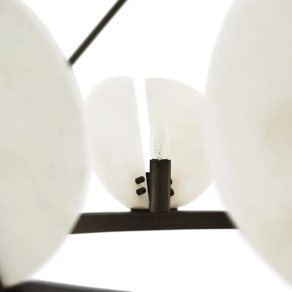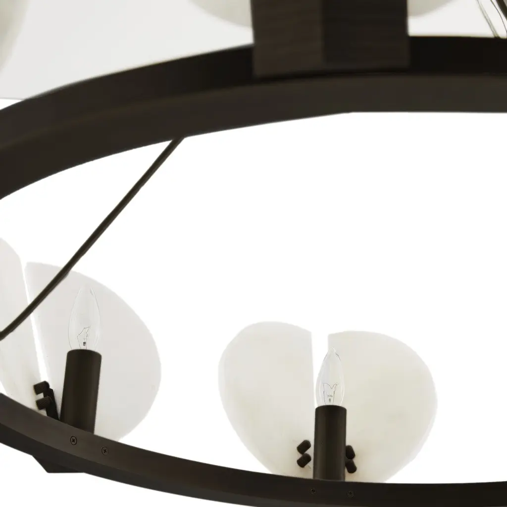 With Art Deco at the heart of its design, this evocative chandelier celebrates glamor and luxury. Our Sierra fixture is created in demilune-shaped slices of white alabaster, clamped together with decorative, English bronze fittings. The fan-shaped pieces encircle an English bronze frame. Finish will vary.