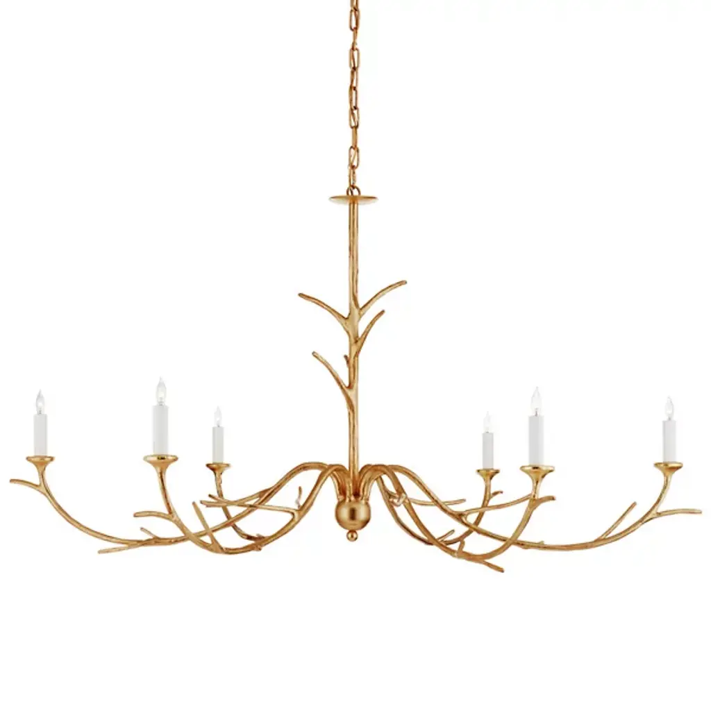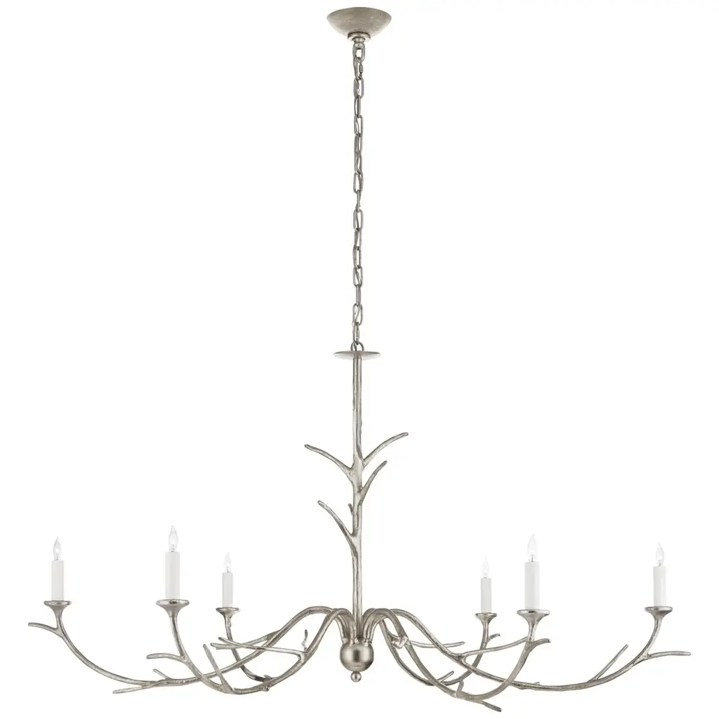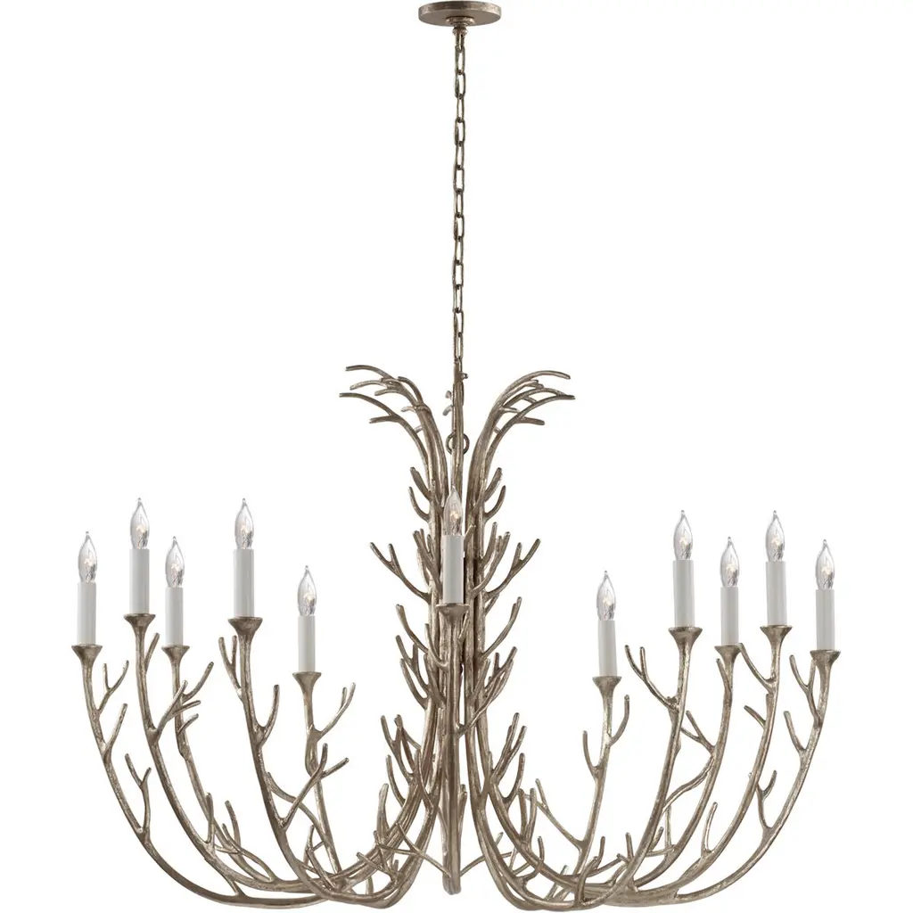 Evoking a natural allure, the Silva Chandelier from Visual Comfort Signature, formerly known as Visual Comfort, unites the space with an impressive, organic display reminiscent of antlers from a great animal. Starting at a central pillar, the arms swoop down and outward in pronounced, significant arcs, each adorned with sprouting stems for a visually dynamic display. At the end of each, the arms present candelabra-style bulbs that shine a warm, extensive glow throughout the space that harkens back to simpler times in the great outdoors.