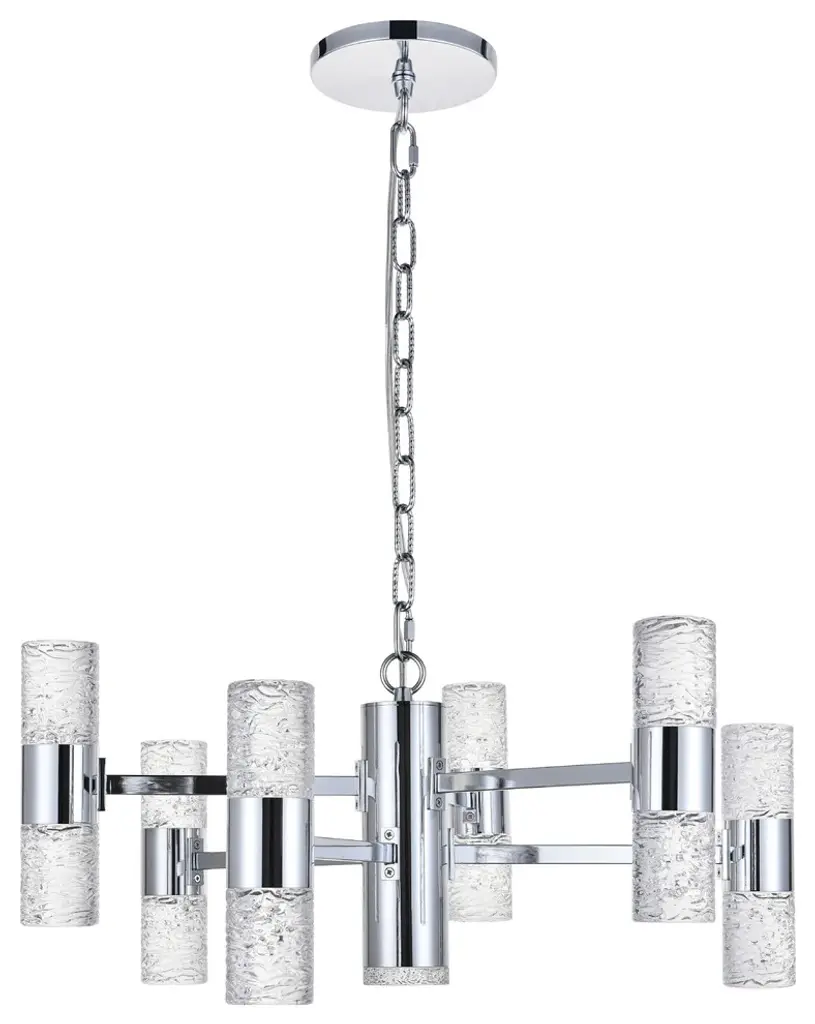 The Simple Lux Lighting Collection by Craftmade features brilliant dimmable LED light illuminating the frosted glass shades of this contemporary collection of 16", 20" and 27" diameter chandeliers and 12" diameter semi flushmount fixture. Sleek cylinders with frost LED caps alternating up and down surround the round frame suspended from a round canopy by a combination of rod and adjustable height chain. Damp Rated