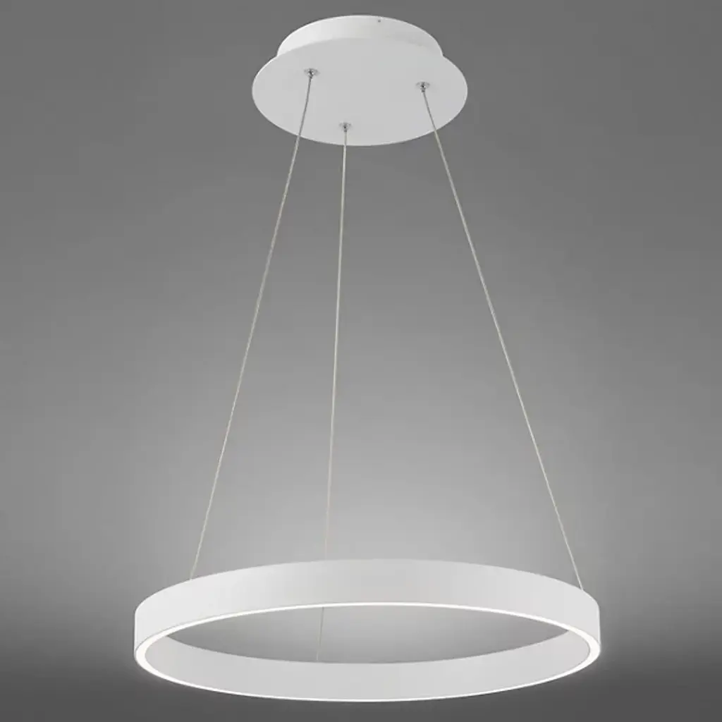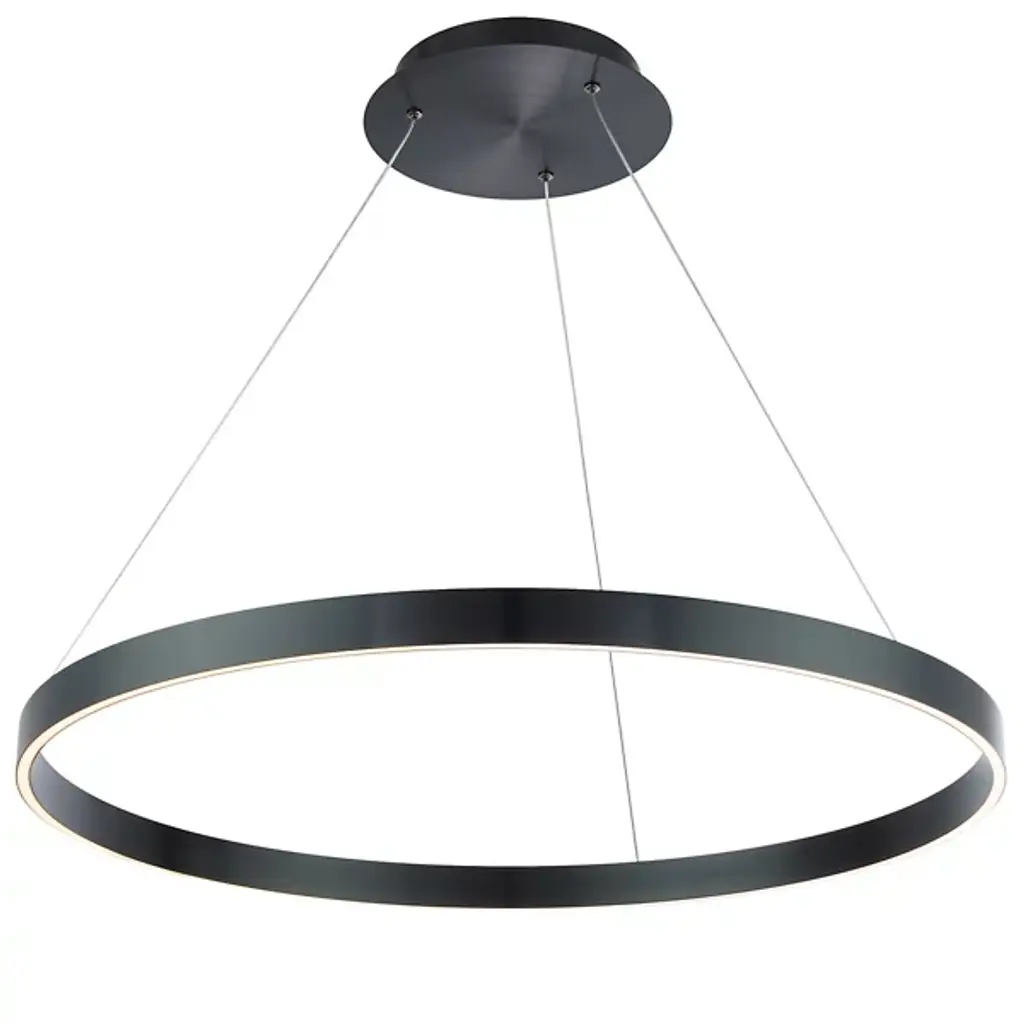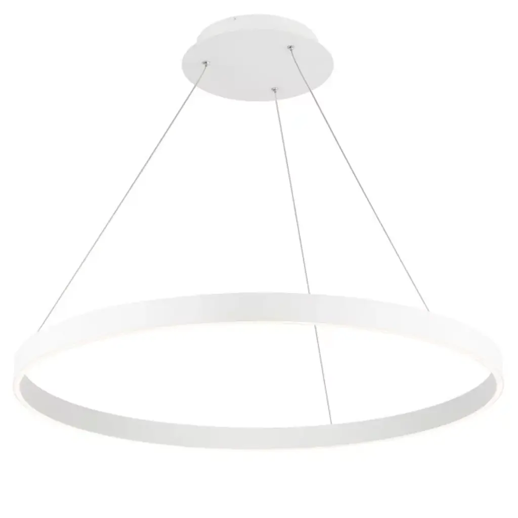 The Sirius LED Chandelier by dweLED has a simple, sleek design that lends a minimal, modern touch to spaces. Suspended by slender cables for an airy feel, this chandelier features a smoothly curved, openly-styled aluminum halo that is paired with silicone diffusers that run along its edges to project a soft layer of energy-efficient light above and below its form. A uniform finish keeps this circular design neat and tailored, matching the finish on the round canopy above it to offer rooms a cohesive blend of form and function.