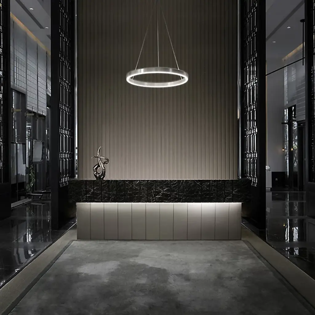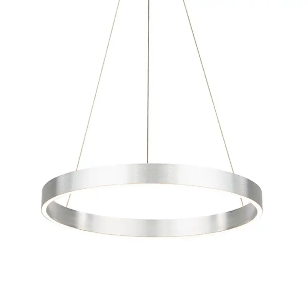 The Sirius LED Chandelier by dweLED is a sleek, sophisticated addition to spaces. Suspended and powered by thin cables for a clean look, a wide aluminum band with concealed, integrated LEDs along the top and bottom edge bring a luminous touch to this airy design and its surroundings. With a simple structure, the light from this halo filters through silicone diffusers, providing plenty of upward and downward illumination, pairing well with a range of décor and design styles.
