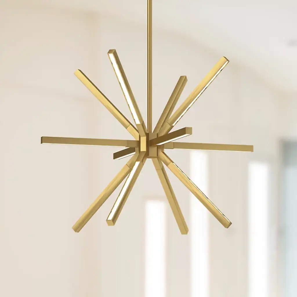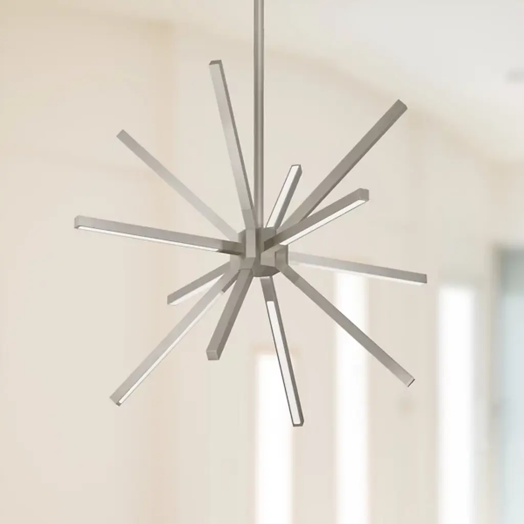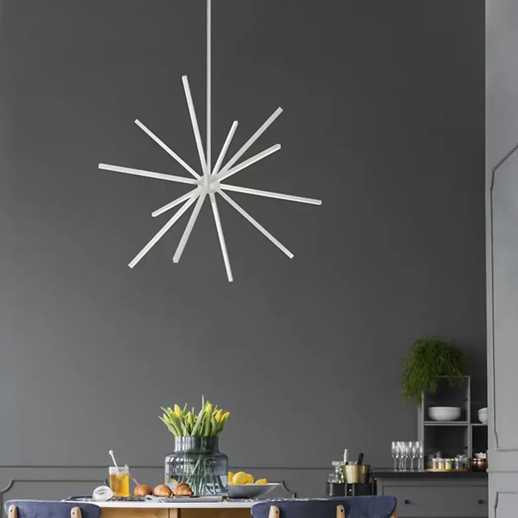 Of starbursts and satellites. The Sirius Minor LED Chandelier by Kuzco Lighting is inspired by an iconic mid-century modern design motif. Radiating from the center of the cluster formation are slender bars with frosted acrylic diffusers to create a light, airy look with a futuristic vibe perfect for contemporary living and dining spaces. With warm white illumination and dimming potential, this stylish ceiling fixture sets the tone for intimate evenings or chic dinner parties.