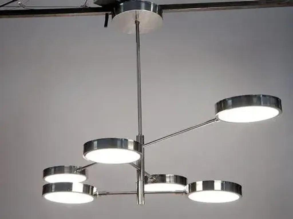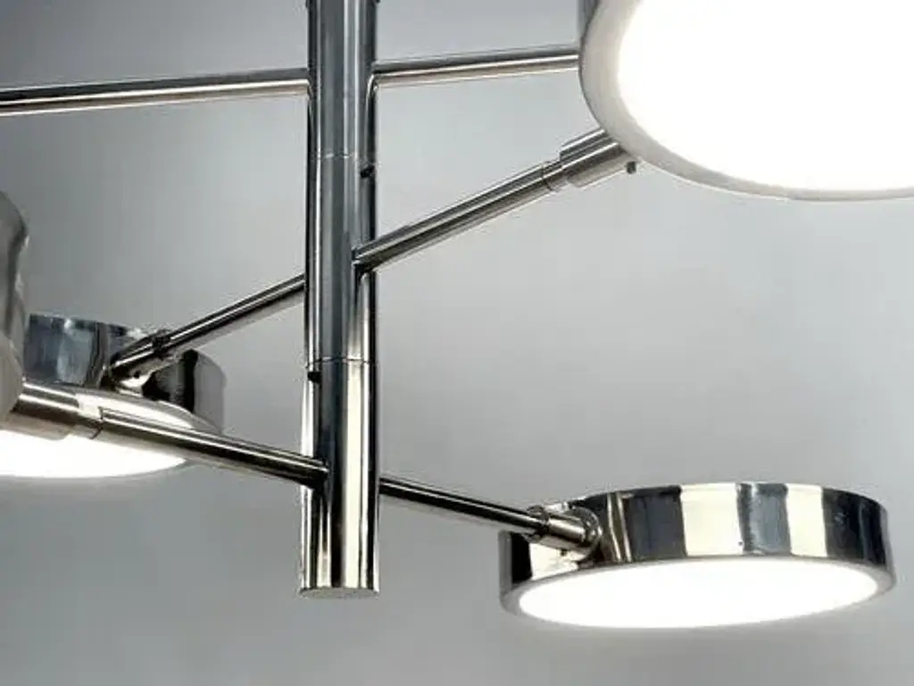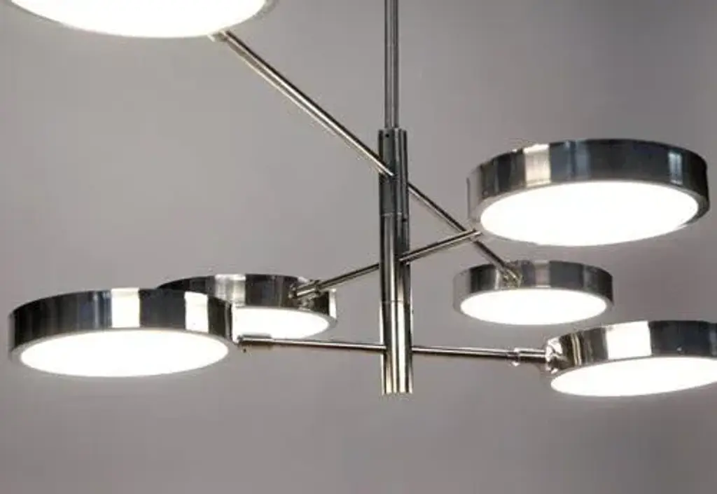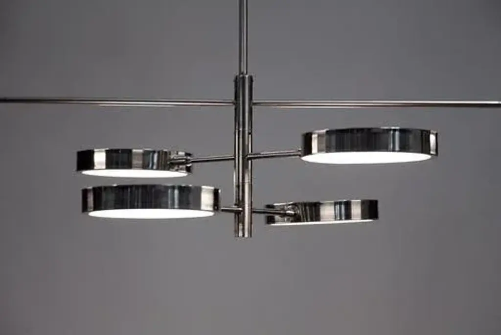 Brass Sistema chandelier, made with a nickel plated finish lightly brushed. This chandelier brings the popular chrome like finish to the Sistema and Sistema solare group. Labeled by Maker, Up to 250V (Europe/UK Standard).