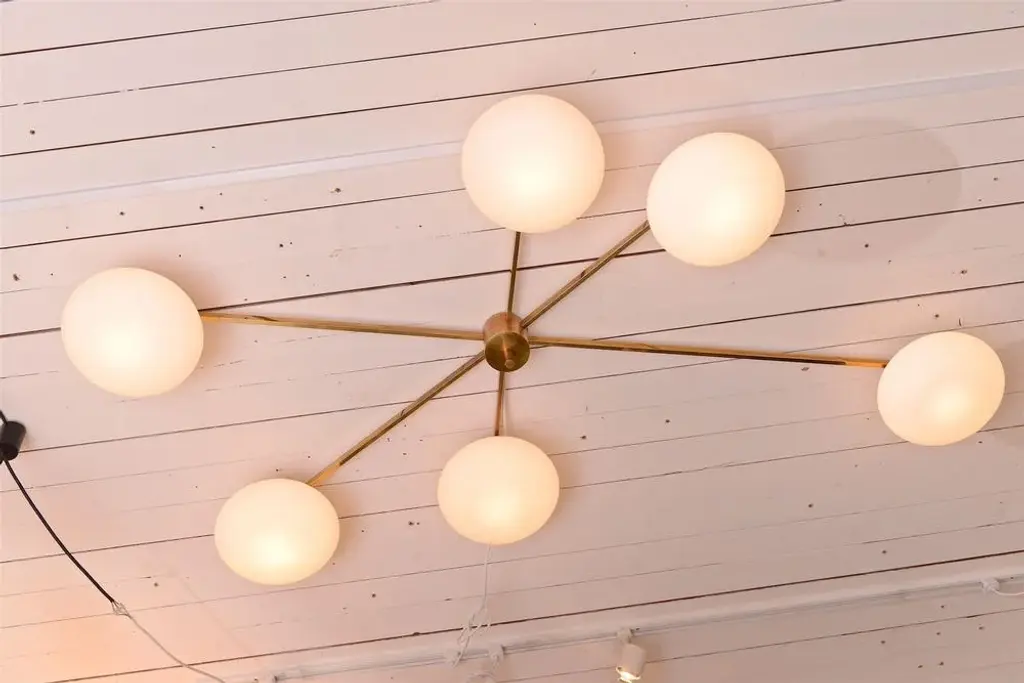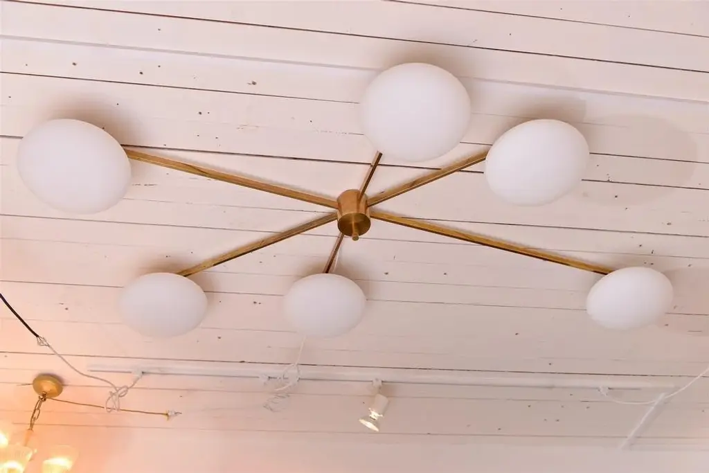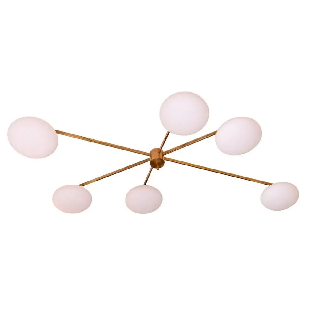 Six Arm Brass And Opaline Chandelier By Angelo Lelli