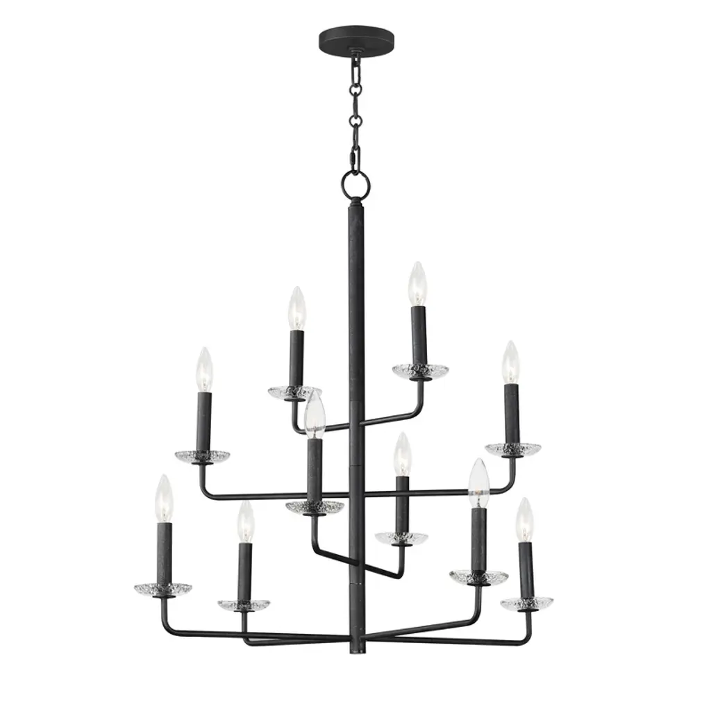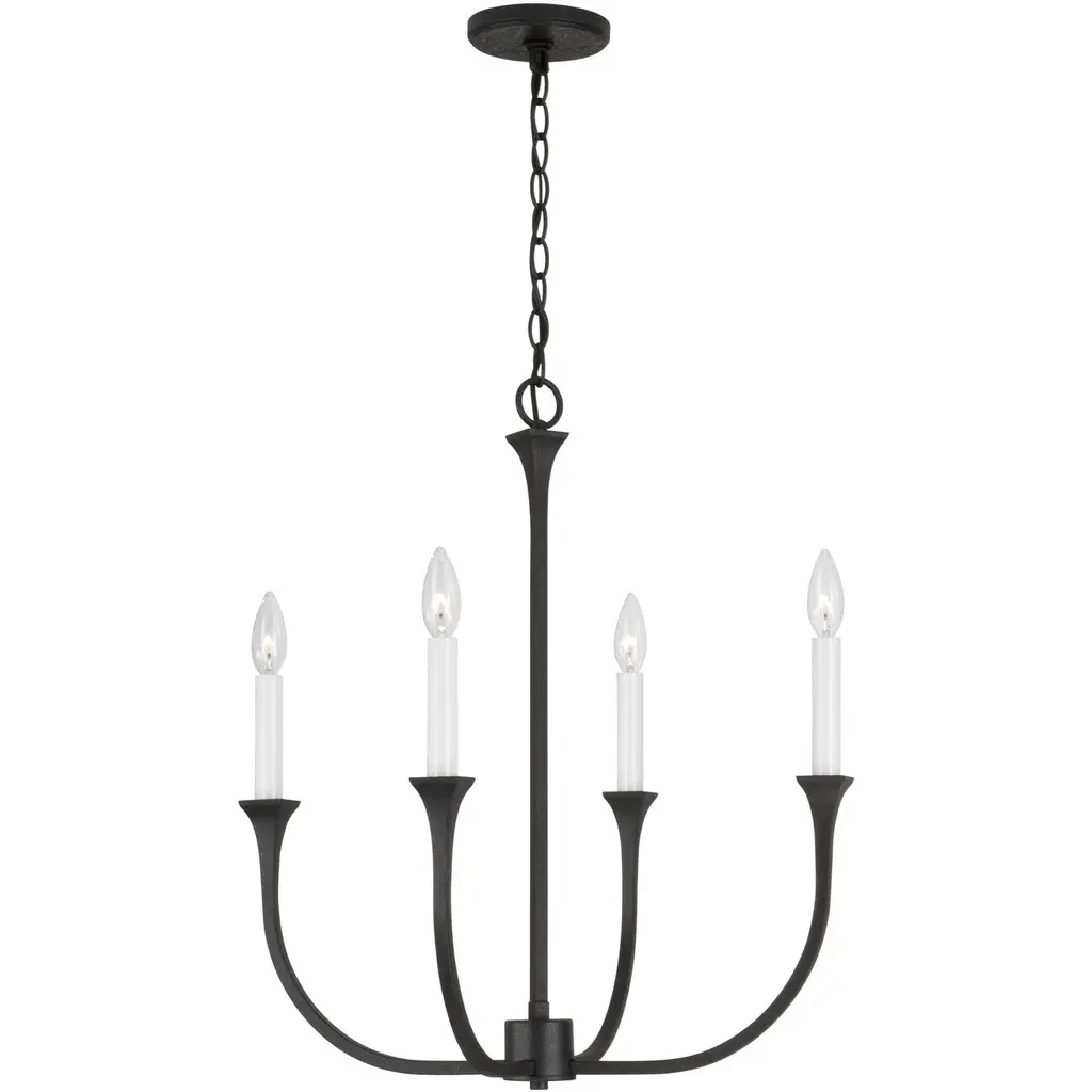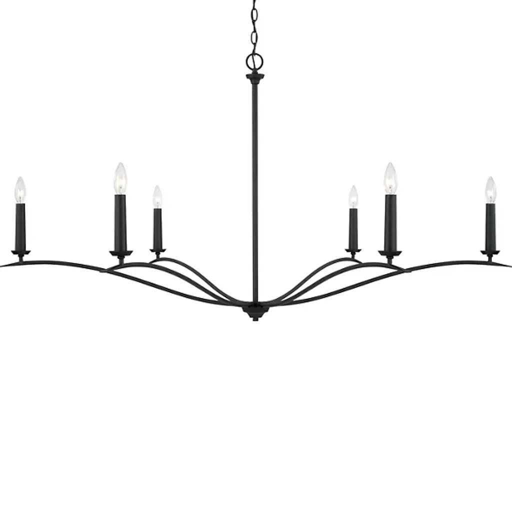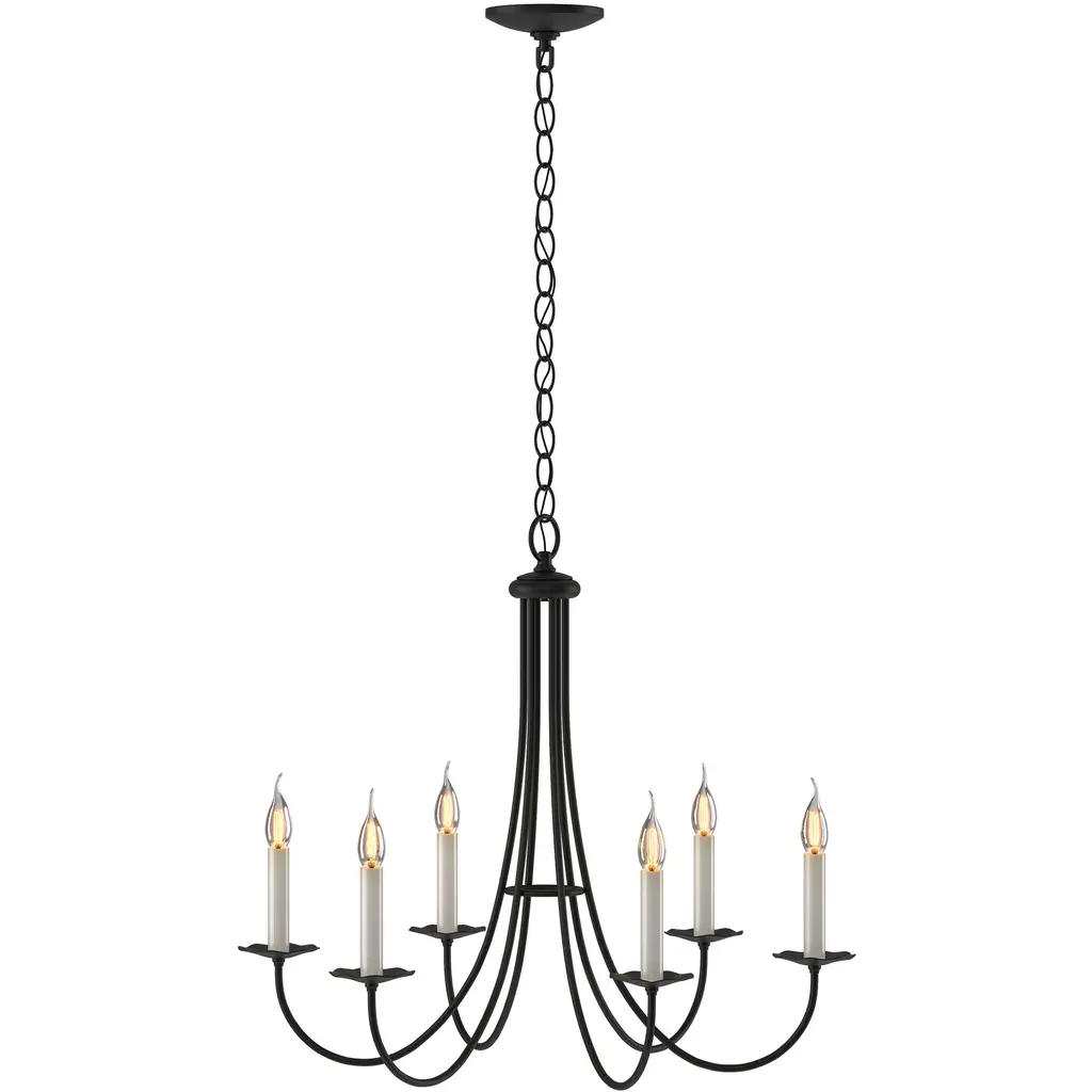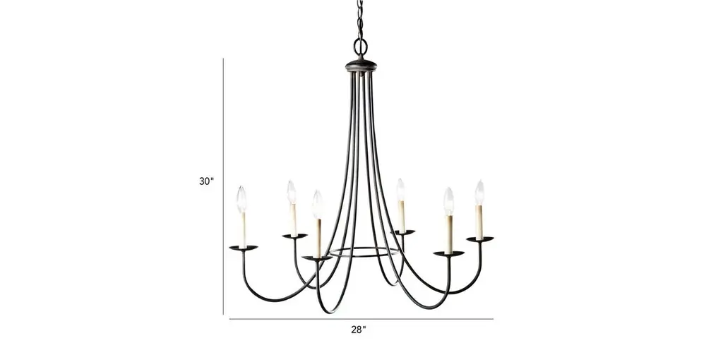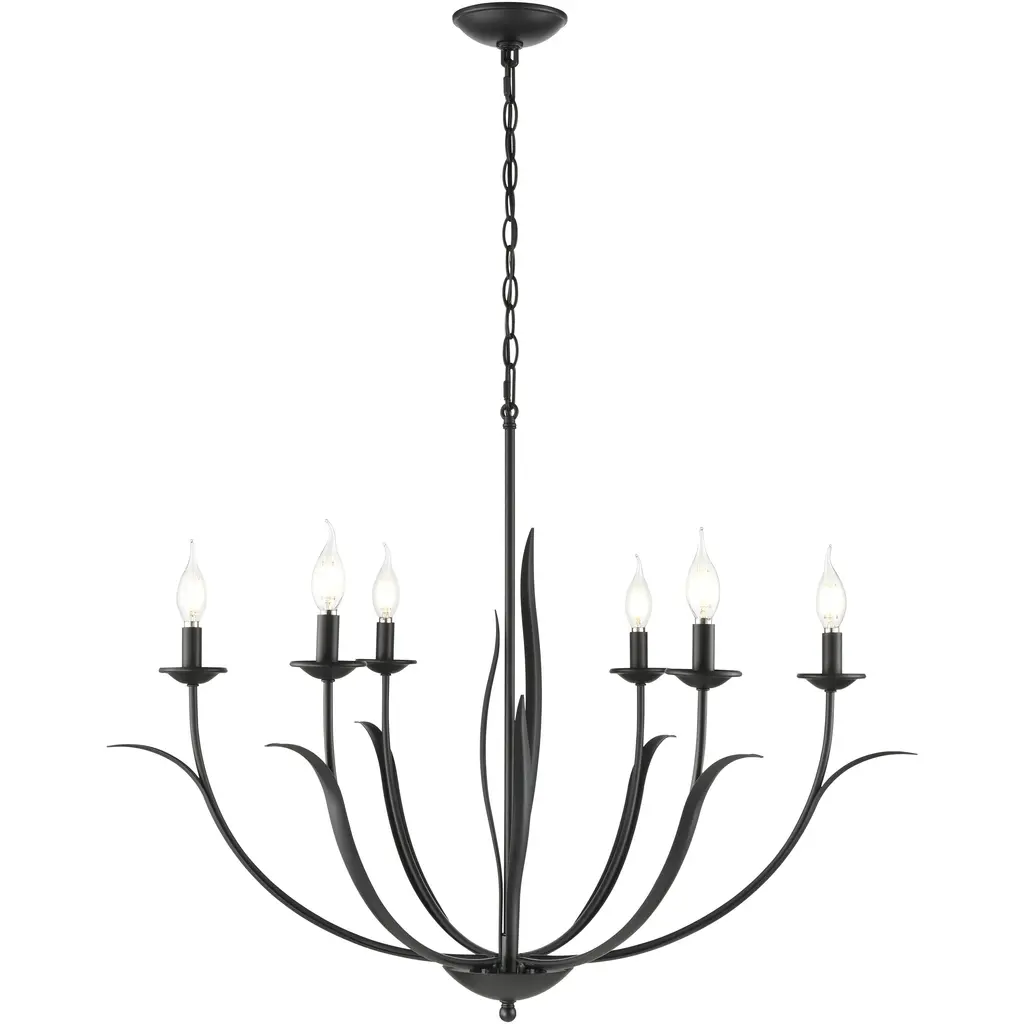 This graceful iron chandelier reimagines the classic six-light silhouette in an airy modern design. Its frame is beautifully crafted, with six sinuous candelabra arms that delicately extend from its center. Available in black, this chandelier exudes an easy, elegant ambiance that complements both casual and formal styles.
