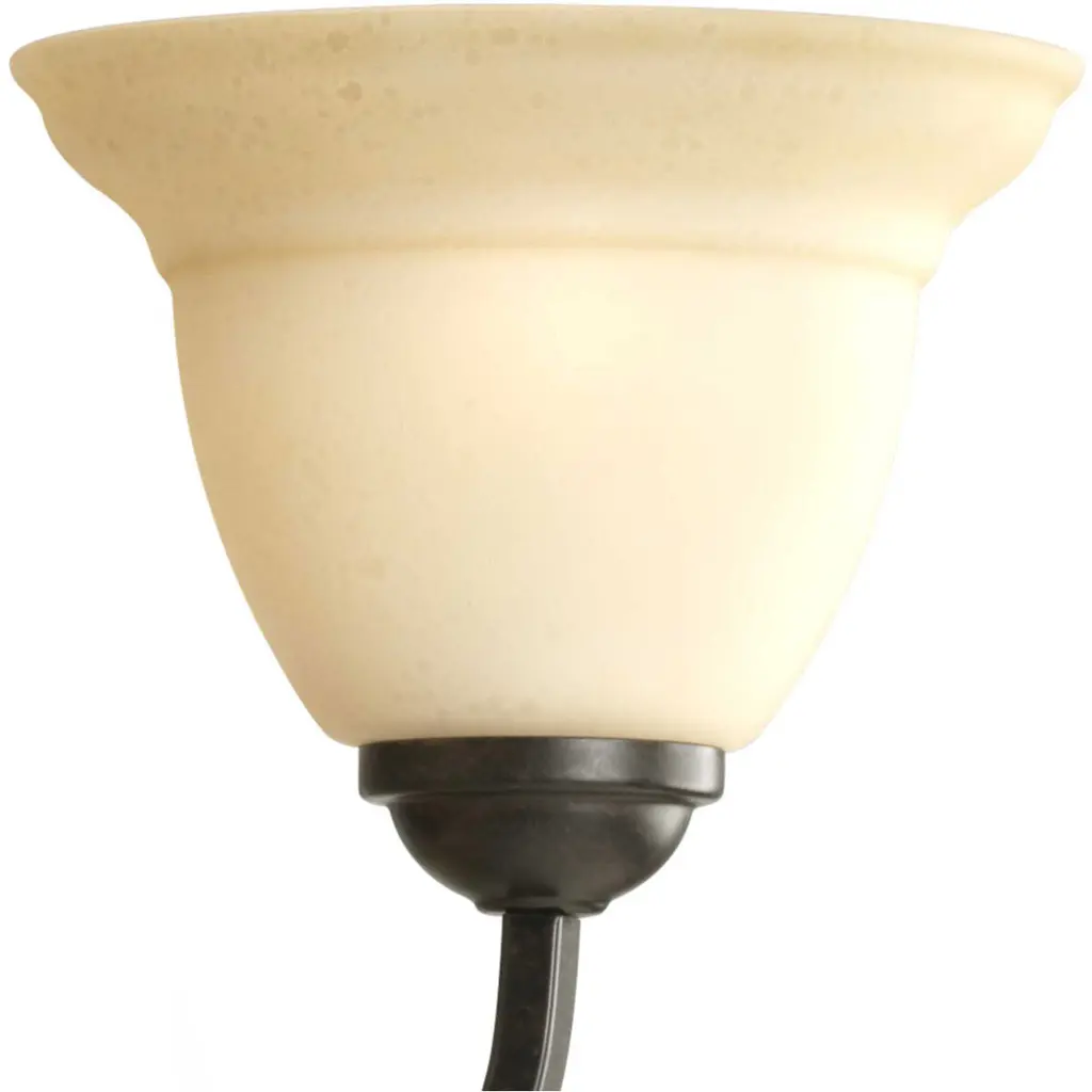 Five-light chandelier with tea stained oversized, bell-shaped glass bowls. Distinctive ebbing and flowing of squared scrolls and arms in Forged Bronze finish.