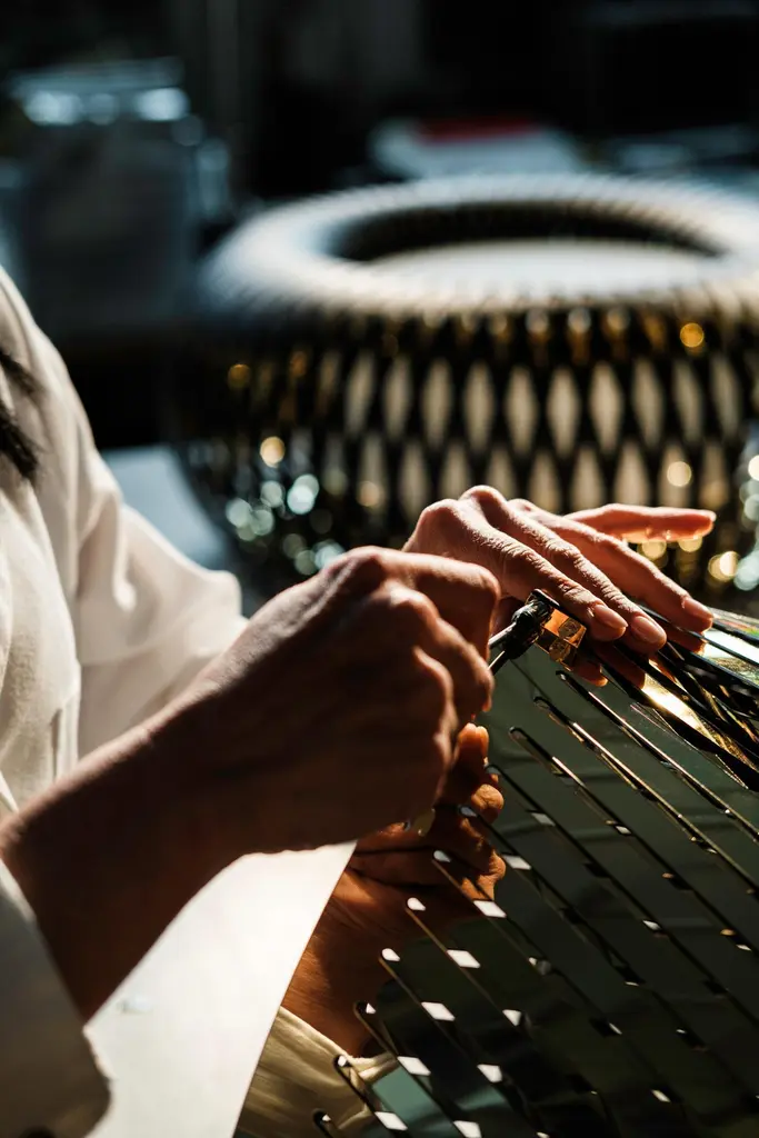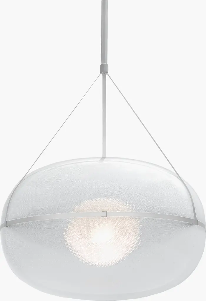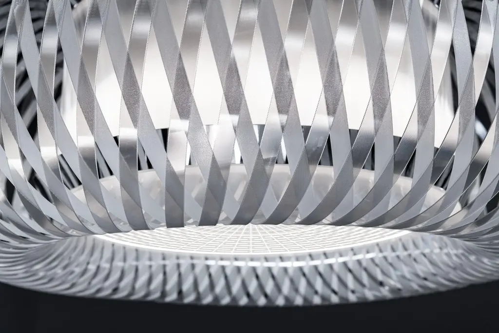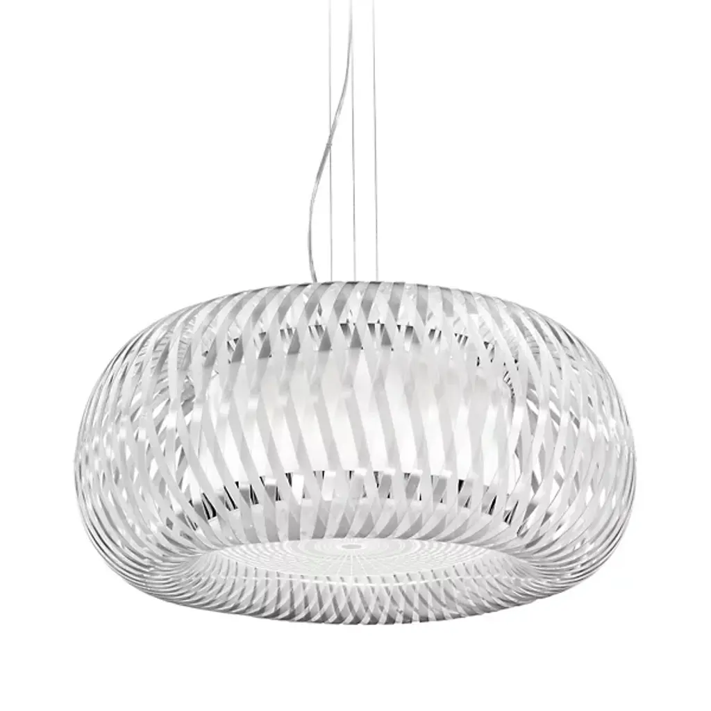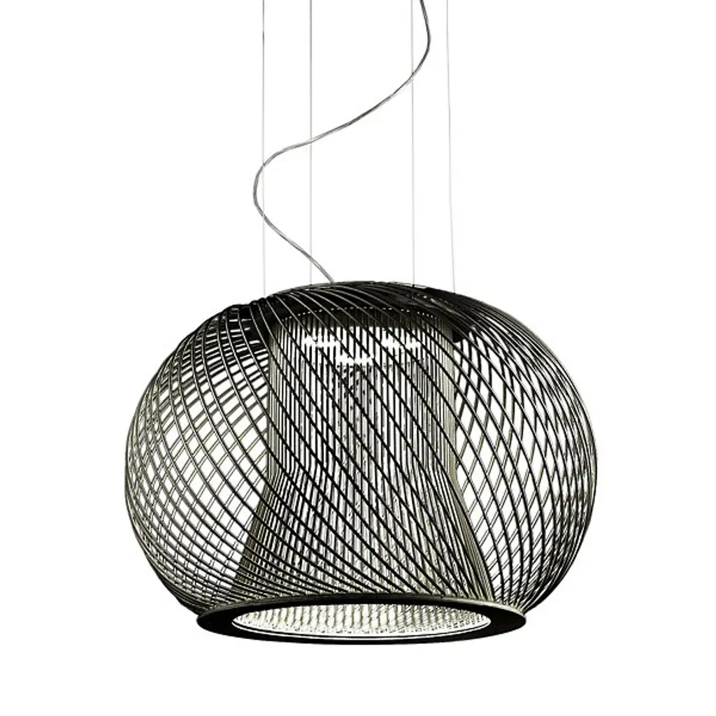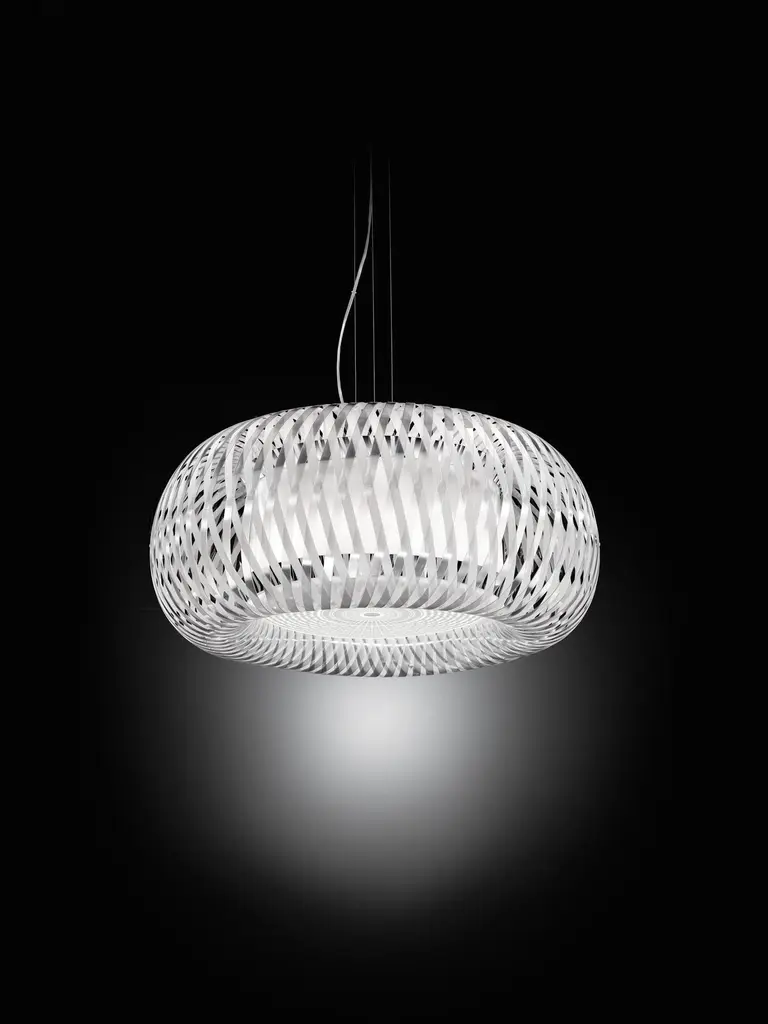 Inspired by the art of weaving, part of humanity from Prehistoric times in the form of baskets and cane sacks, Kalatos revisits these archetypes with a modern take using Slamp’s advanced technopolymers; the collection has both suspension and ceiling versions. They come in two color combinations: matte black with an internal gold finish, or white with transparent Lentiflex.Size: Ø 63 cm x H 30 cm / Ø 24-1/2” x H 11-3/4” maximum cable length 140 cm / 55”Available colors: Prisma, black/goldAvailable materials: Metallized polycarbonate or Lentiflex / polycarbonateWith: Magnetic systemLight source: 4 x 12W LED Filament.