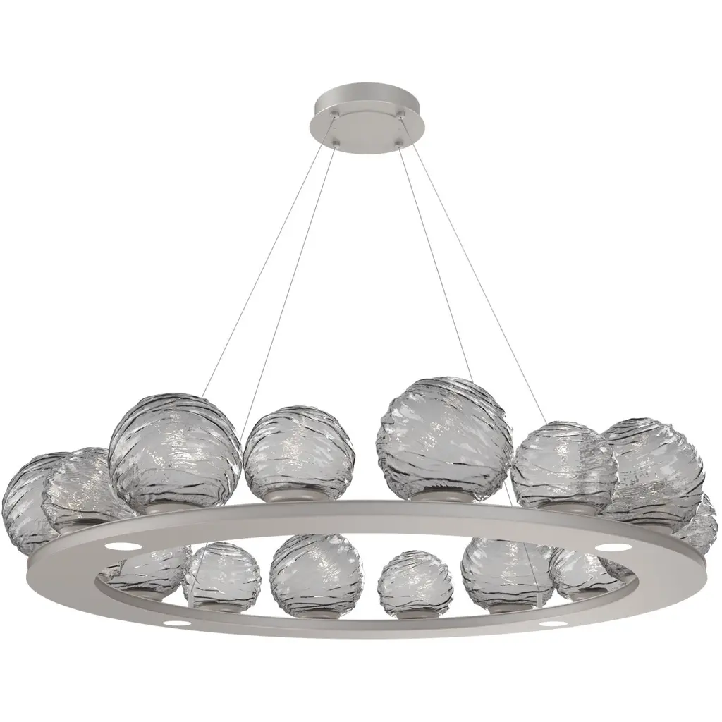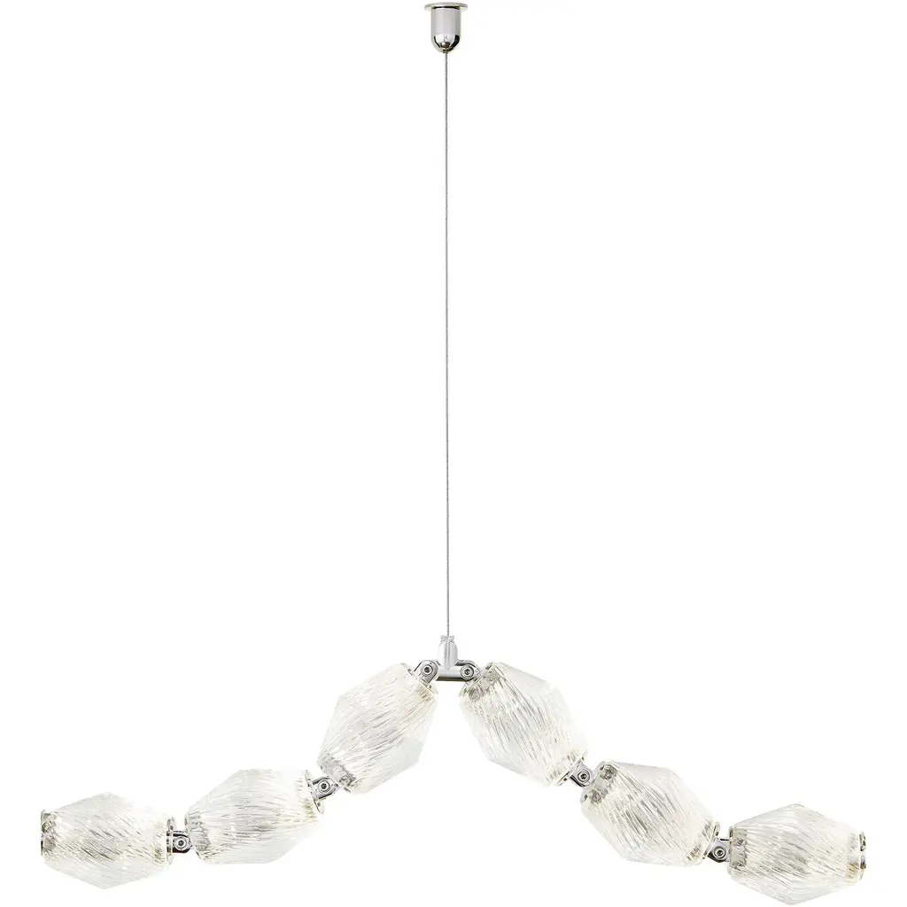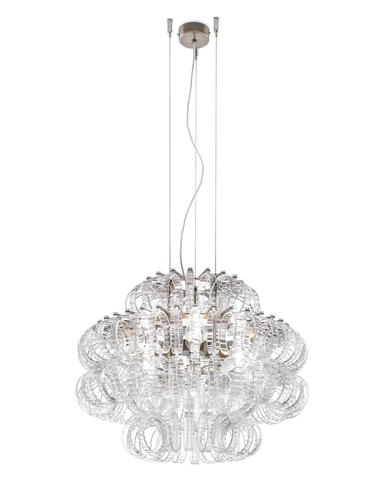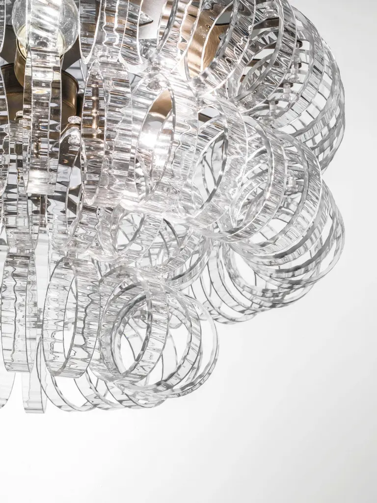 A system made with multiple glass rings, available in different colors and textures, which offers a high level of customization in terms of shape and size. Specifications:Light source: E26No of bulbs: 4×60W E26Dimmer: DIM 1Frame finish: Matte bronzeCable length maximum: 120 cm.