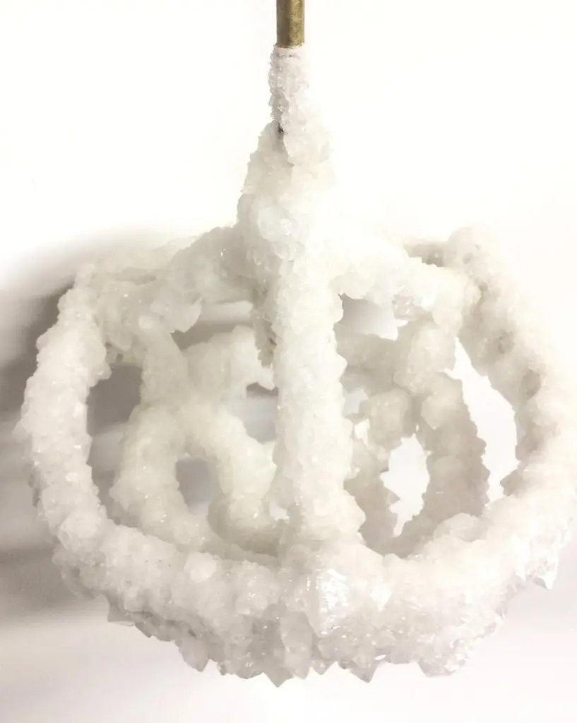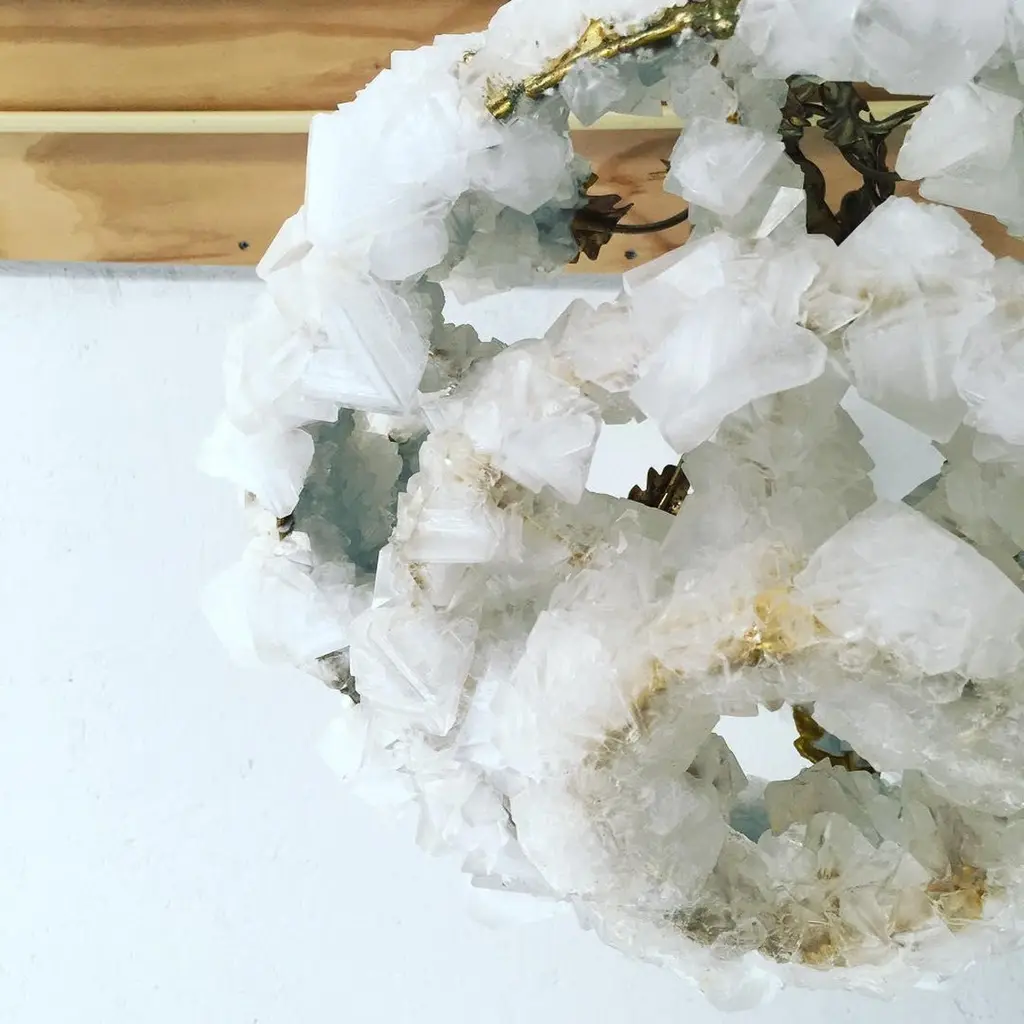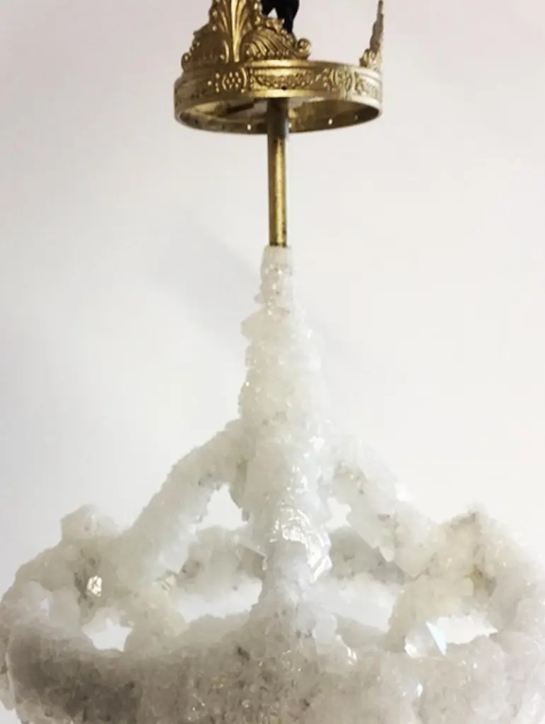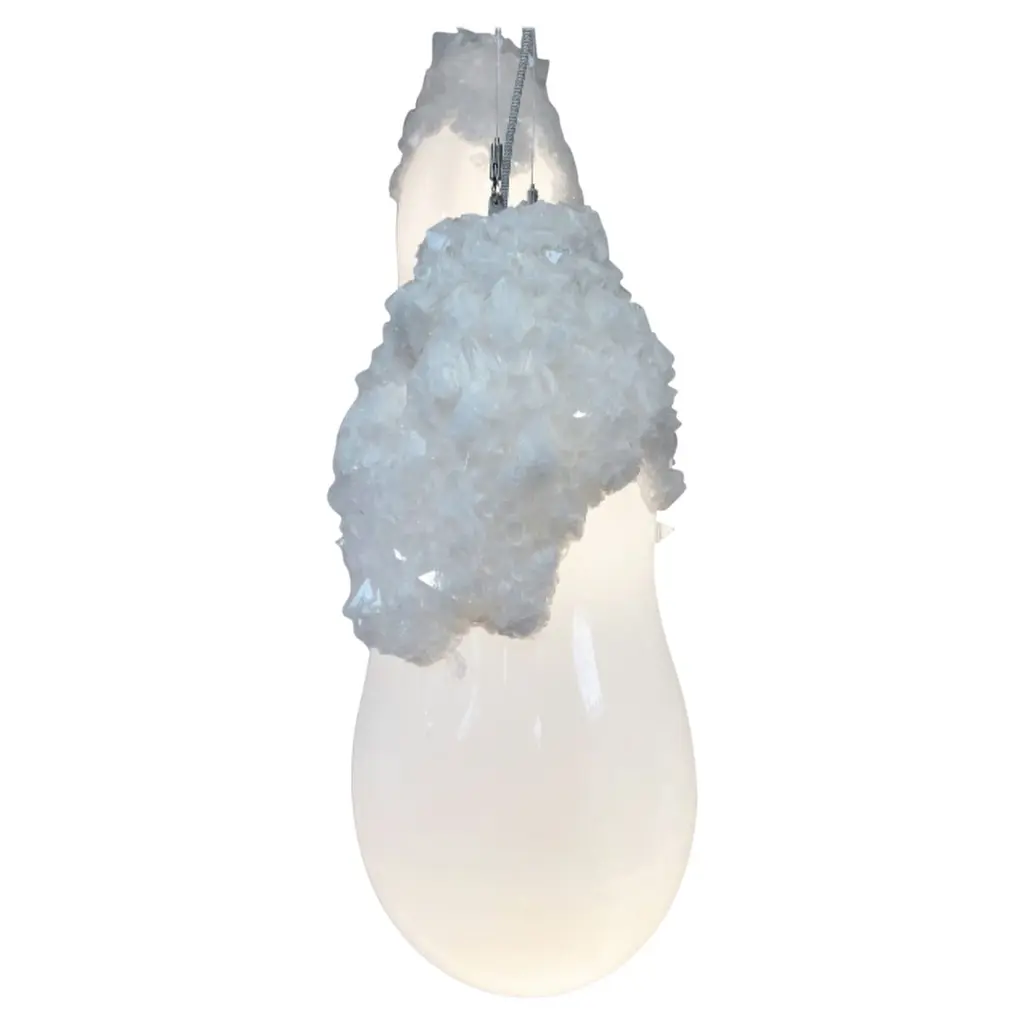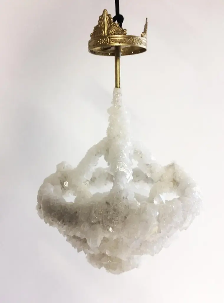 Small overgrown unique crystal chandelier, Mark SturkenboomDimensions: 45 x 30 x 30 cmMaterial: antique French chandelier, naturalGrown (white) crystalEdition: No. 3 / 25 unique piecesCrystal can also be in grey / black.This world is cluttered with stuff, how would the world look like a few thousand years from now?Overgrown is a series of chandeliers and candlesticks that appear to be relics from a desolate flooded world. Atelier Mark Sturkenboom designed a fluid which allows objects to grow crystals over a period of time. He reclaimed antique French chandeliers and created the perfect conditions to set a hyperevolution in motion.Every object grows out to be a unique piece.Mark Sturkenboom (Driebergen, 1983) is an artist that graduated with honors in 2012 at Artez Academy for the Arts in Arnhem/Netherlands. Since 2012 he works as a conceptual product designer/artist in his atelier in Utrecht.His work balances between art and design, he stretches the boundaries between art and design. He offers new viewpoints and rituals to deal with life.‘My focus lies not on the appearance of things, but on what I call the deeper layers in the relation between an object and its owner. ‘I try to call forward a myriad of associations and stimulate our thinking about what counts to us in our lives.I examine the meaning of objects and products and set them free from their conventional and initial use.’Sturkenboom reinterpretates products that are often intertwined with the themes love, time or has an inclination with a collective value perception.Engaging his work, you probably will need to start making ‘moral’ decisions. For instance his Ark, table clock, urn or vase are not just functional or only good looking.In their presence and while handling them they invite you to think about time, love passed or the possibility to free yourself from the burden of your possessions by destroying them.His work is exhibited and part of private collections worldwide, from New York to Shanghai, from Tokio to Amsterdam.