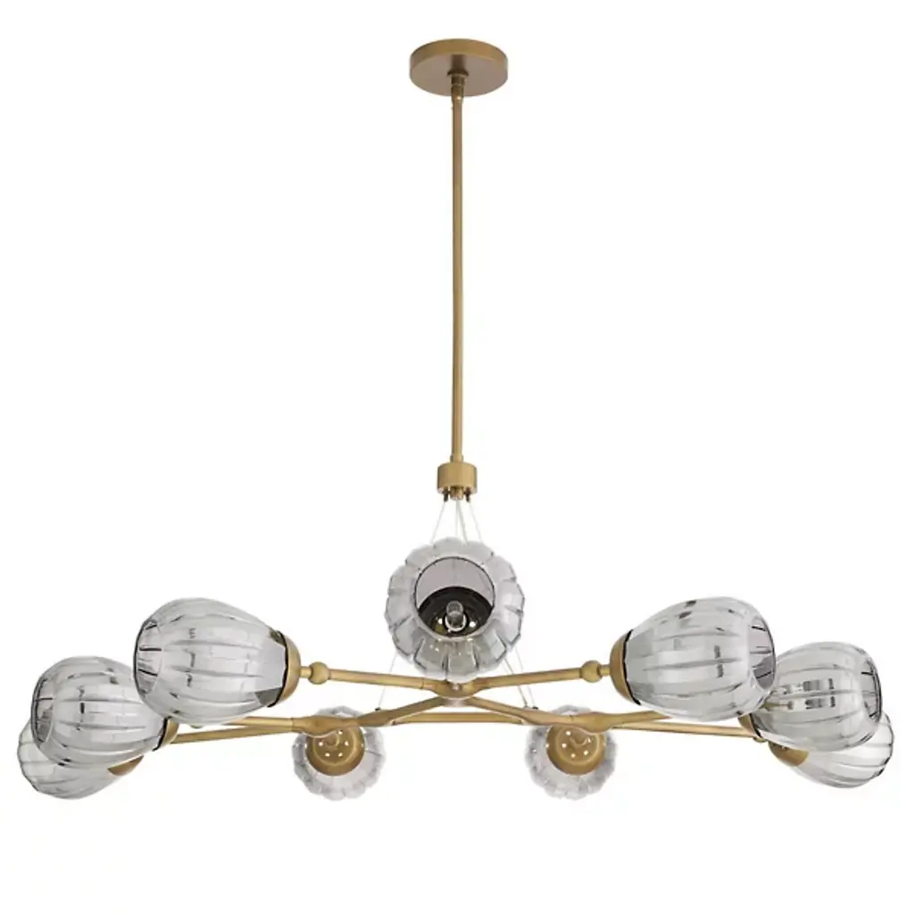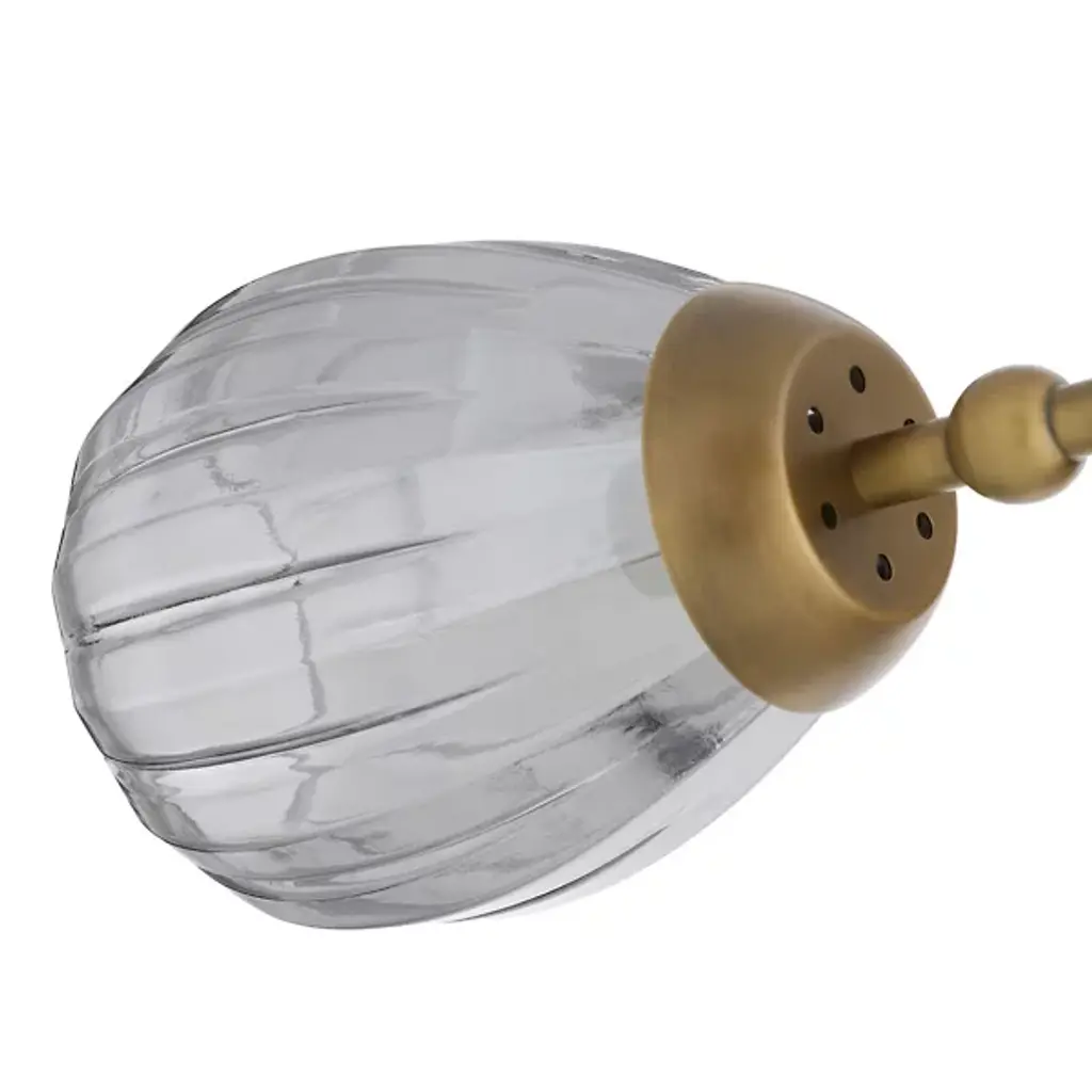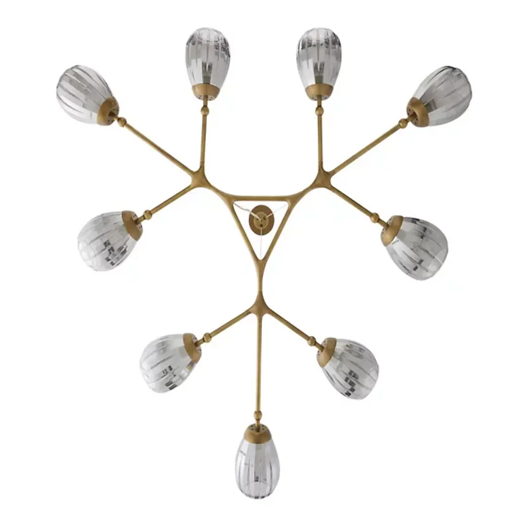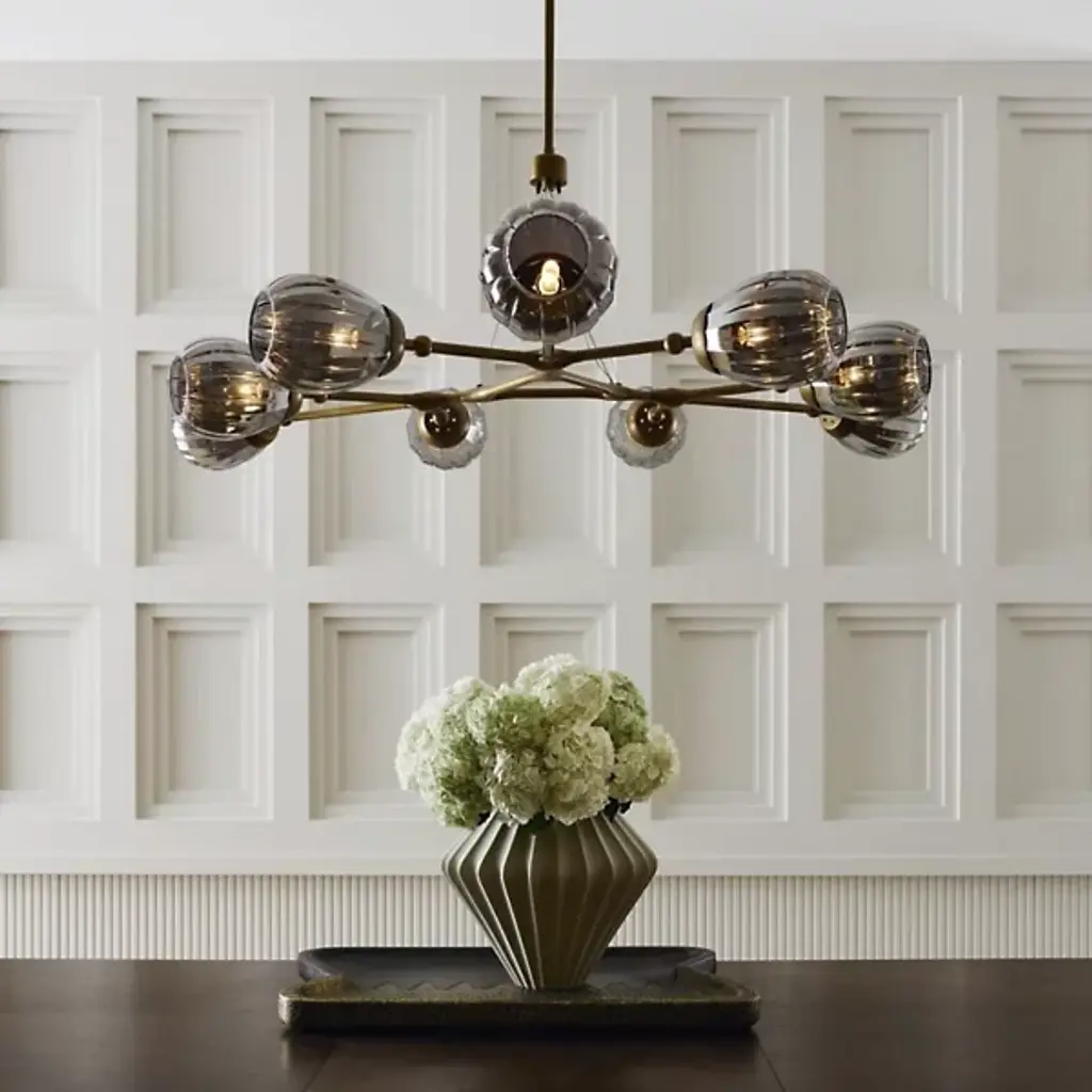 The Smyth Round Chandelier from Arteriors updates the traditional linear chandelier form with a symmetrical arrangement that radiates outward from a central triangular hub. Smoke luster glass globes feature fluted detailing. Aircraft wire suspension cables support the antique brass-plated steel framework while maintaining an airy appearance that works beautifully over dining tables or in living spaces with high ceilings. This branching design distributes light evenly throughout the room. Fluted glass elements catch and scatter illumination, producing rich textural effects that enhance both modern and traditional interiors.