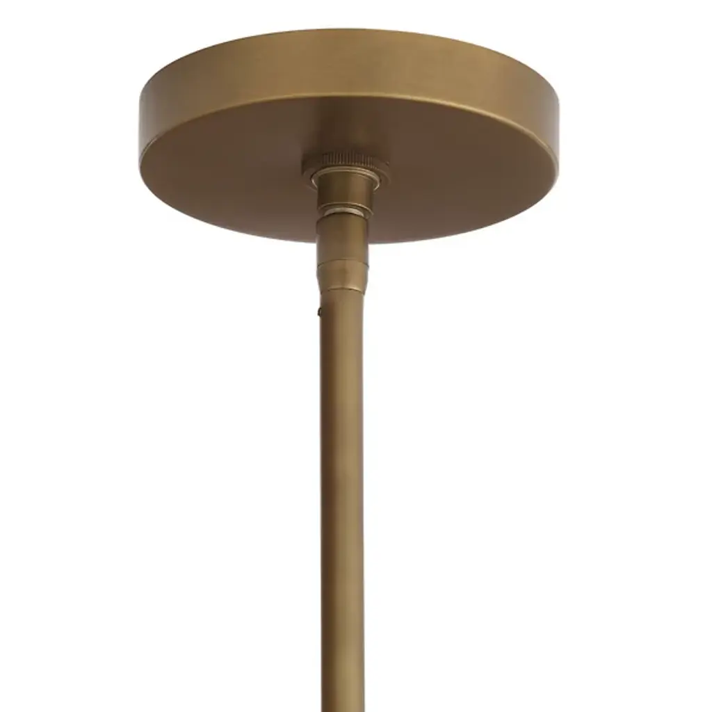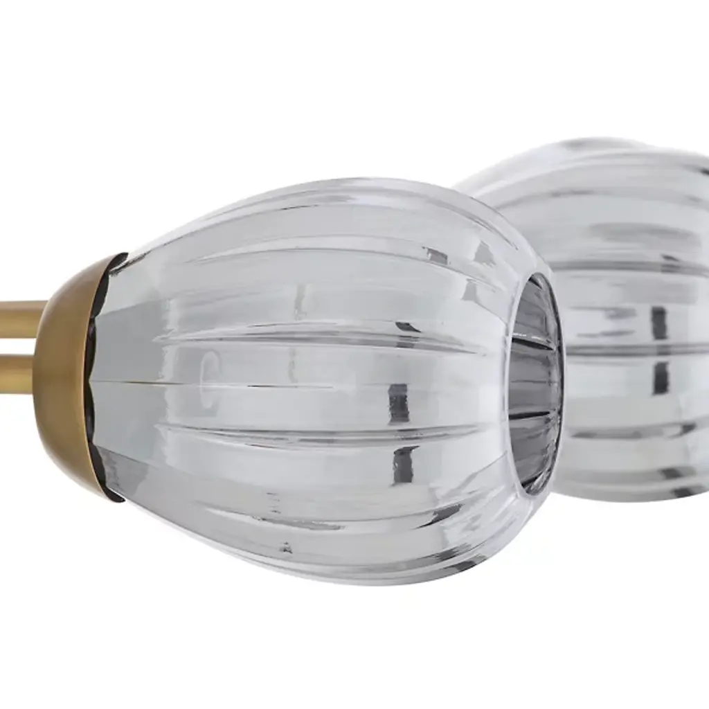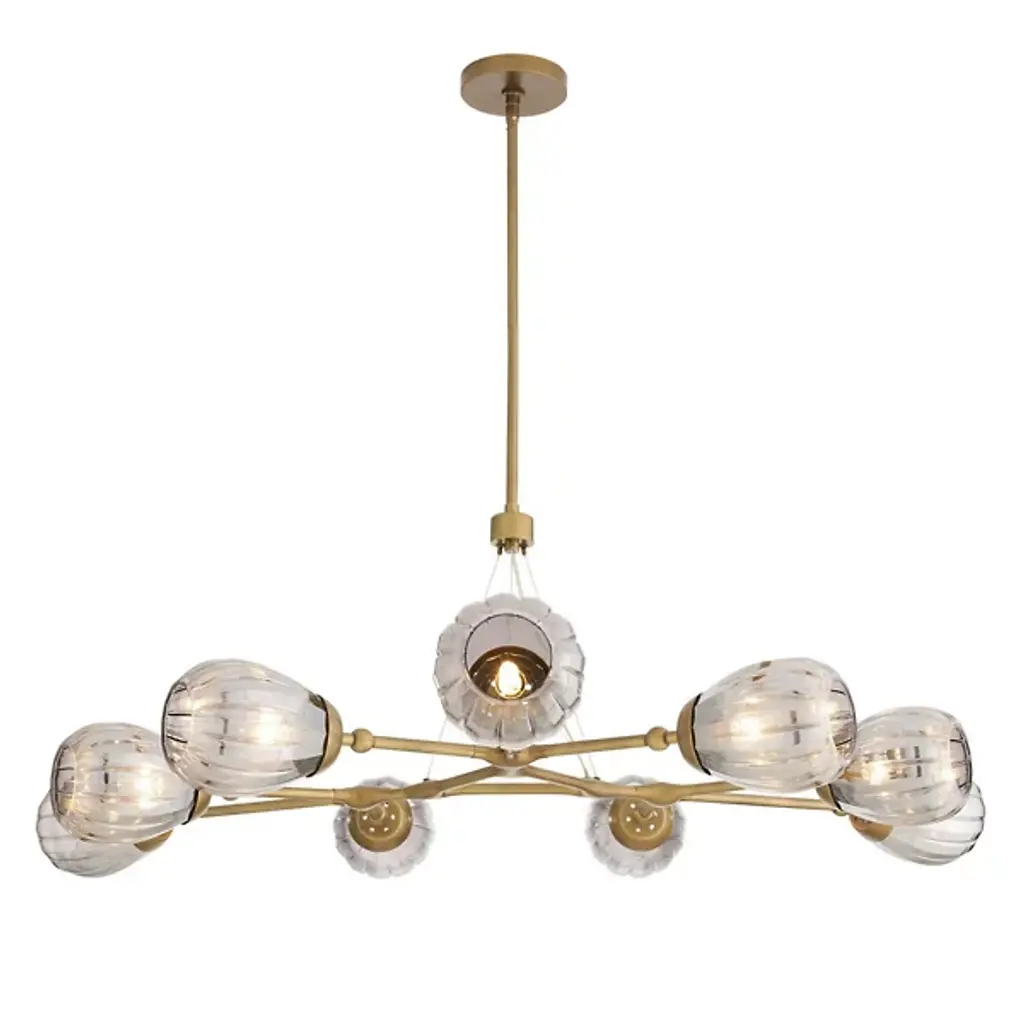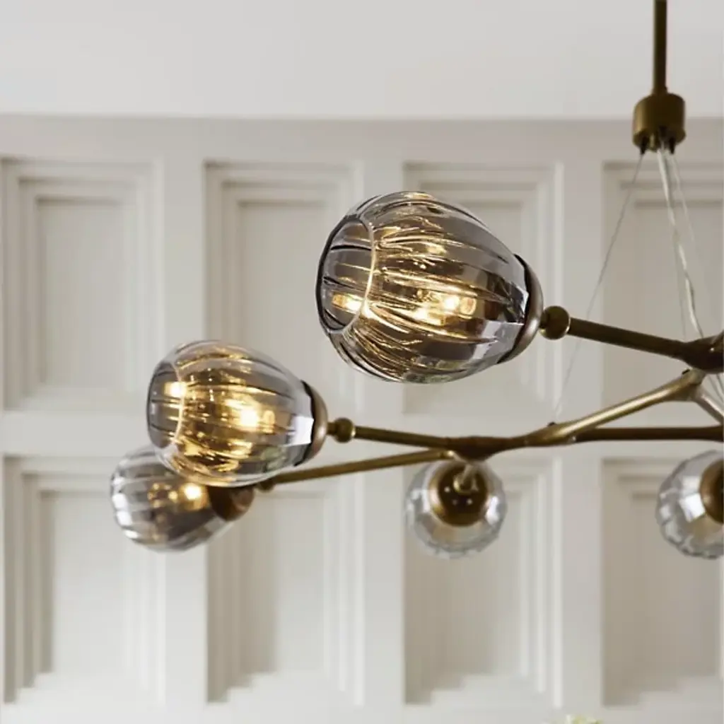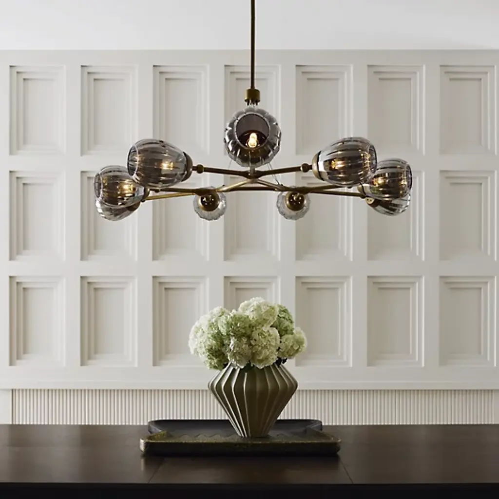 The Smyth Round Chandelier from Arteriors updates the traditional linear chandelier form with a symmetrical arrangement that radiates outward from a central triangular hub. Smoke luster glass globes feature fluted detailing. Aircraft wire suspension cables support the antique brass-plated steel framework while maintaining an airy appearance that works beautifully over dining tables or in living spaces with high ceilings. This branching design distributes light evenly throughout the room. Fluted glass elements catch and scatter illumination, producing rich textural effects that enhance both modern and traditional interiors.