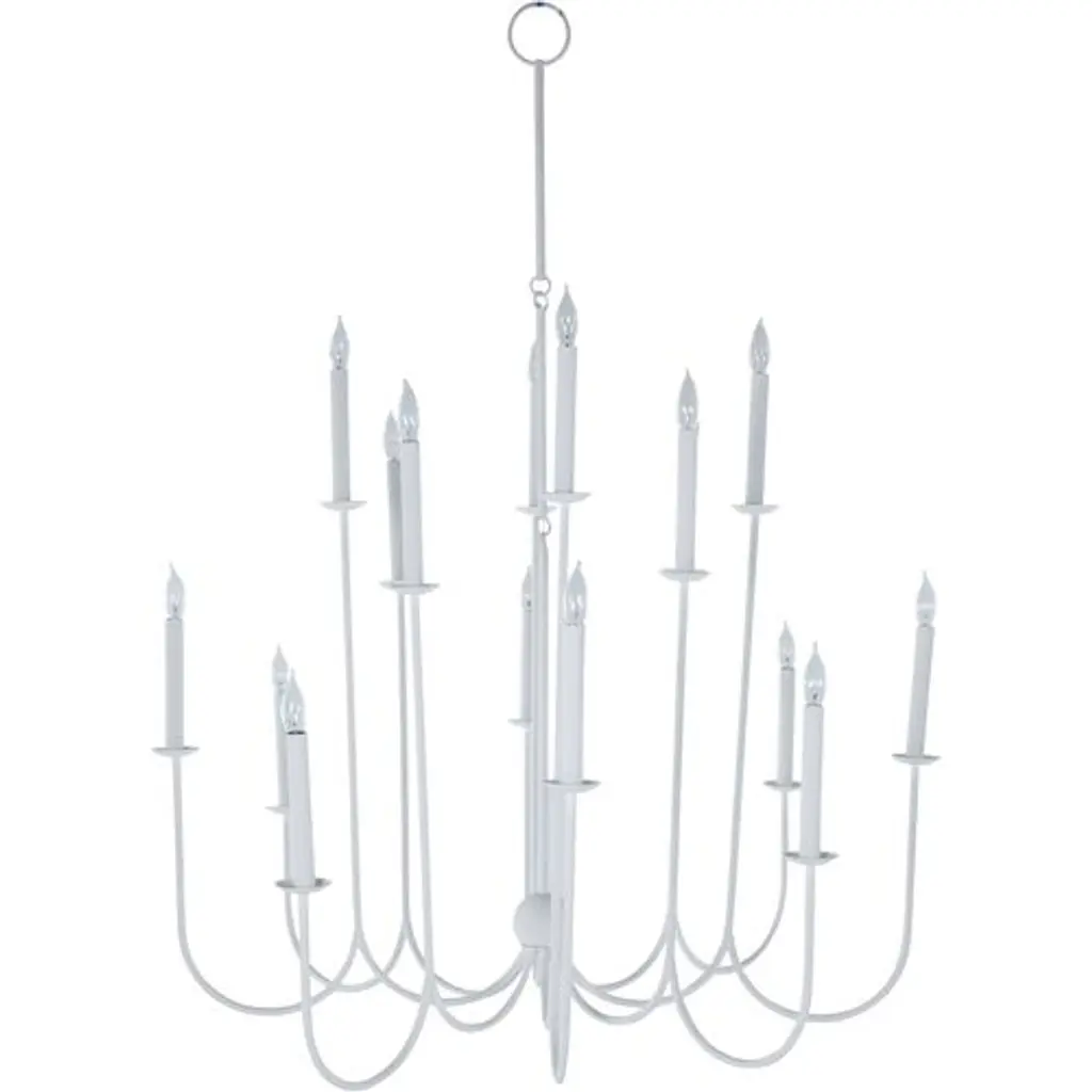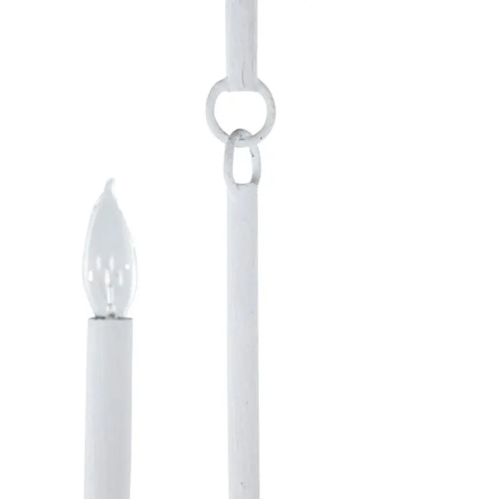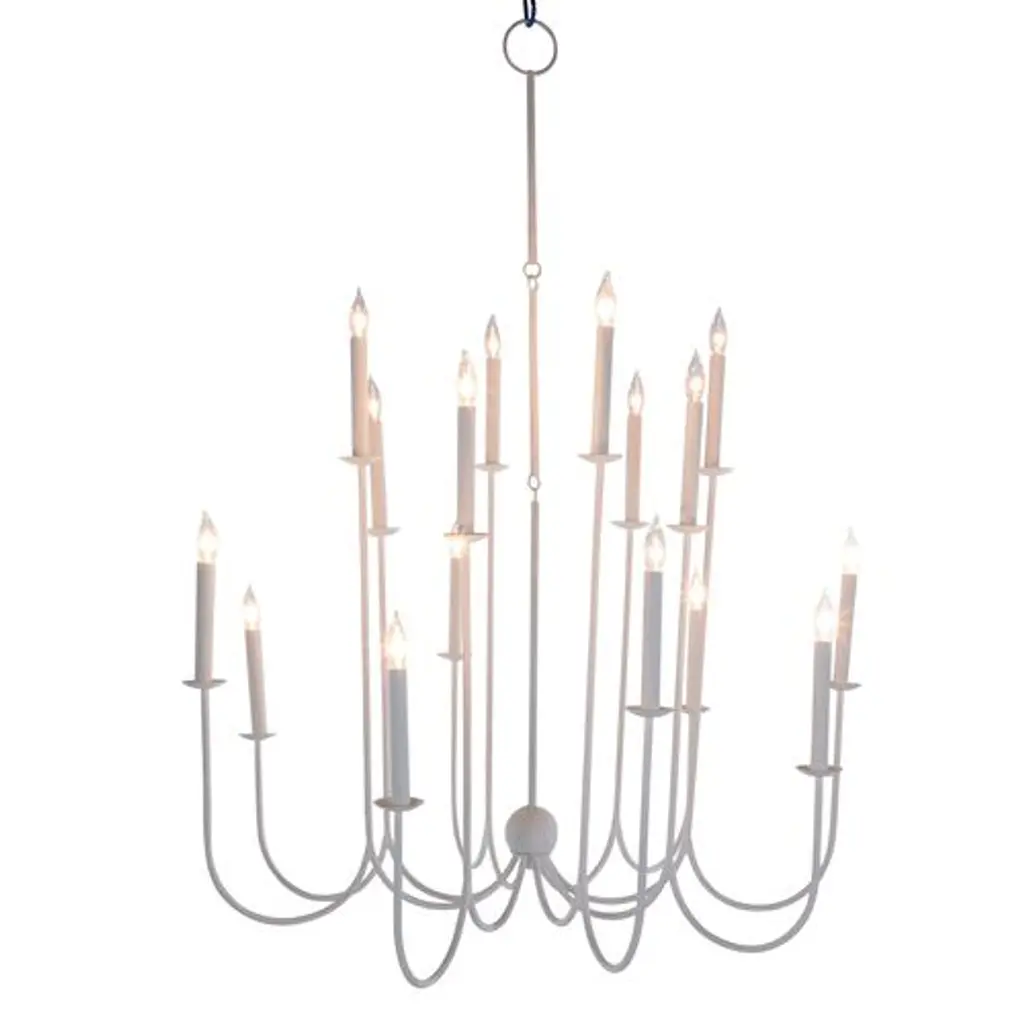 Eight slender arms, each of which holds two bulbs, extend from a center globe at varying heights, creating a chandelier that provides plenty of light as well as substantial elegance. The plaster white finish of the iron frame is both on trend and timeless.