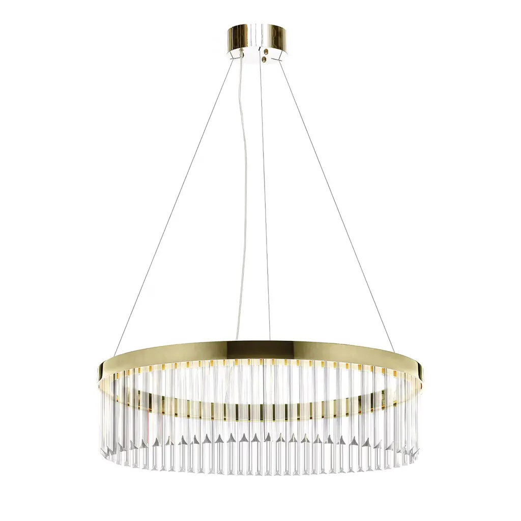 Fascinating turned on or off, this chandelier boasts a majestic design rich in precious details blending lavish finishes and materials. A circumference of juxtaposed trihedron clear glass elements descends from the ring-like frame in gold-finished brass, which hosts the light source within its glistening body. Ultra-thin elements keep the frame efficiently suspended and steadily fastened thanks to the matching cylindrical ceiling mount.