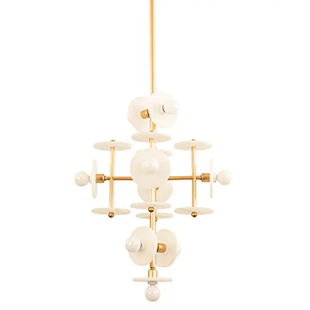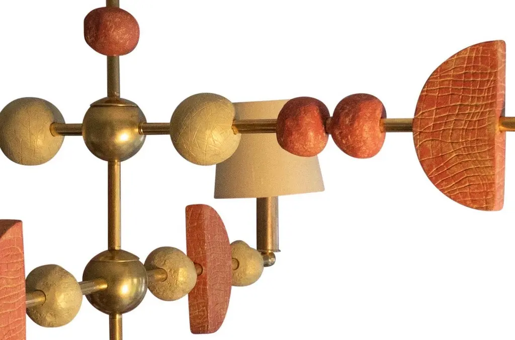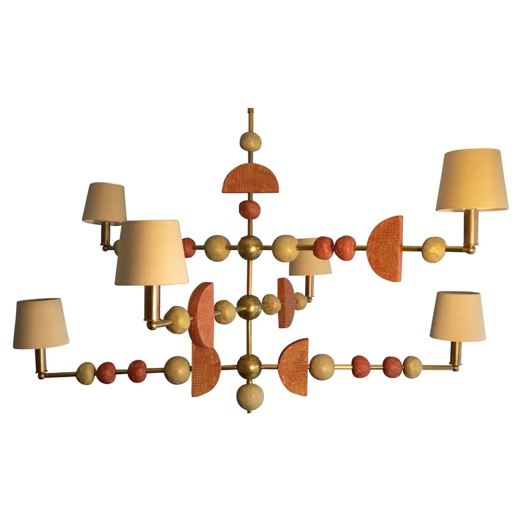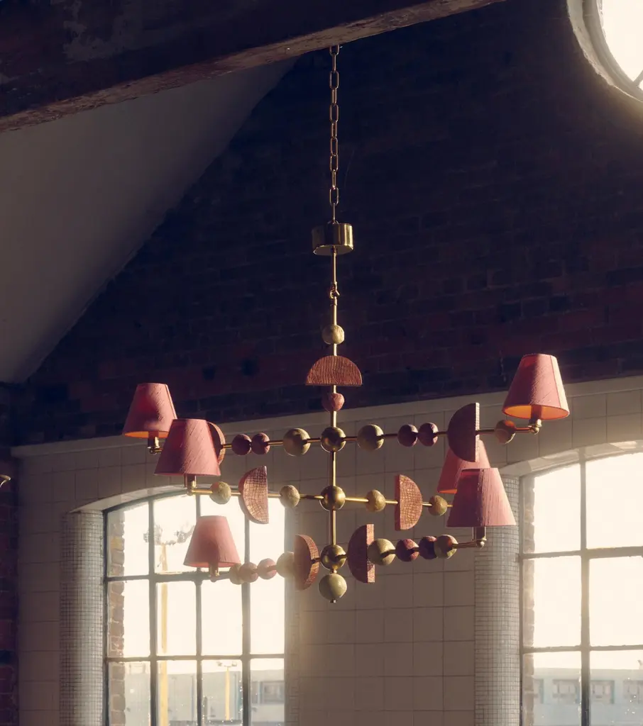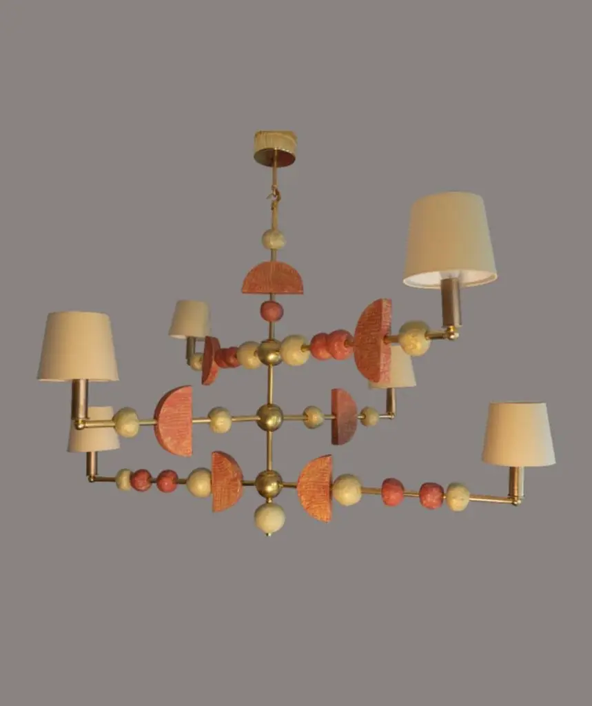 Soho Chandelier, Contemporary, Sculptural In Brass With Silk Coral Lampshades