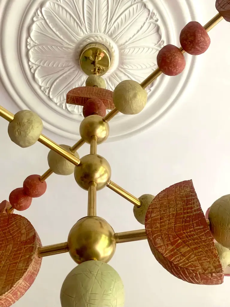This contemporary three-tier chandelier by Margit Wittig features sculptural components with organic and subtle textures, all cast and treated with multiple layers of patina in her London studio. The contrast of a soft, dark blush-rose colour, gold-waxed resin and brass, is the signature to Wittig's work. Her designs are functional objects and sculptures that move fluidly between figurative and abstract motifs.Margit Wittig is inspired by modern artists and sculptors such as Giacometti and Ivon Hitchens. Her work is constantly evolving using different textures as the driving force - intertwined with her work with color. Her functional art spreads the gamut from modern simplicity to rich and complex designs and color. Her pieces are placed with collectors around the globe.Please note: Although our lights are wired using UL listed and certified components for the US, each light fitting is not UL listed.