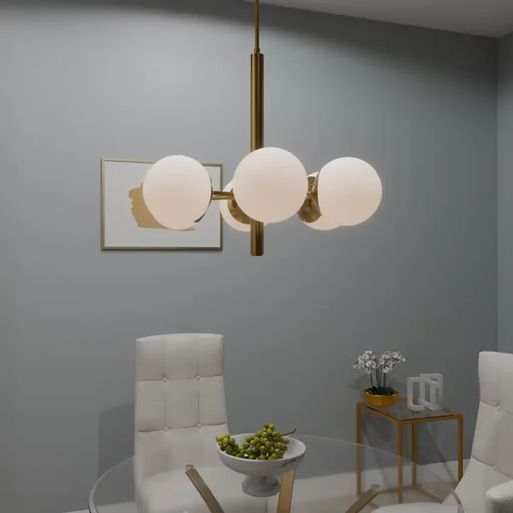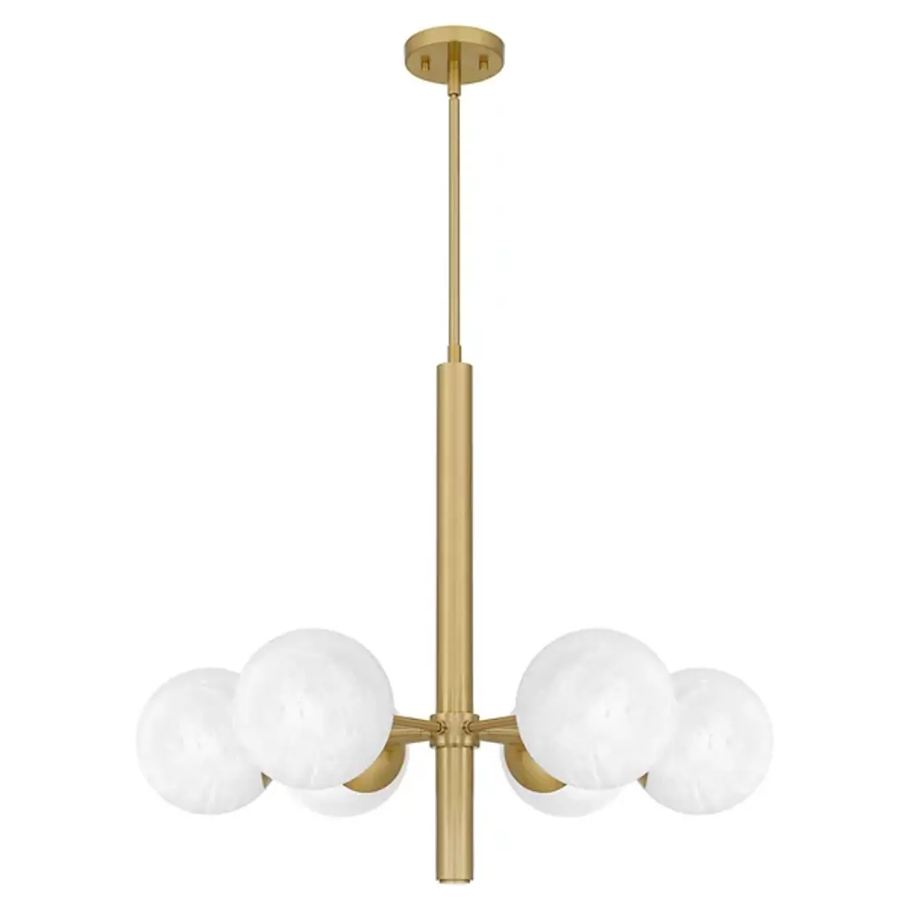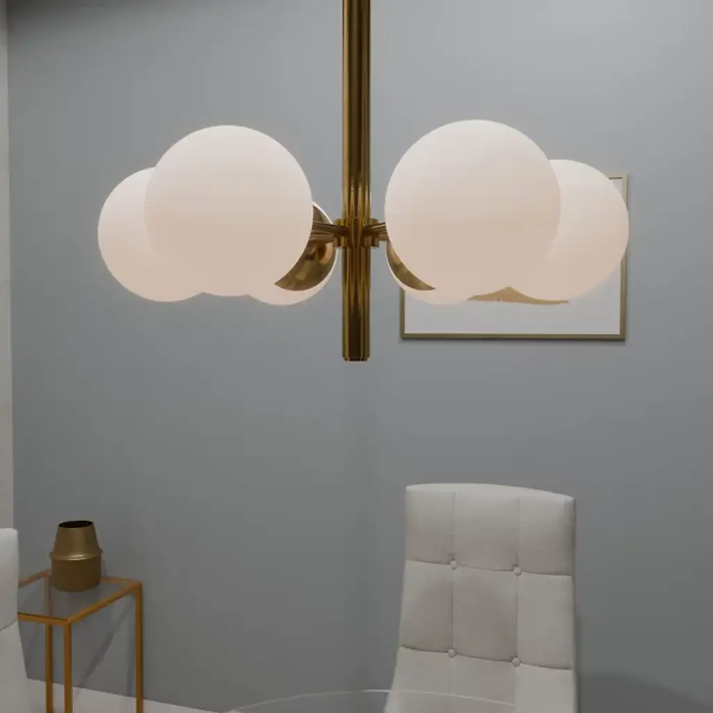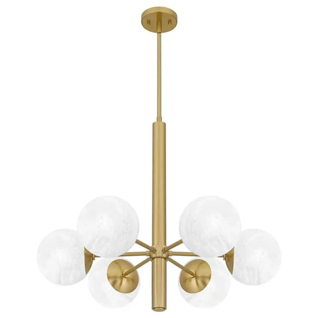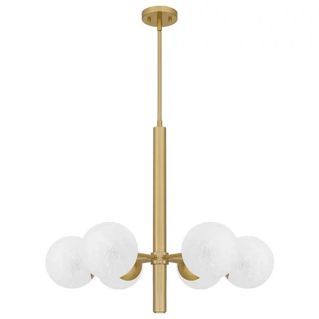 Bask in the ethereal glow cast by the Solei Chandelier from Quoizel, adorned with cloud glass orbs that emanate a stunning radiance. This mini globe chandelier boasts a distinctive silhouette finished in aged brass, infusing a touch of opulent elegance into its transitional design. Handcrafted cloud glass ensures that each globe possesses a unique charm, adding to the chandelier's allure. Suspended from a circular canopy, a cylinder body extends from a slender stem, featuring slim branches that house the cloud glass spheres and evoke a mid-century modern aesthetic, adding a warm ambiance to any space.