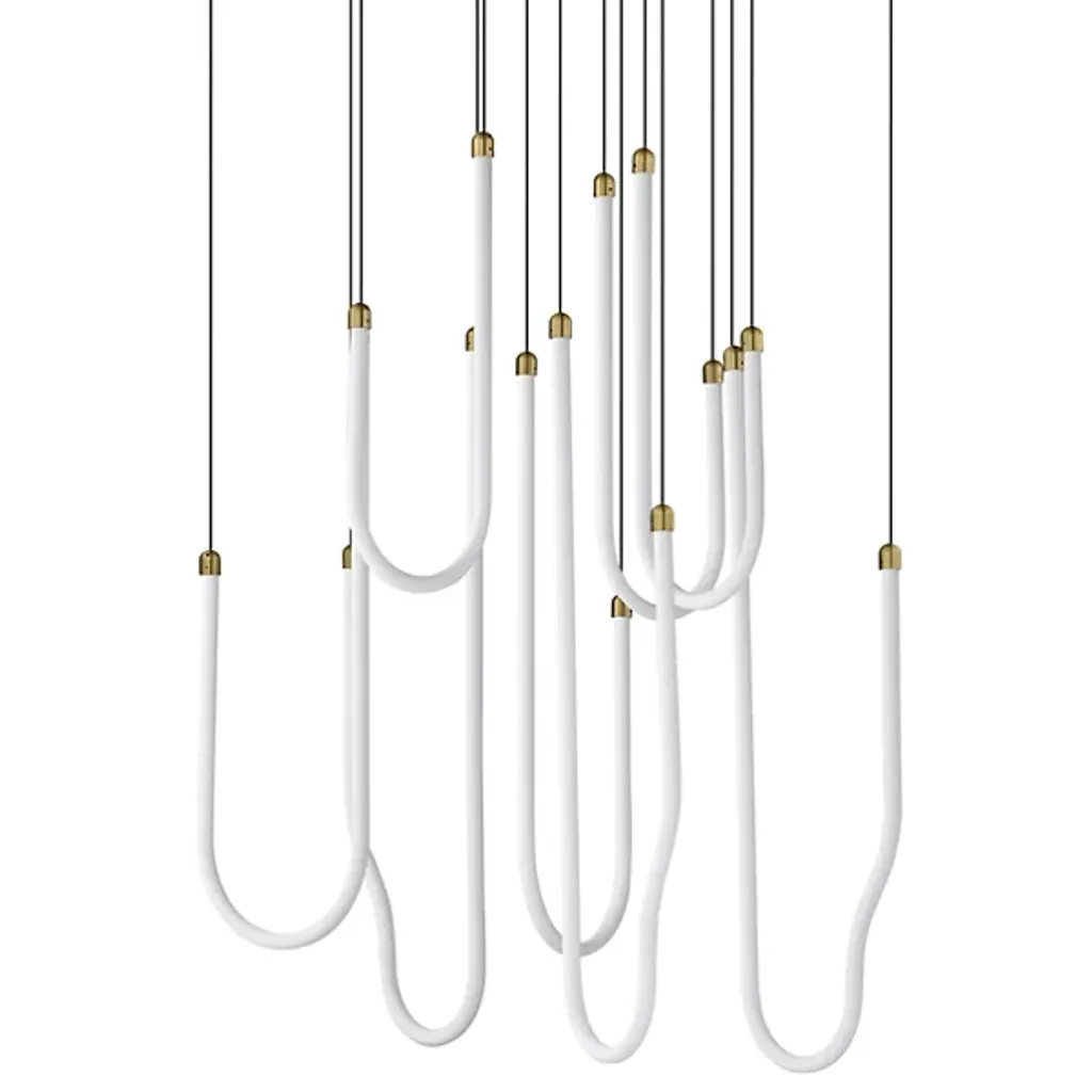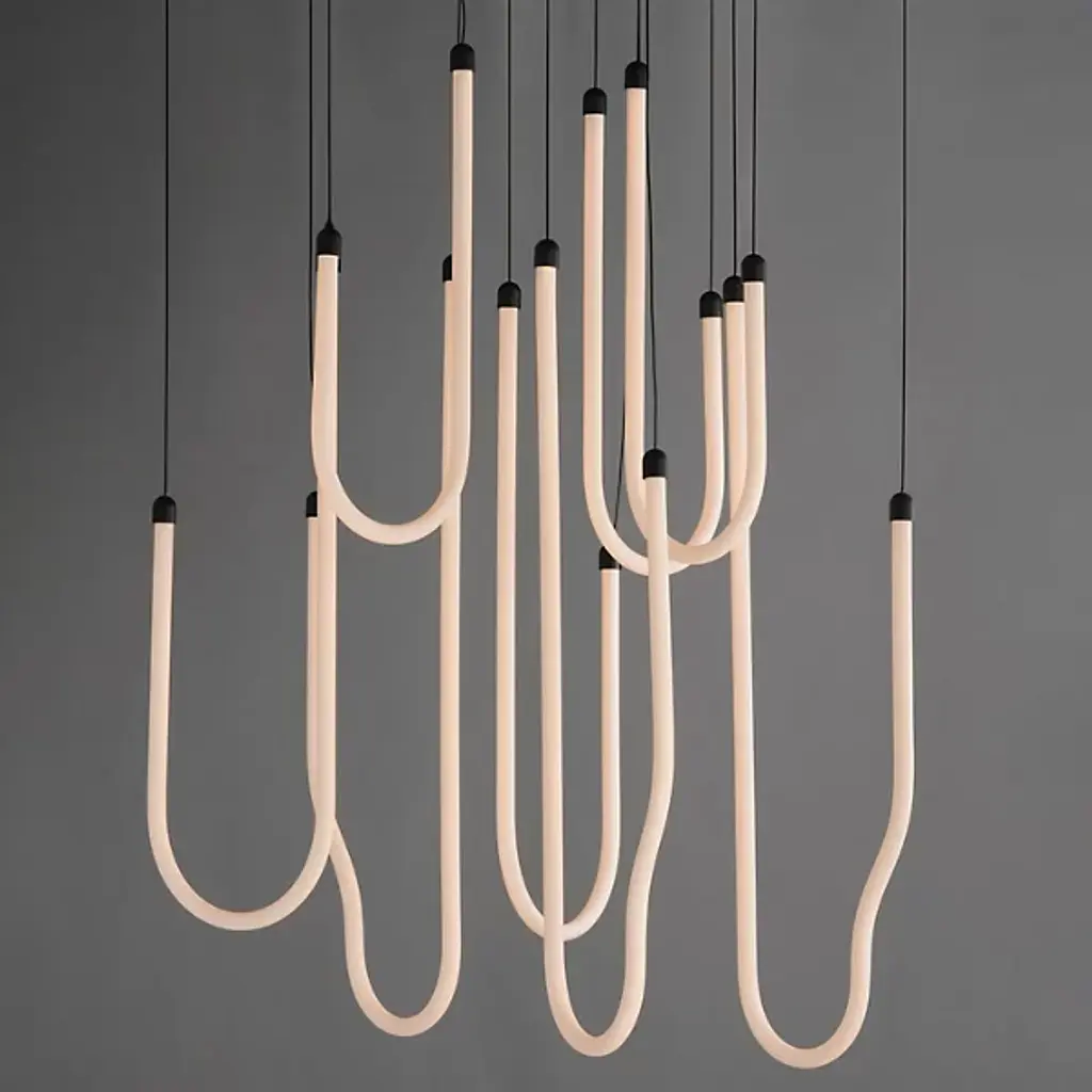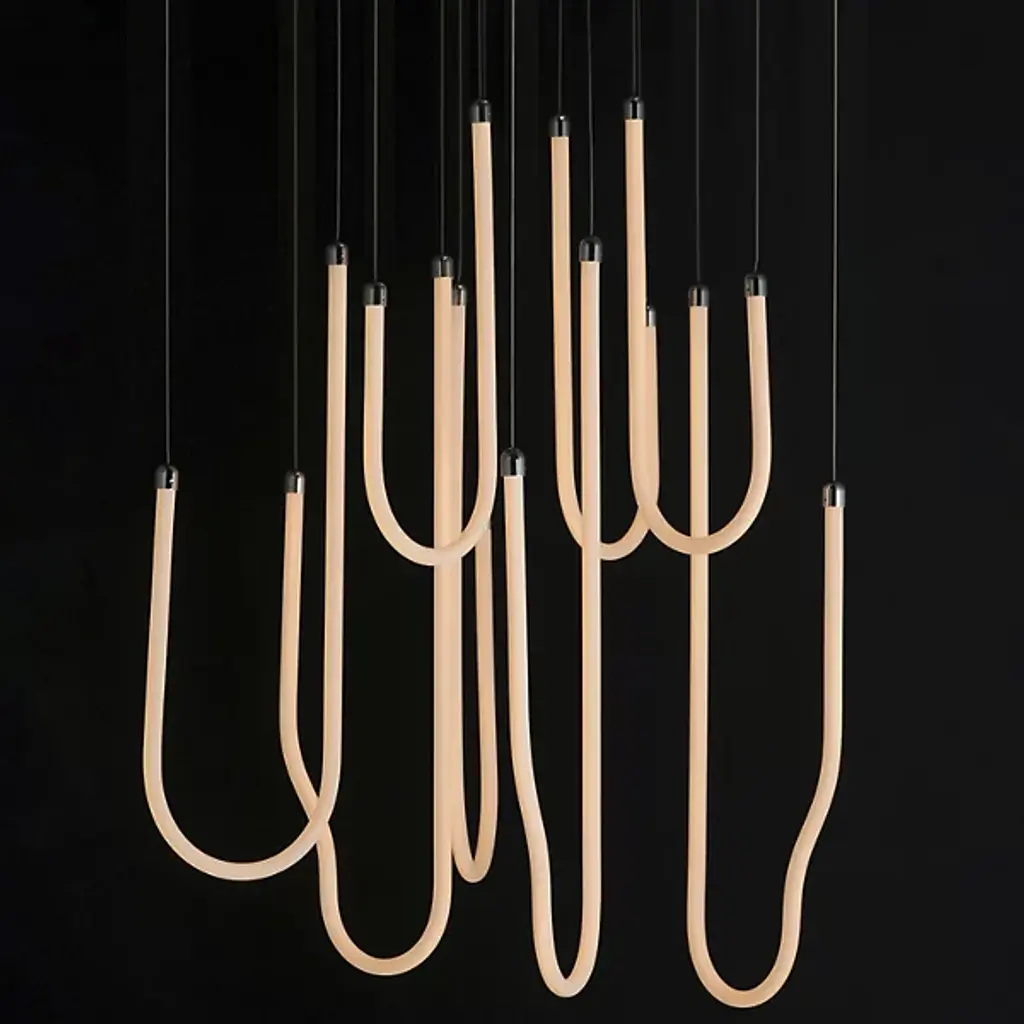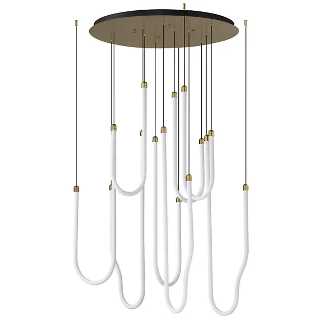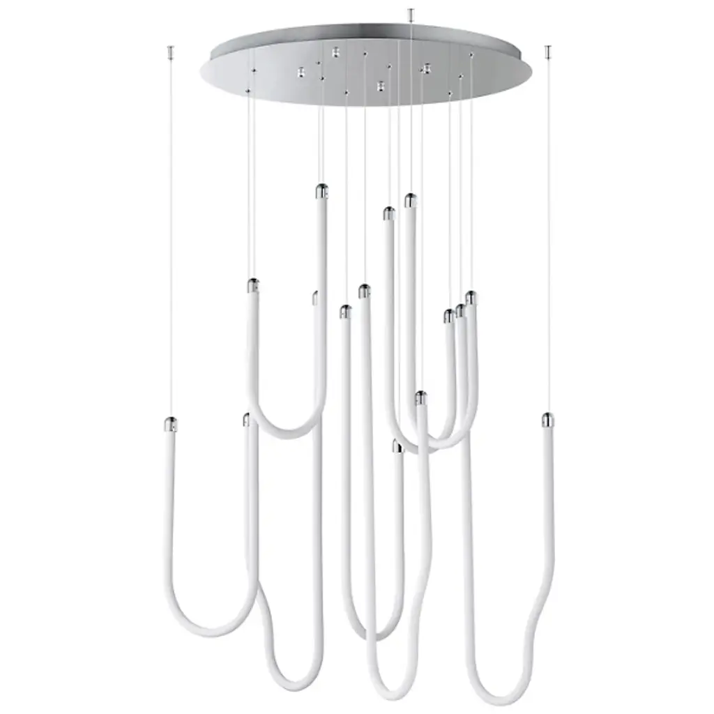 The Soleil LED Chandelier from ET2 Lighting captures the fluid movement of solar flares with its curved acrylic tubes. Light shines from within each tube, creating a gentle glow throughout your space. The flowing forms bring a sense of motion that contrasts nicely with more static elements in a room. This chandelier adds interest to dining areas and living rooms without being too dramatic or imposing. Despite its artistic presence, the design maintains a clean look that fits well in various interior styles.